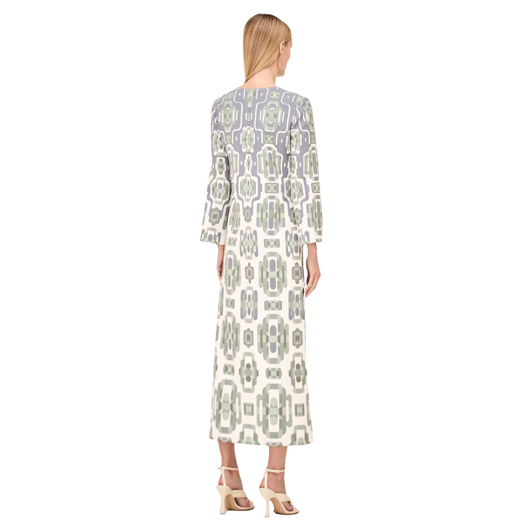 The Larissa Dress is a long-sleeve midi dress featuring a geometric print, a straight silhouette, and side slit detailing.