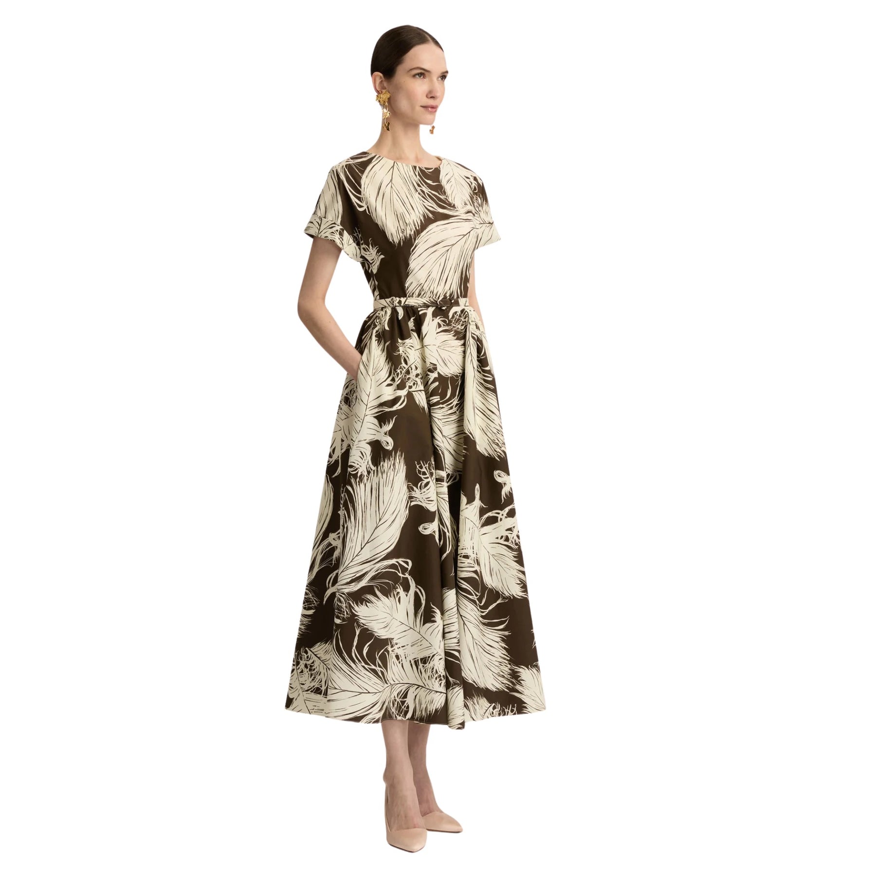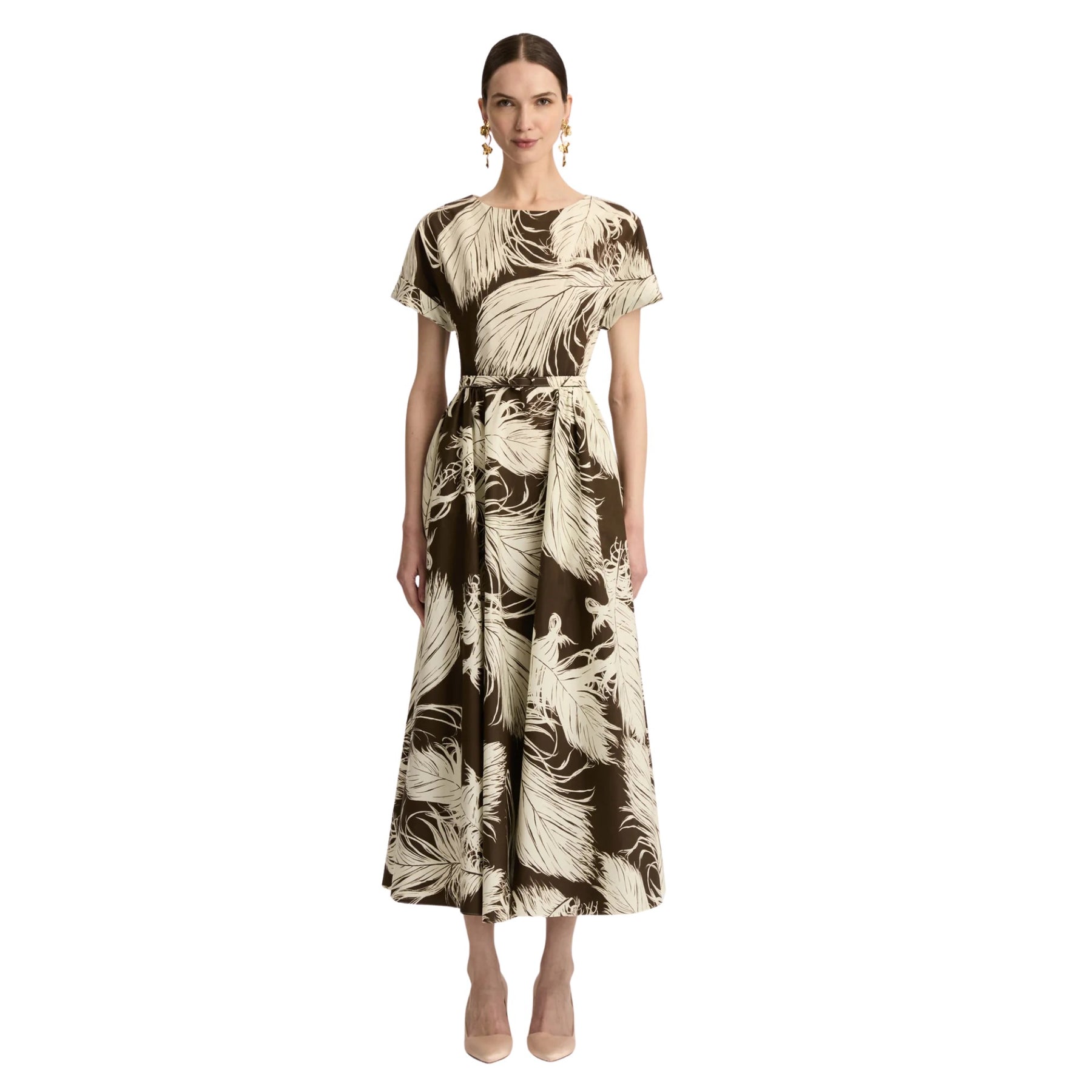 The Short Sleeve All Over Feathers Poplin Dress blends refined structure with effortless movement. Crafted in Italy from crisp cotton poplin, it features a striking all-over feather motif in bold contrast. The design’s clean lines are enhanced by a jewel neckline and short sleeves, while a coordinating buckle belt defines the waist before releasing into a fluid, full skirt. Side seam pockets add functionality to this polished yet easy silhouette.
