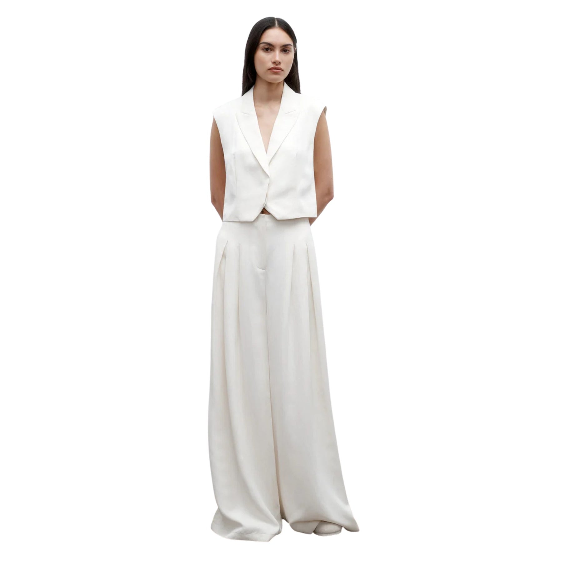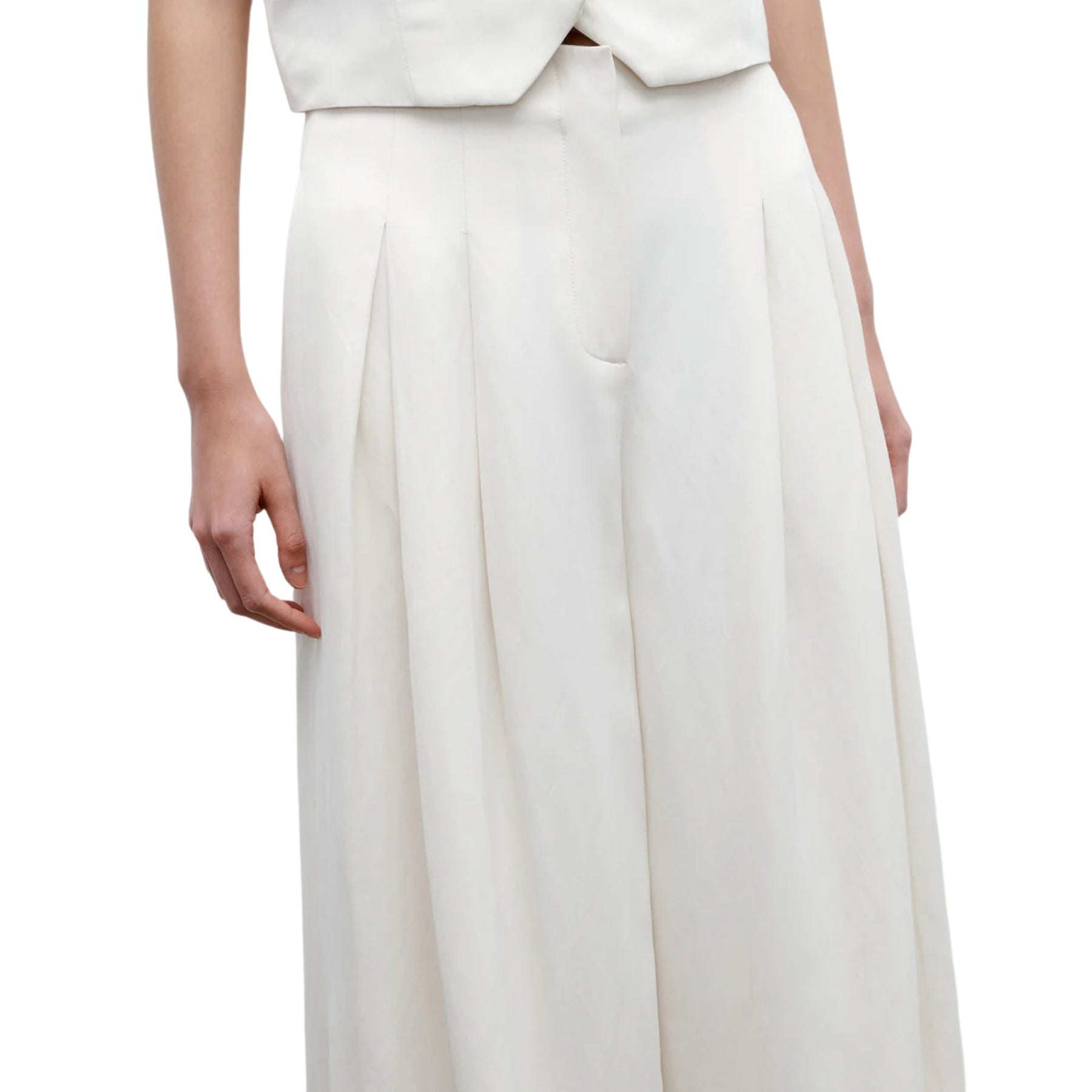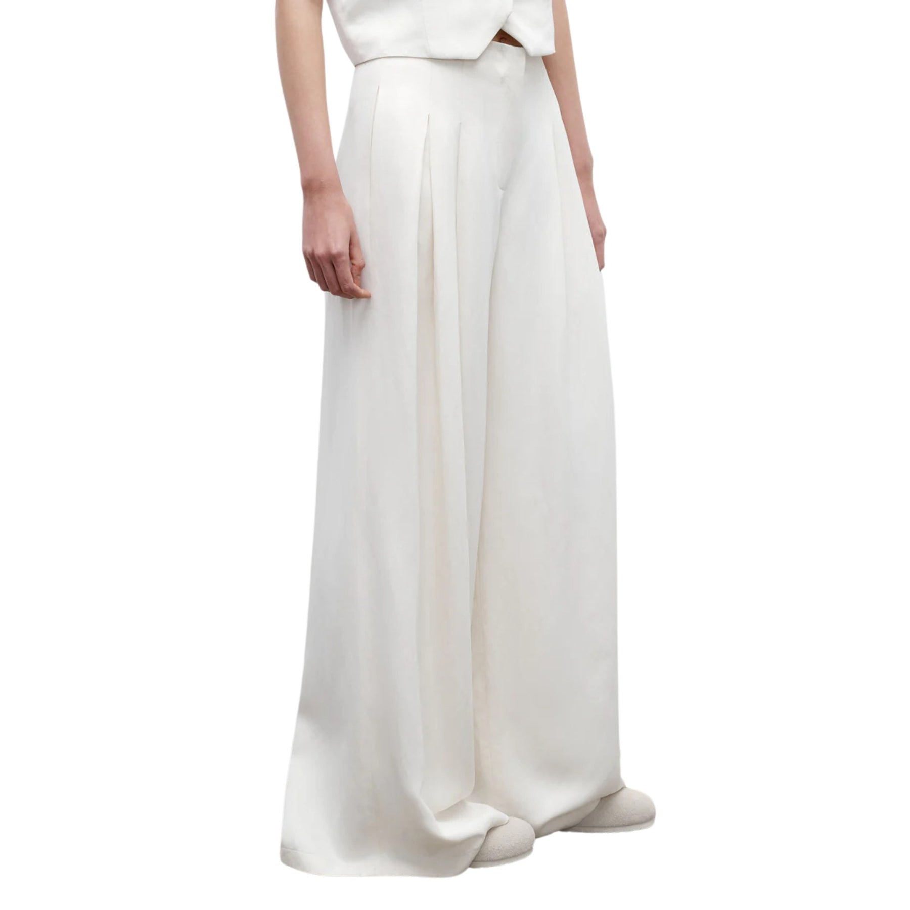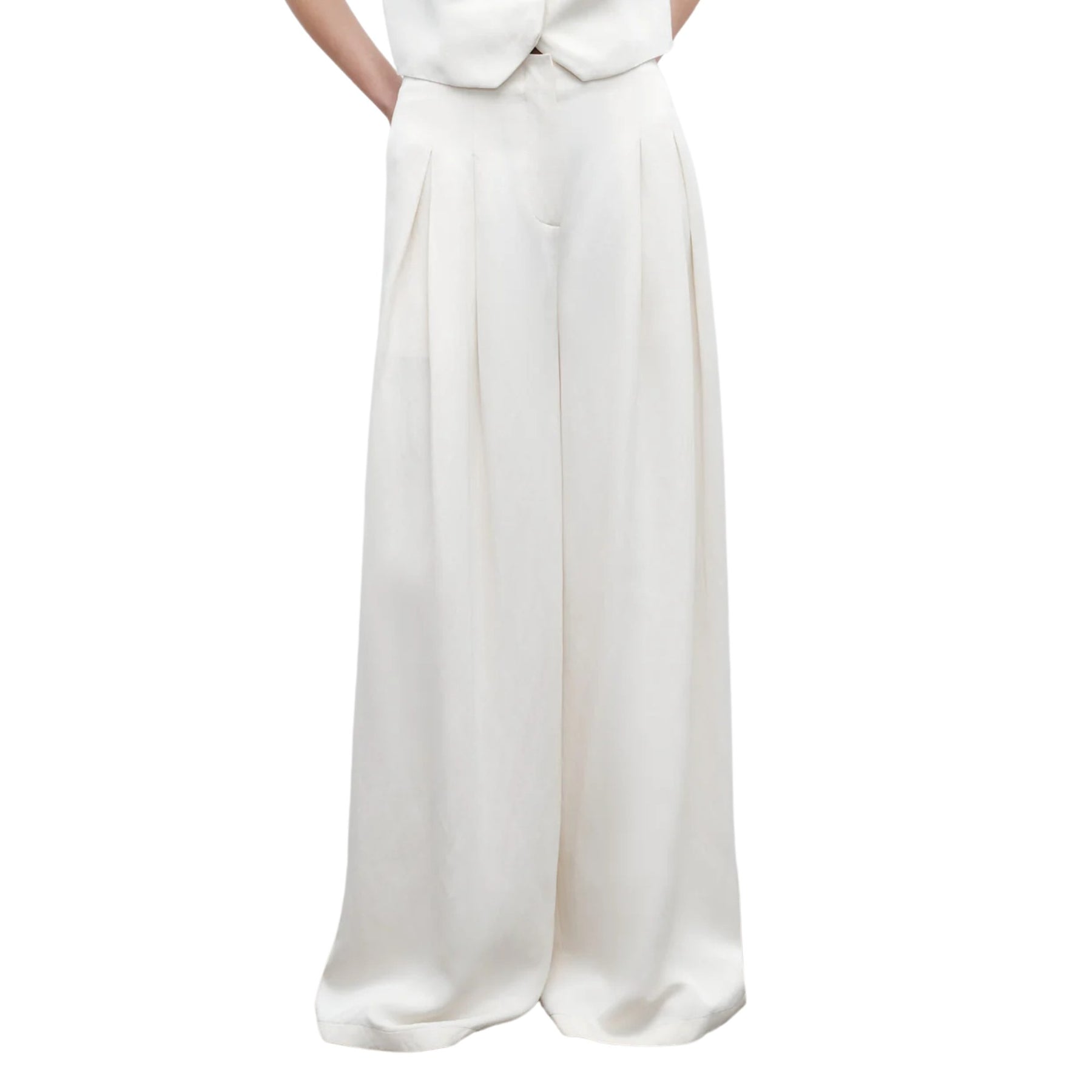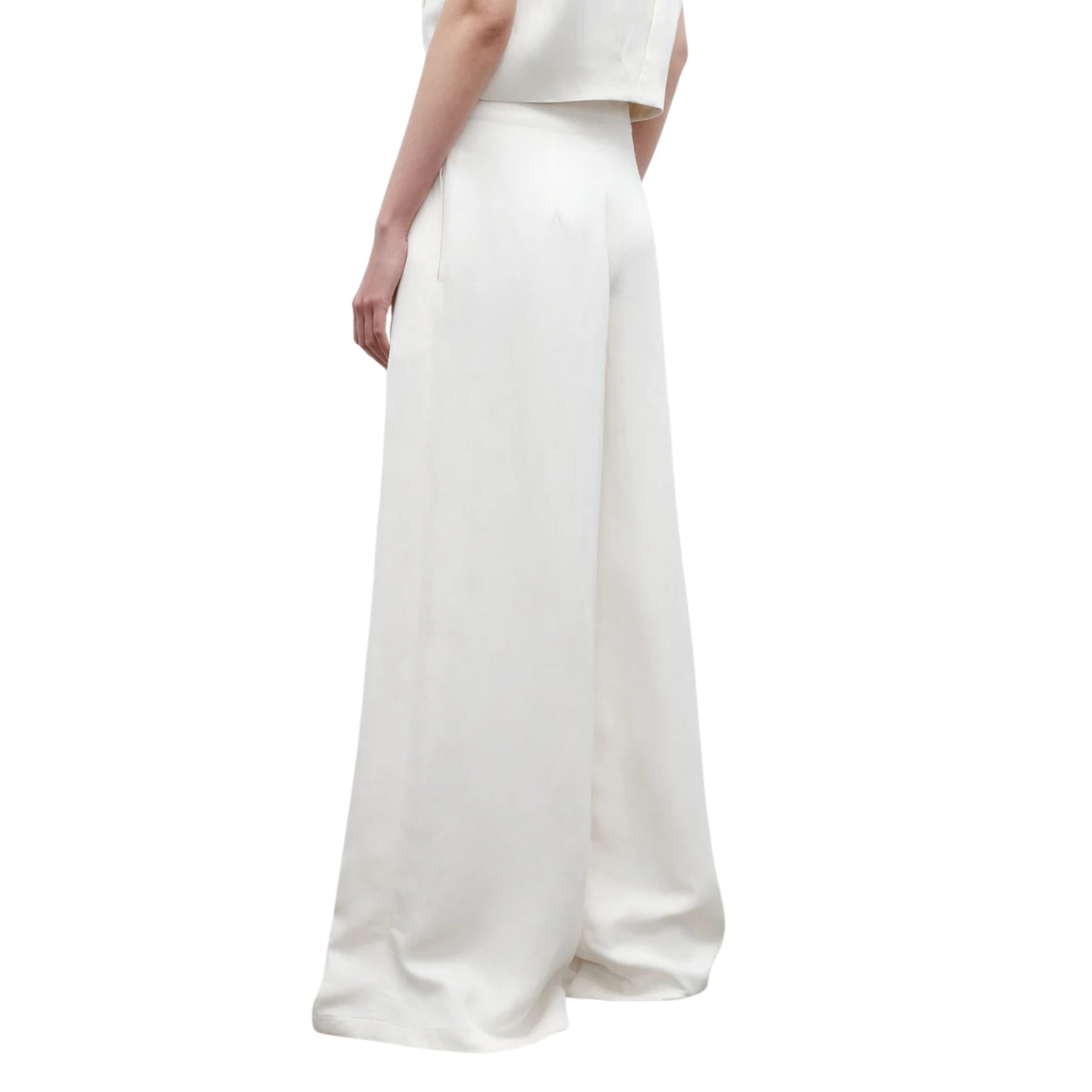 The Drew Pant is a high-rise, wide-leg dress pant designed to move with you from daytime polish to evening elegance. Cut from a premium coated viscose–linen blend, these ivory trousers offer a fluid, floor-grazing silhouette with a subtle satiny sheen. Deep pleats through the leg create beautiful drape and elongate the figure, while the tailored waistband sits high for a flattering, waist-defining fit. Perfect for modern suiting, special occasions, or elevated everyday style.