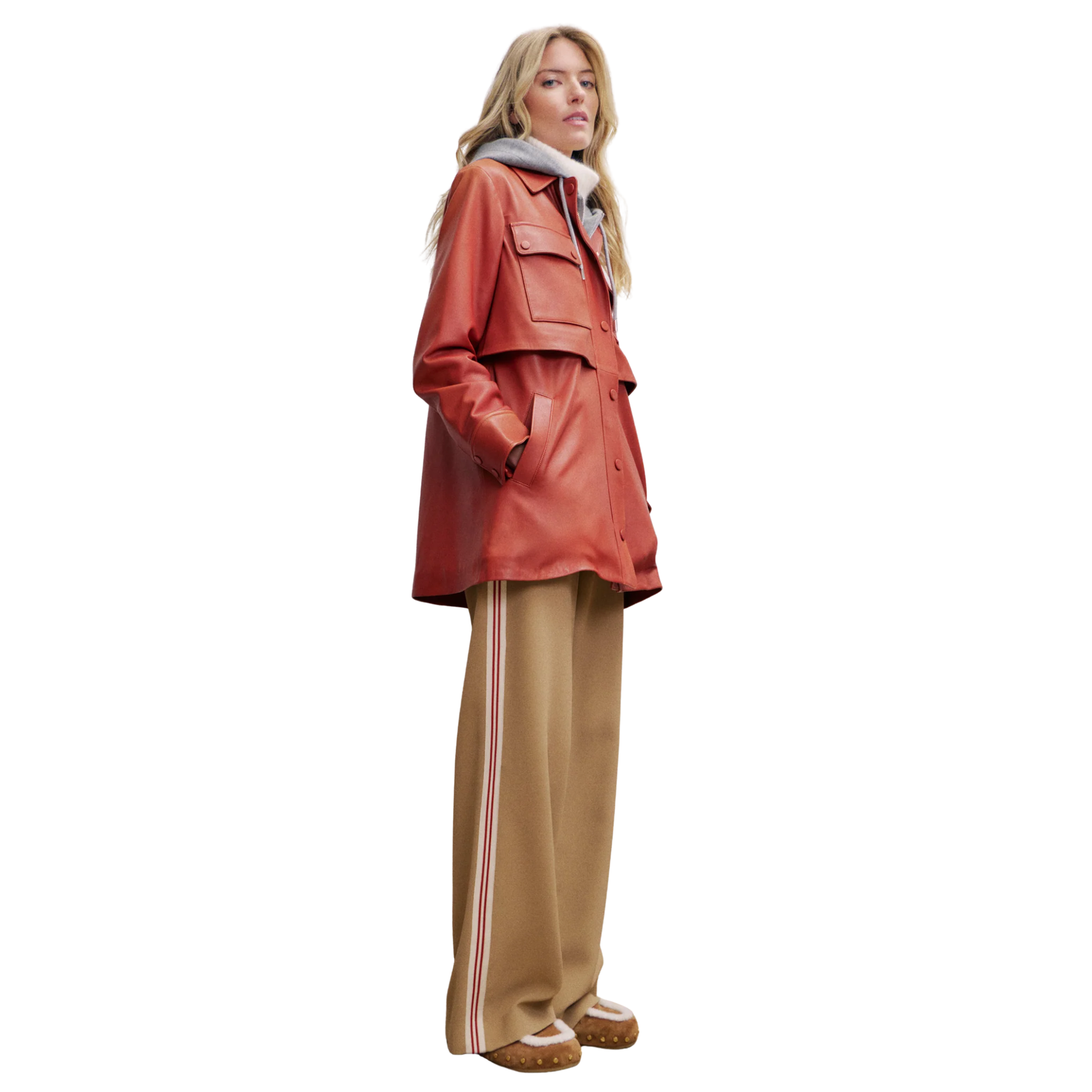 Part trouser, part track pant. Cut from premium stretch crepe in khaki, the Eugene features a high-rise, wide-leg silhouette, defined by white sporty side stripes and a boxer double waistband detail. Angled side pockets and a flat hook-and-bar closure complete the look. A refined take on a casual classic, dress it up with a blazer or style with a simple knit to elevate the everyday.