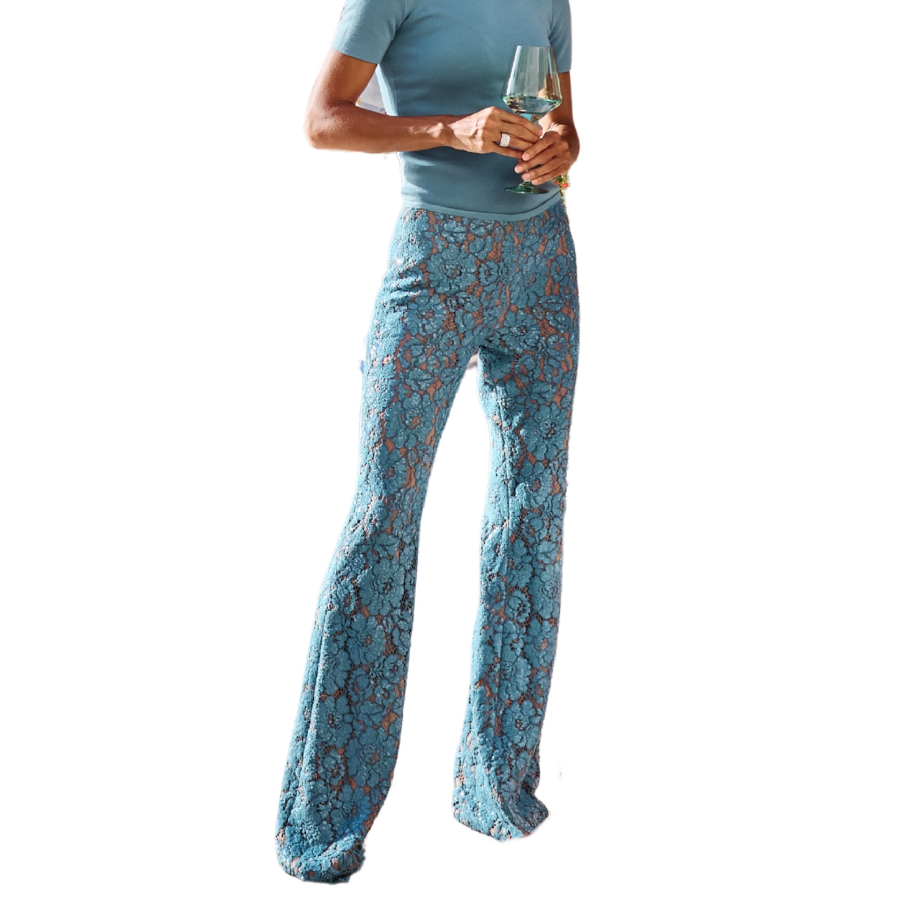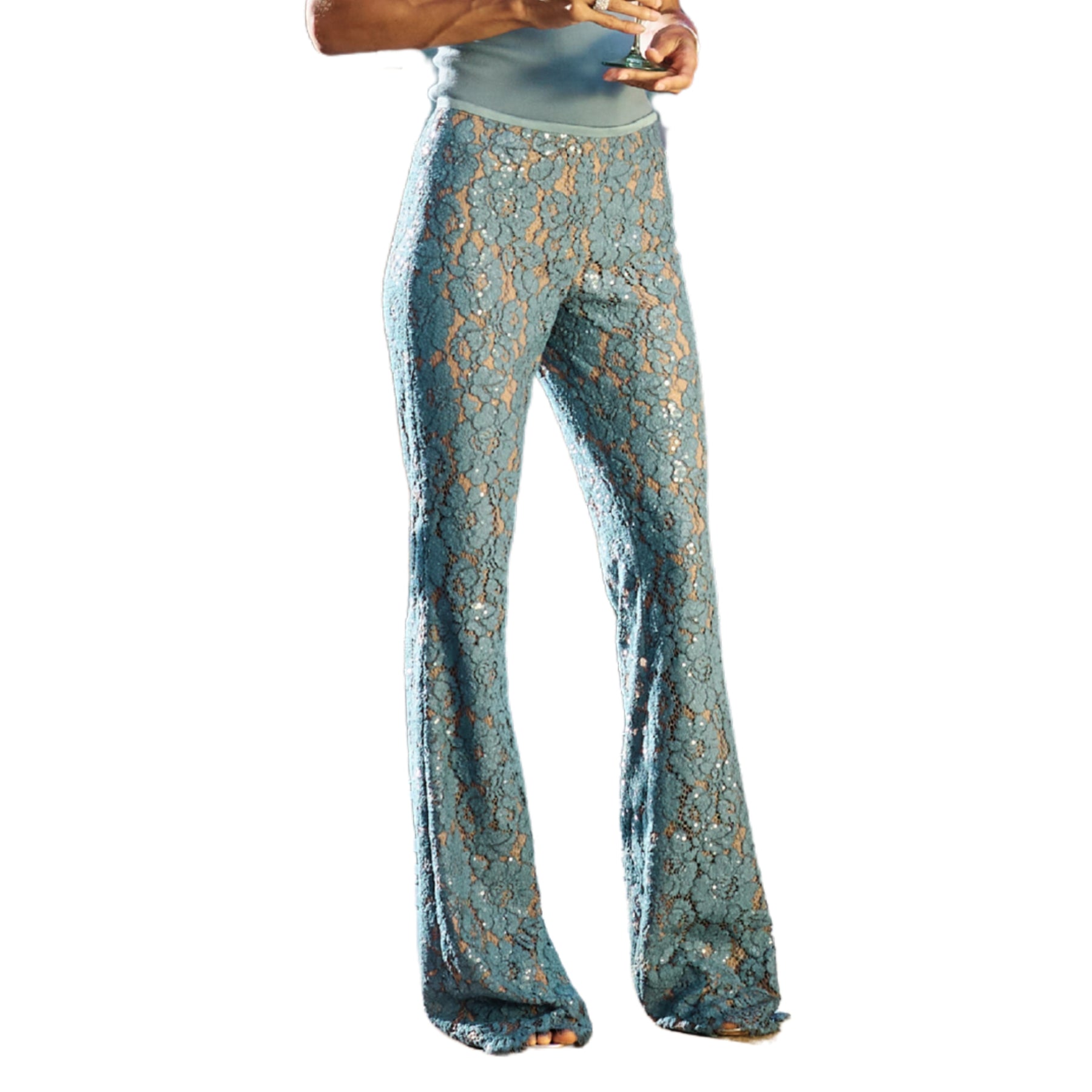 Rendered in an exquisite sea glass blue lace embroidered with tonal sequins, these Michael Kors Collection pants capture the brand’s signature balance of glamour and polish. The bootleg silhouette elongates the leg while creating fluid movement with every step. A nude lining enhances the intricate floral lace, offering a subtle play of texture and light.