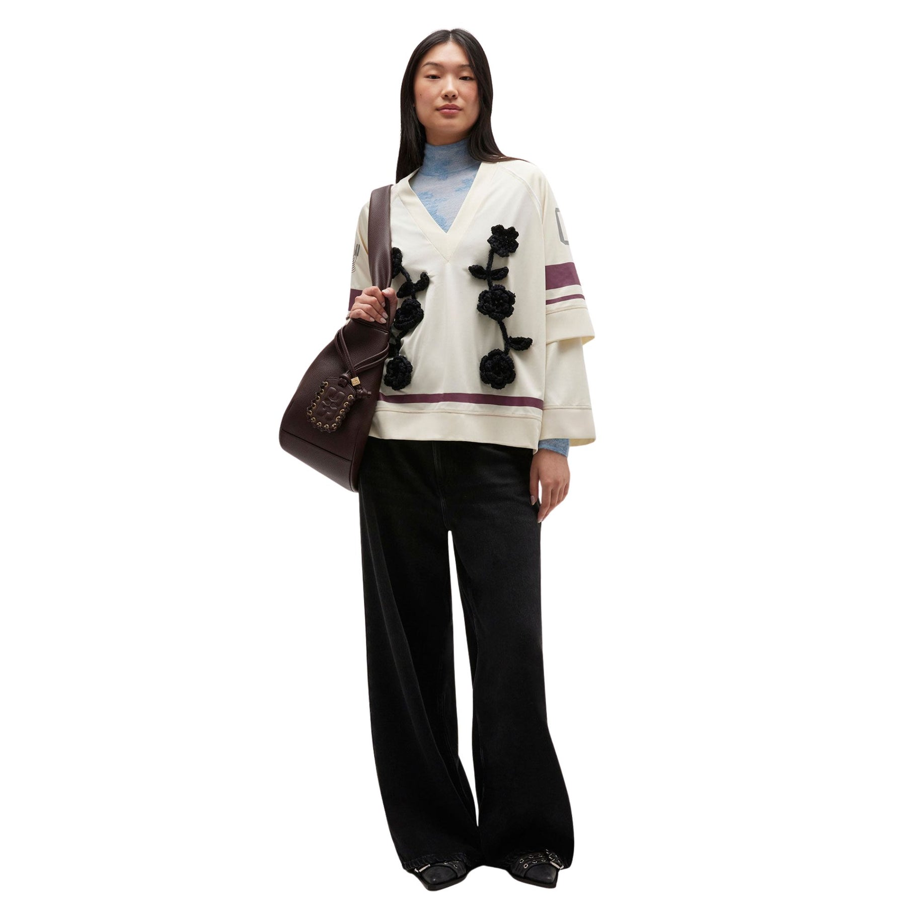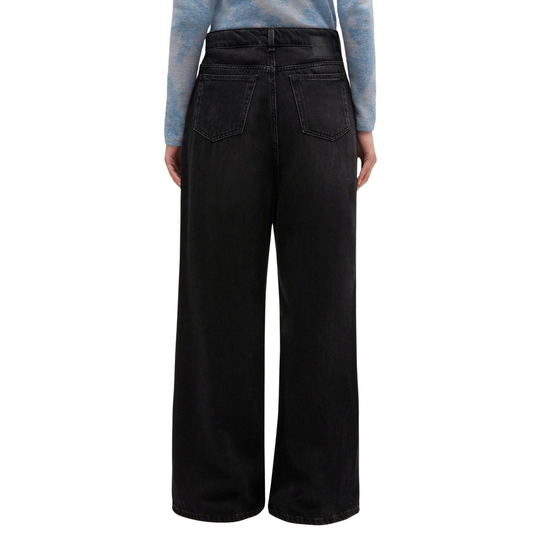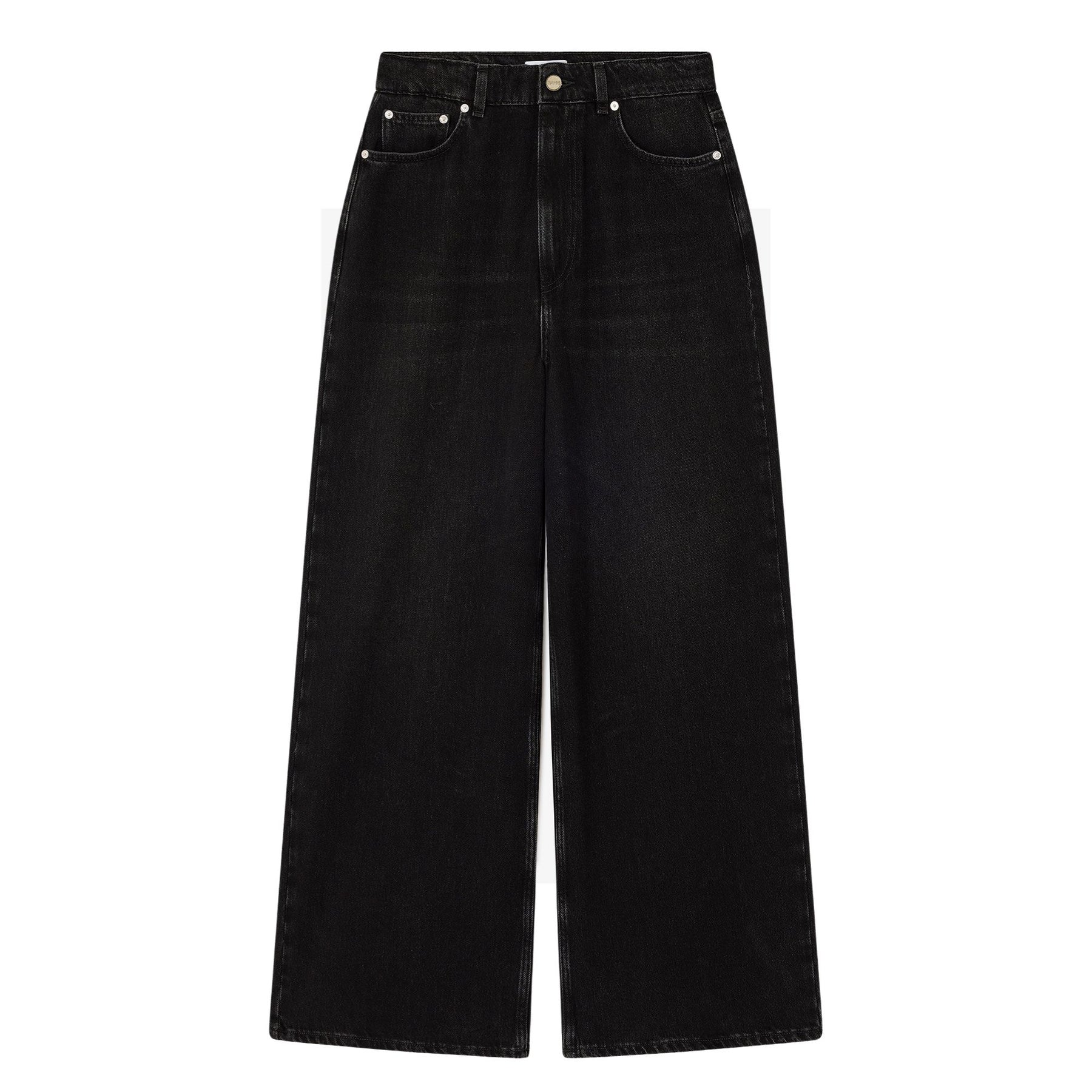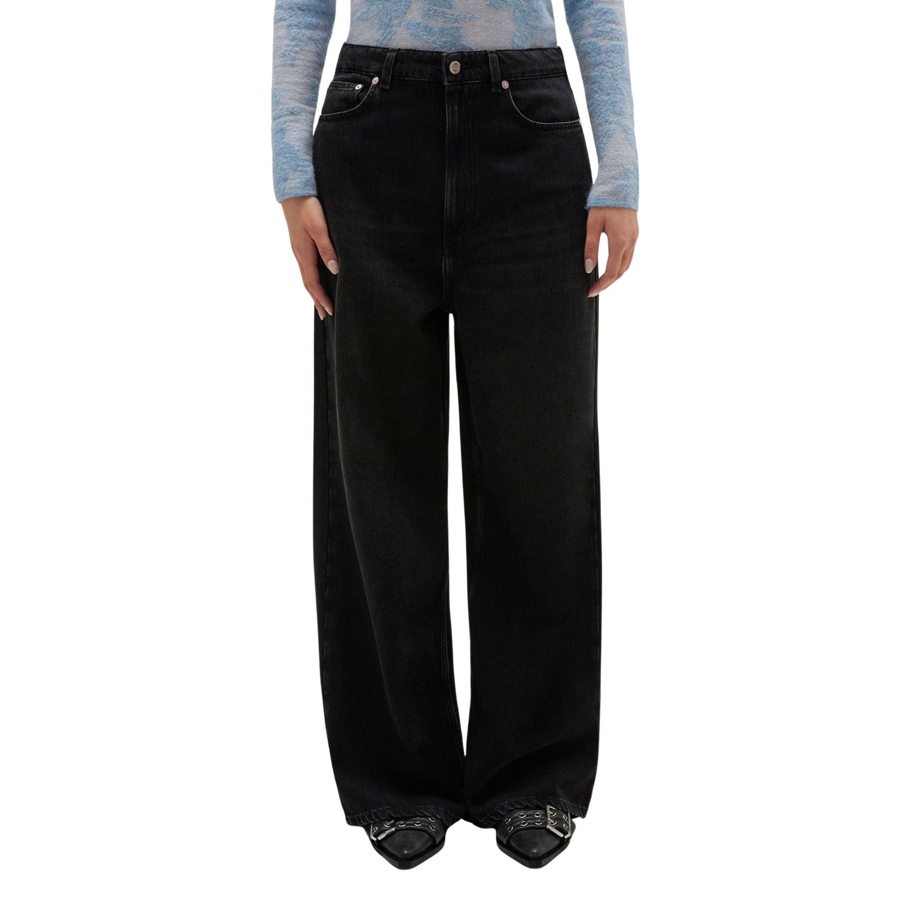 These jeans in black washed denim feature a zip and button closure, 5 pockets, belt loops and a GANNI logo at the back pocket.