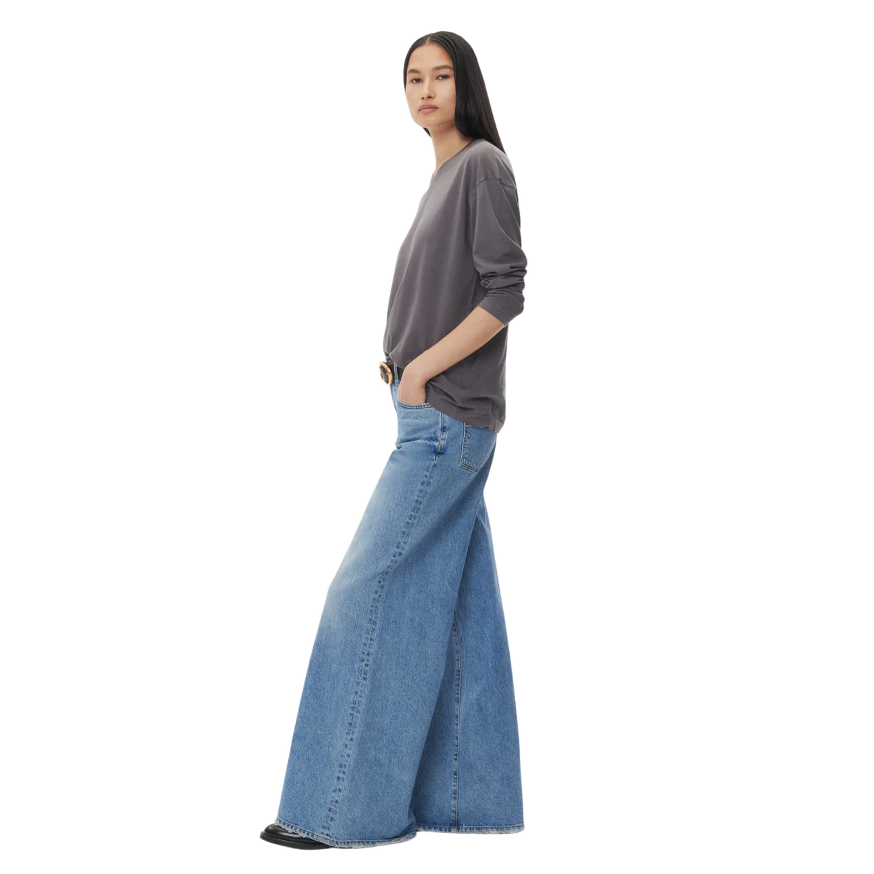 A mid-rise, wide-leg jean crafted from TWP’s signature vintage-inspired washed denim, proudly made in Los Angeles. The Tiny Dancer offers a relaxed fit through the hips and a flattering flare through the leg. Designed in a classic five-pocket silhouette, it’s finished with nail-head rivet detailing, a zip fly, belt loops, and a shank button at the waistband. If you're between sizes, we recommend sizing down.