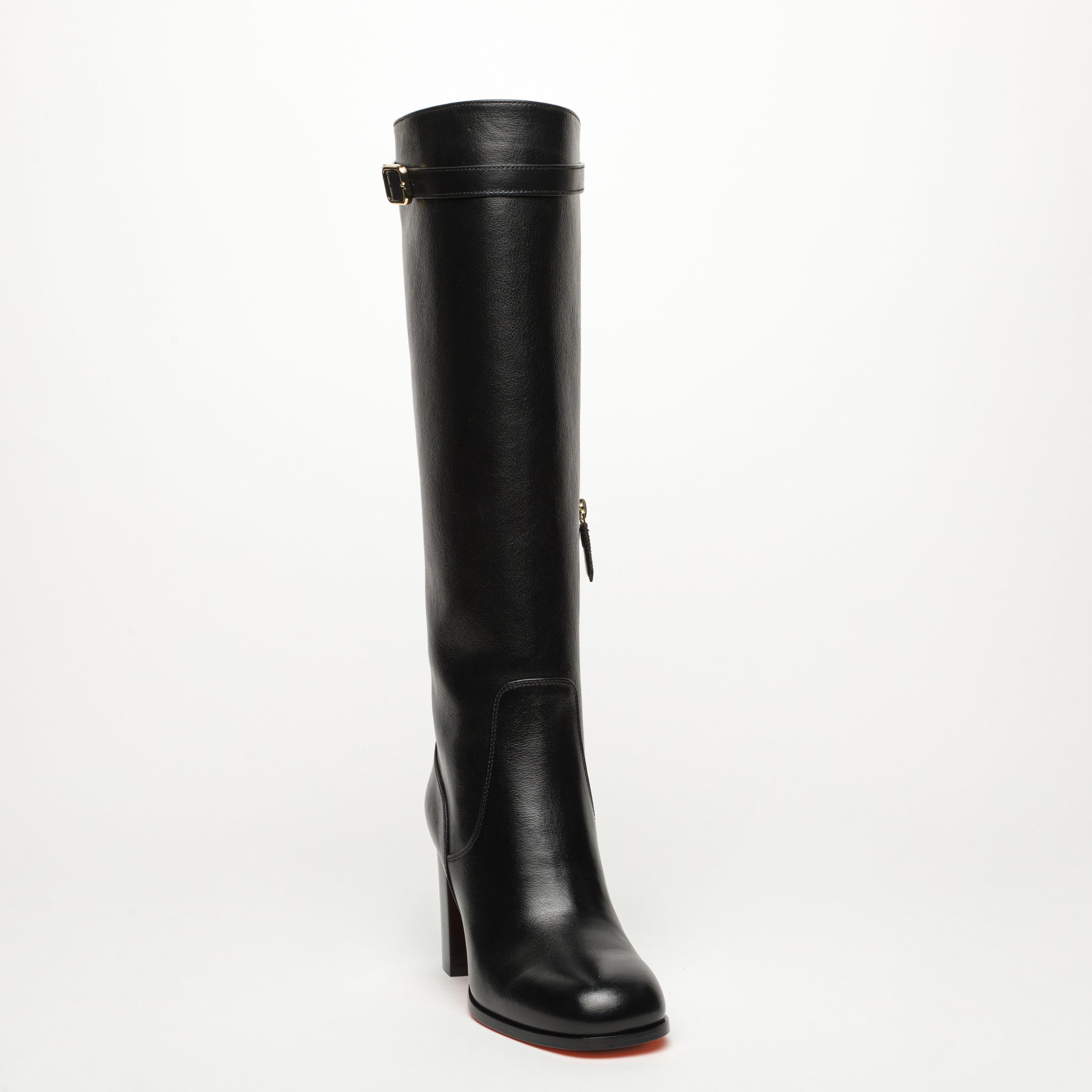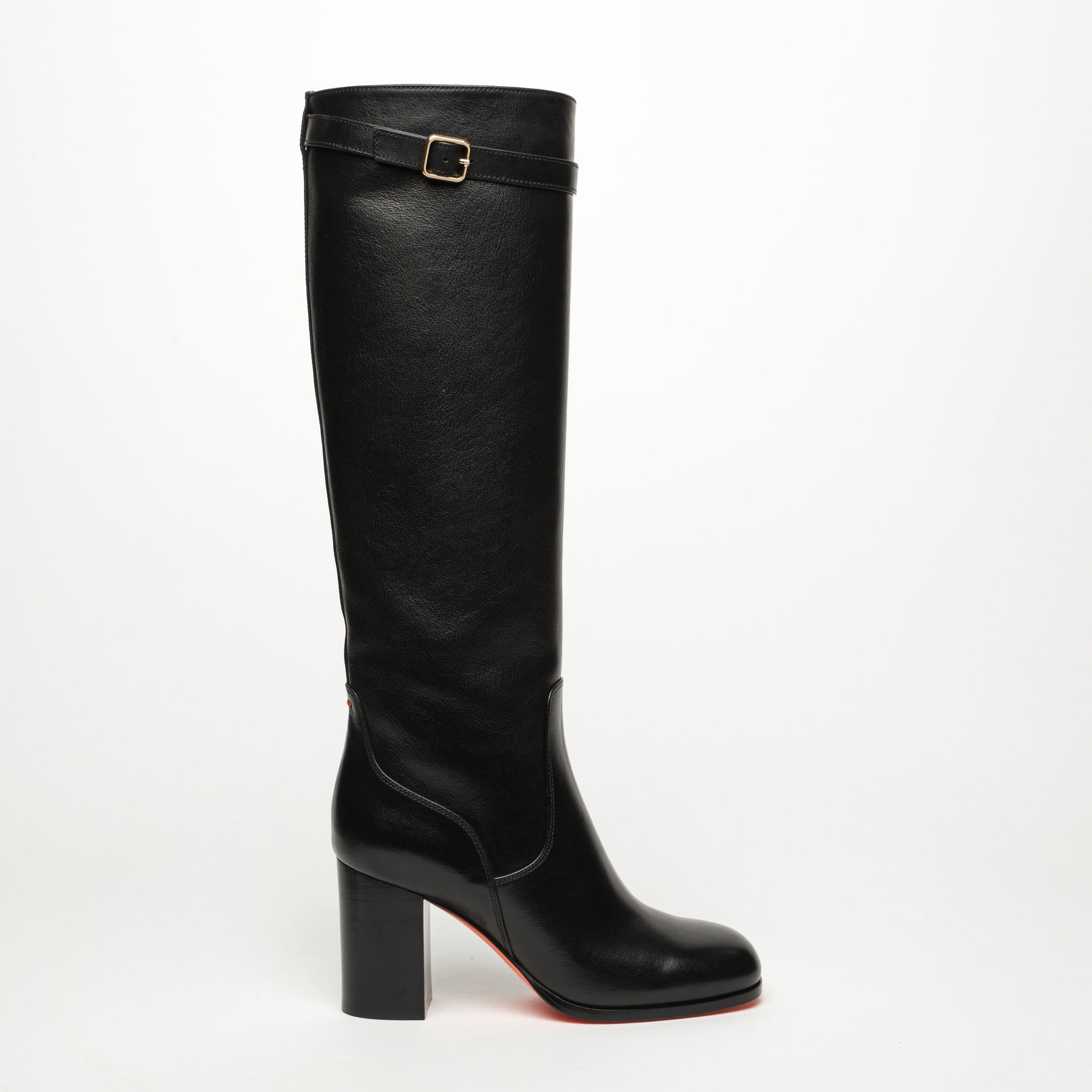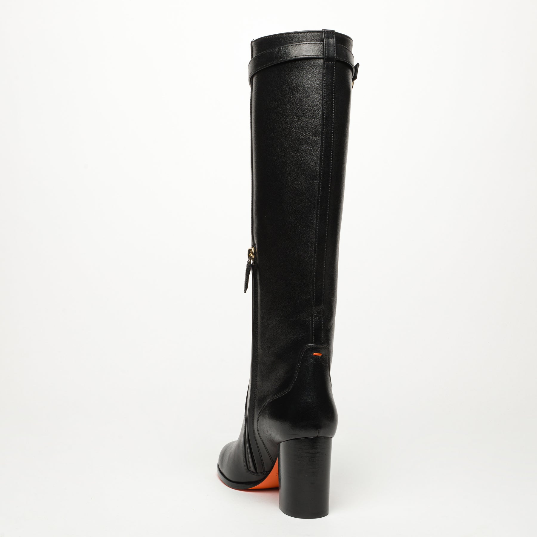 Tube boot in black leather with side buckle detail. Covered chunky heel, h 8,5 cm.