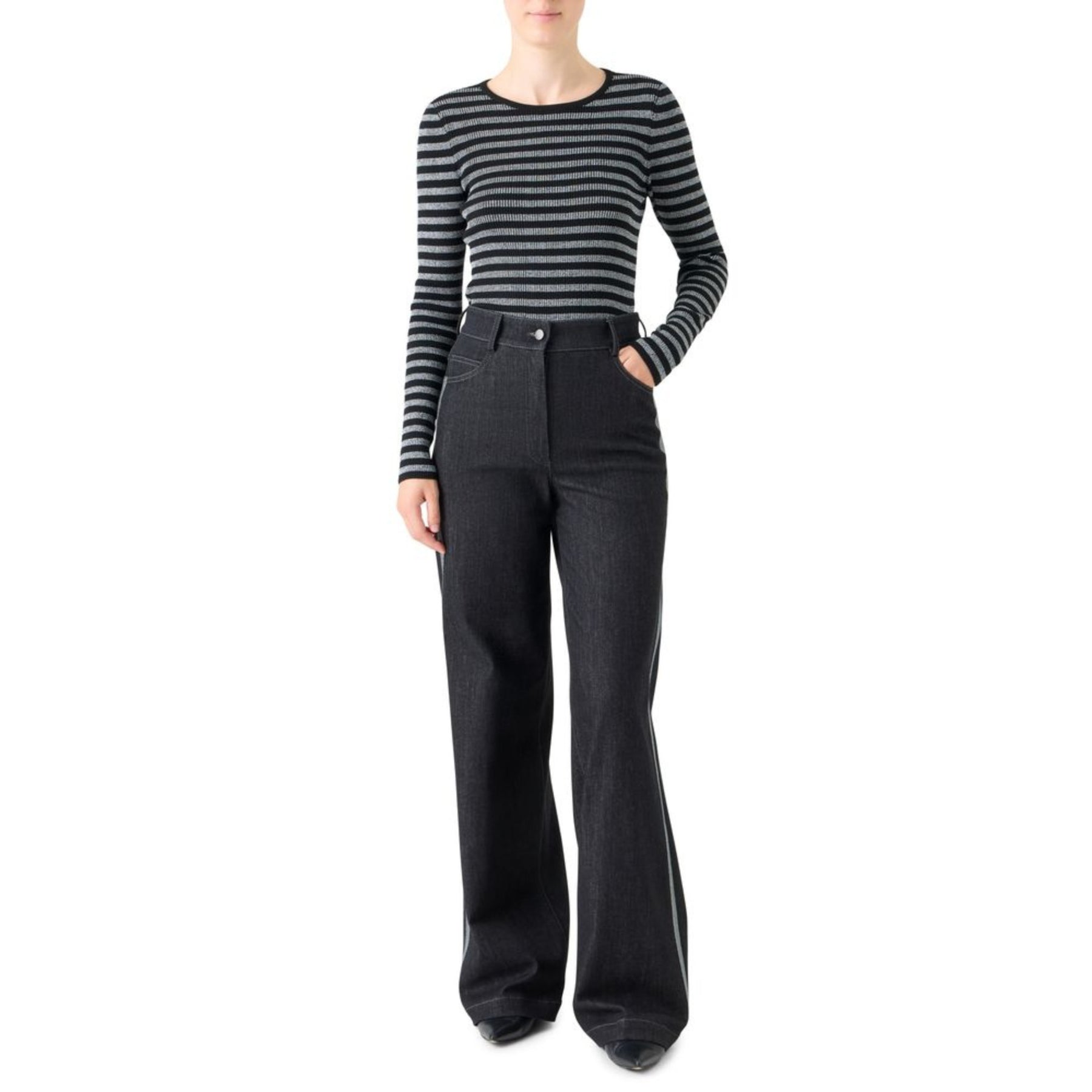 The Striped Knit Pullover in Charcoal and Heather Gray from our Everyday Luxe Collection offers effortless sophistication with a touch of modern edge. Crafted from a fine rib-knit fabric, this pullover combines comfort, versatility, and timeless appeal. The horizontal stripe pattern adds subtle texture and visual interest, while the fitted silhouette flatters the figure. Perfect for layering or wearing solo, this essential piece transitions seamlessly from casual days to polished evenings.