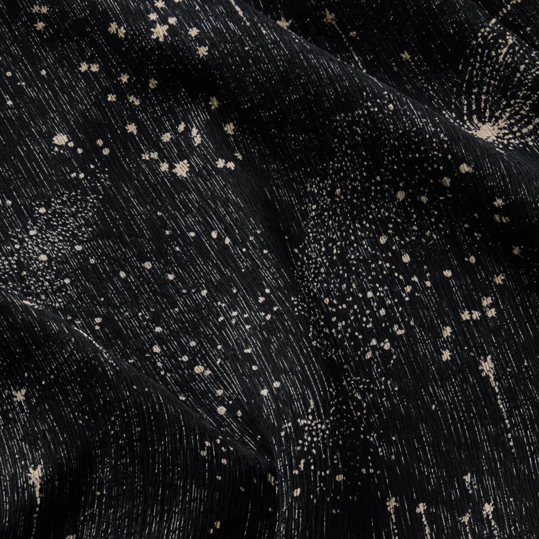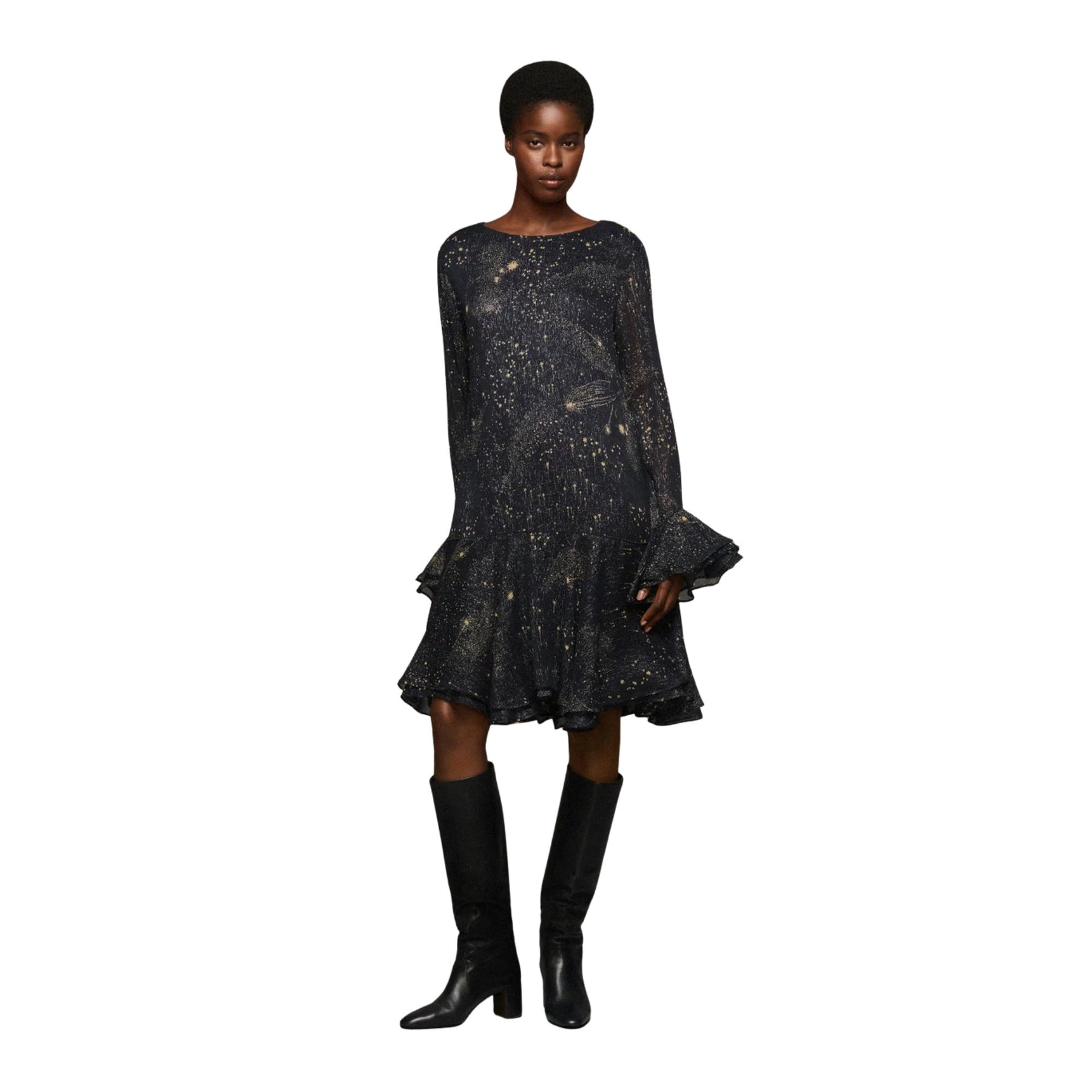 The A-Line Ruffle Dress embodies effortless elegance with its ethereal movement and luminous finish. Printed with the Resort 2026 Cosmos artwork, this day-to-night piece is crafted from textured silk interwoven with gold foil yarns for a celestial shimmer. The flowy A-line silhouette features fluted cuffs and a double ruffled hem that floats gracefully above the knee.