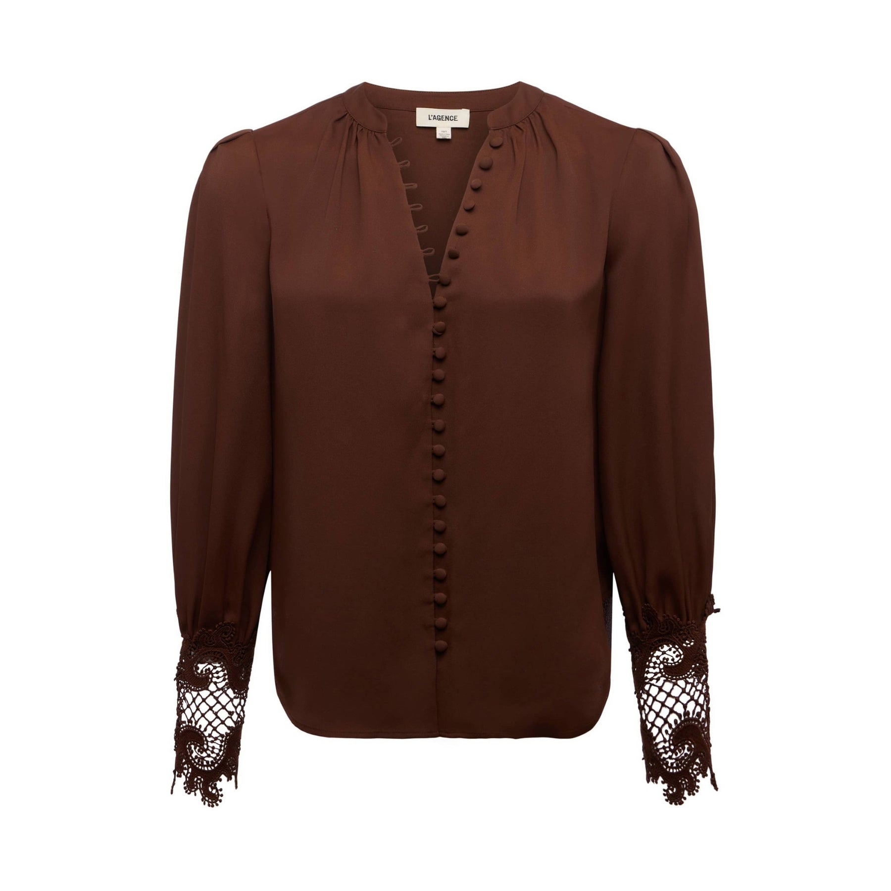 The Ava Lace Cuff Blouse in rich Hot Fudge Brown is a timeless L’AGENCE signature, blending vintage-inspired romance with modern sophistication. Designed with scalloped lace cuffs and a row of covered buttons, this blouse offers effortless elegance that works from day to evening.