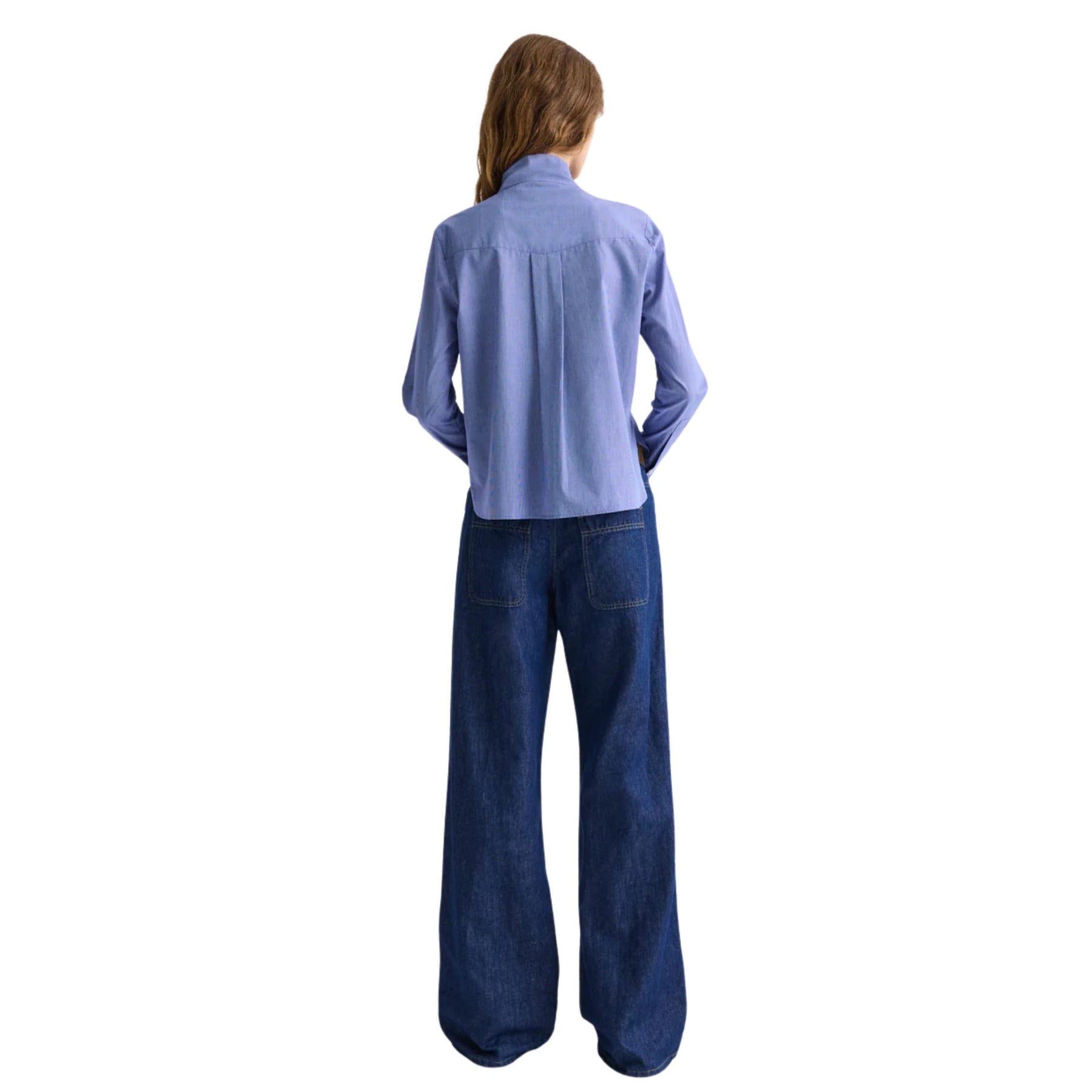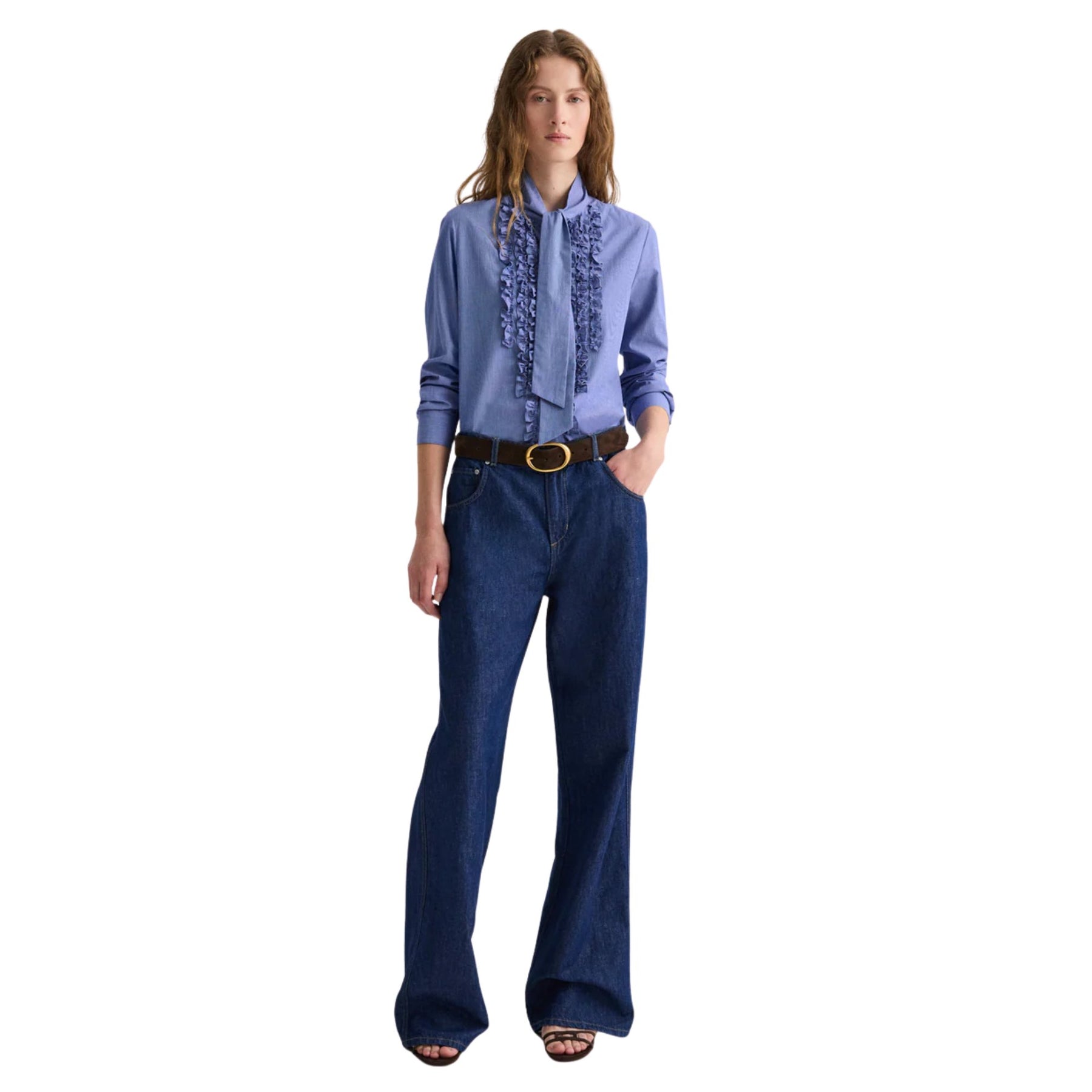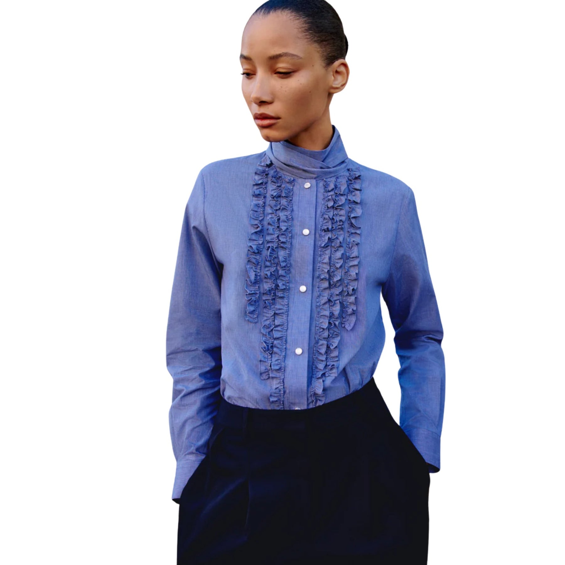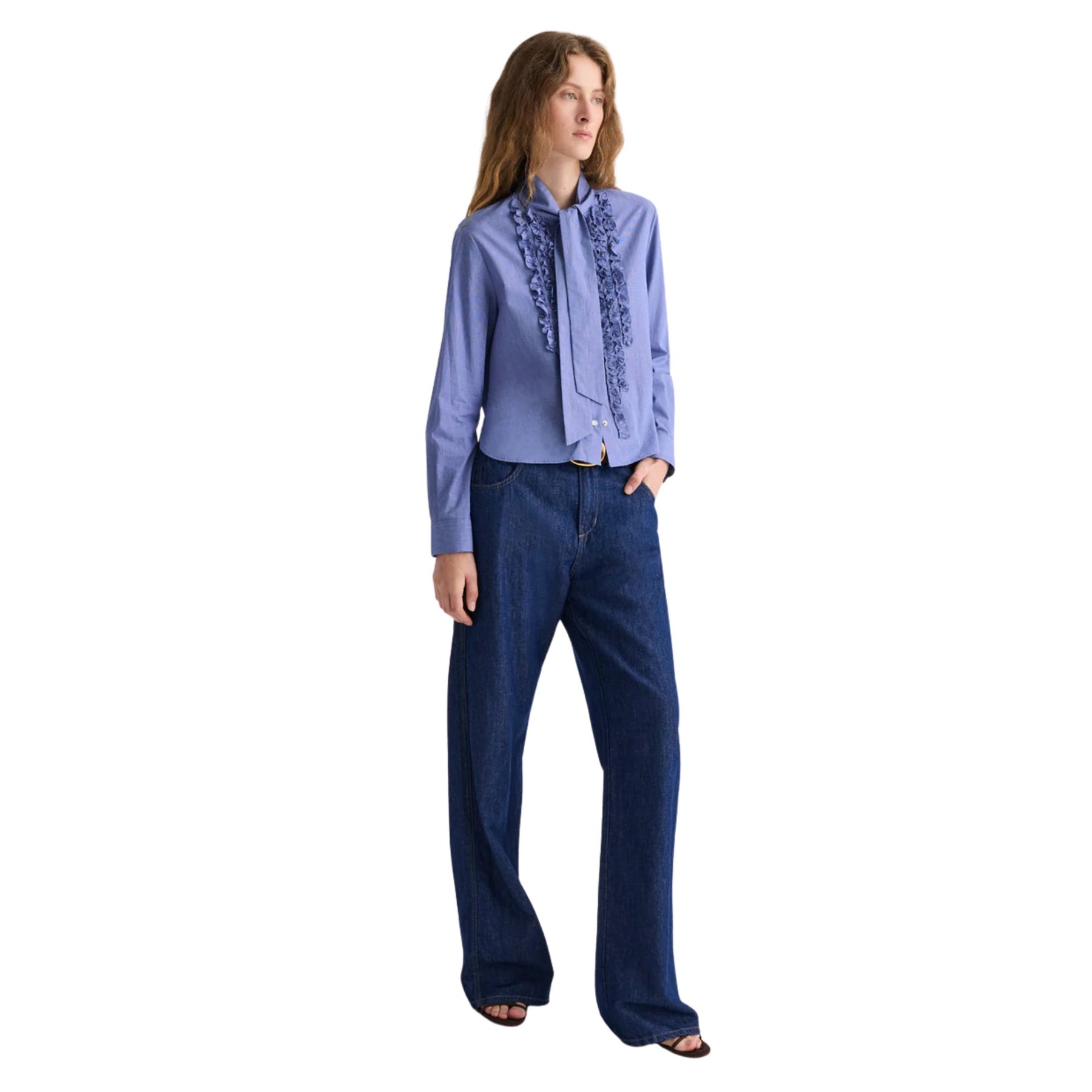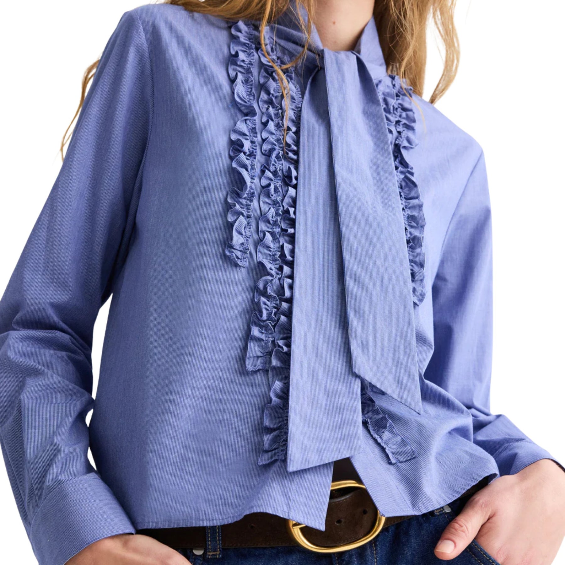 From the refined shirting edit, the Connor Shirt in White/Navy blends classic tailoring with feminine detailing. Crafted from Italian-made micro check poplin, this fitted shirt features an attached neck tie for a polished finish. Delicate ruffle detailing along the placket and collar adds softness to the structured silhouette, while long sleeves with button cuffs and a curved hem complete the design. Produced by a 150-year heritage shirting mill, this piece offers timeless elegance with modern refinement.