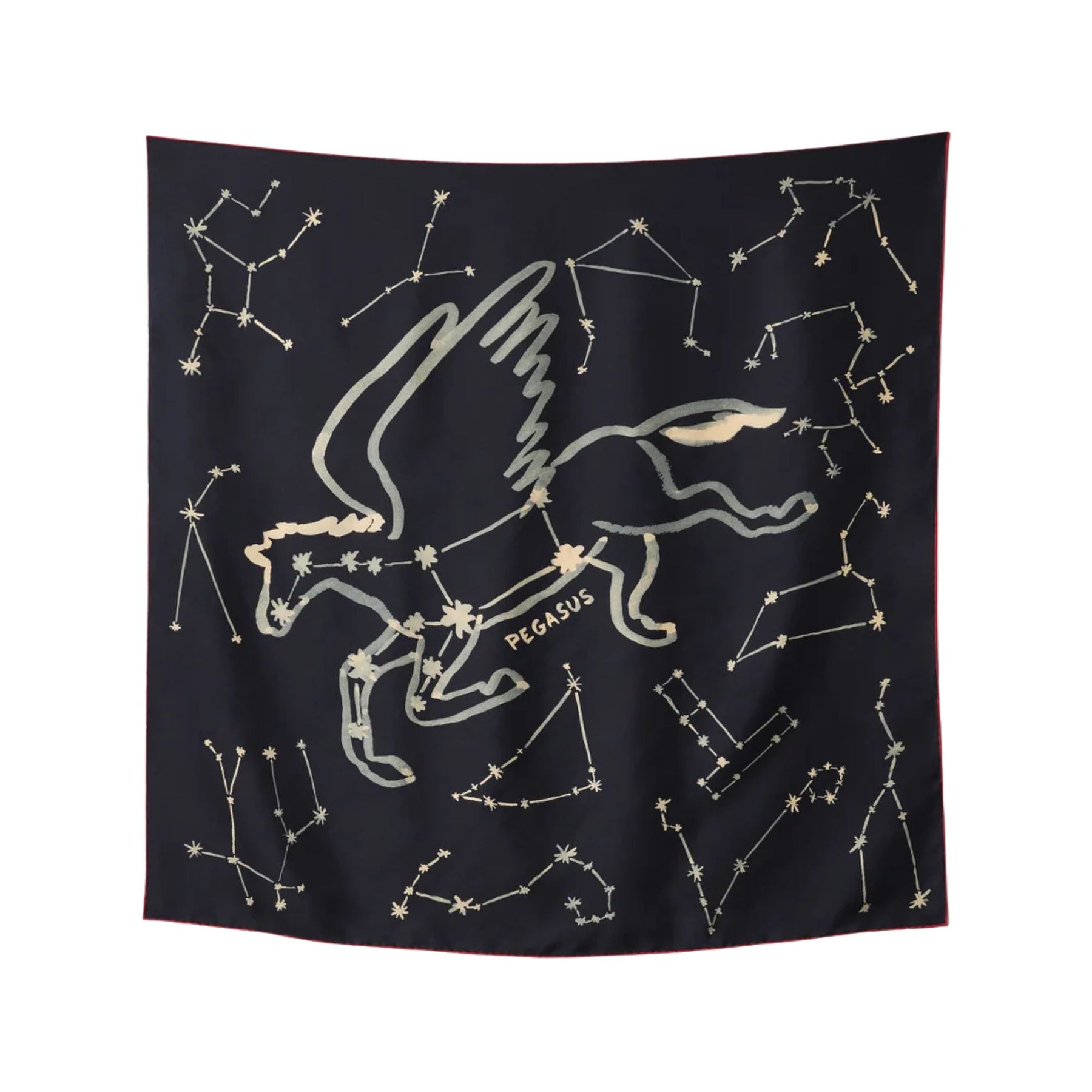 The Constellation Silk Printed Scarf showcases celestial artistry through the Resort 2026 Constellation print, depicting the mythical Pegasus surrounded by constellations. Crafted in Italy from pure silk twill, it features a lustrous sheen and fluid drape that elevate any ensemble. Finished with hand-rolled red edges, this square scarf is designed to fold, knot, or tie effortlessly, making it a timeless accessory of refined sophistication.