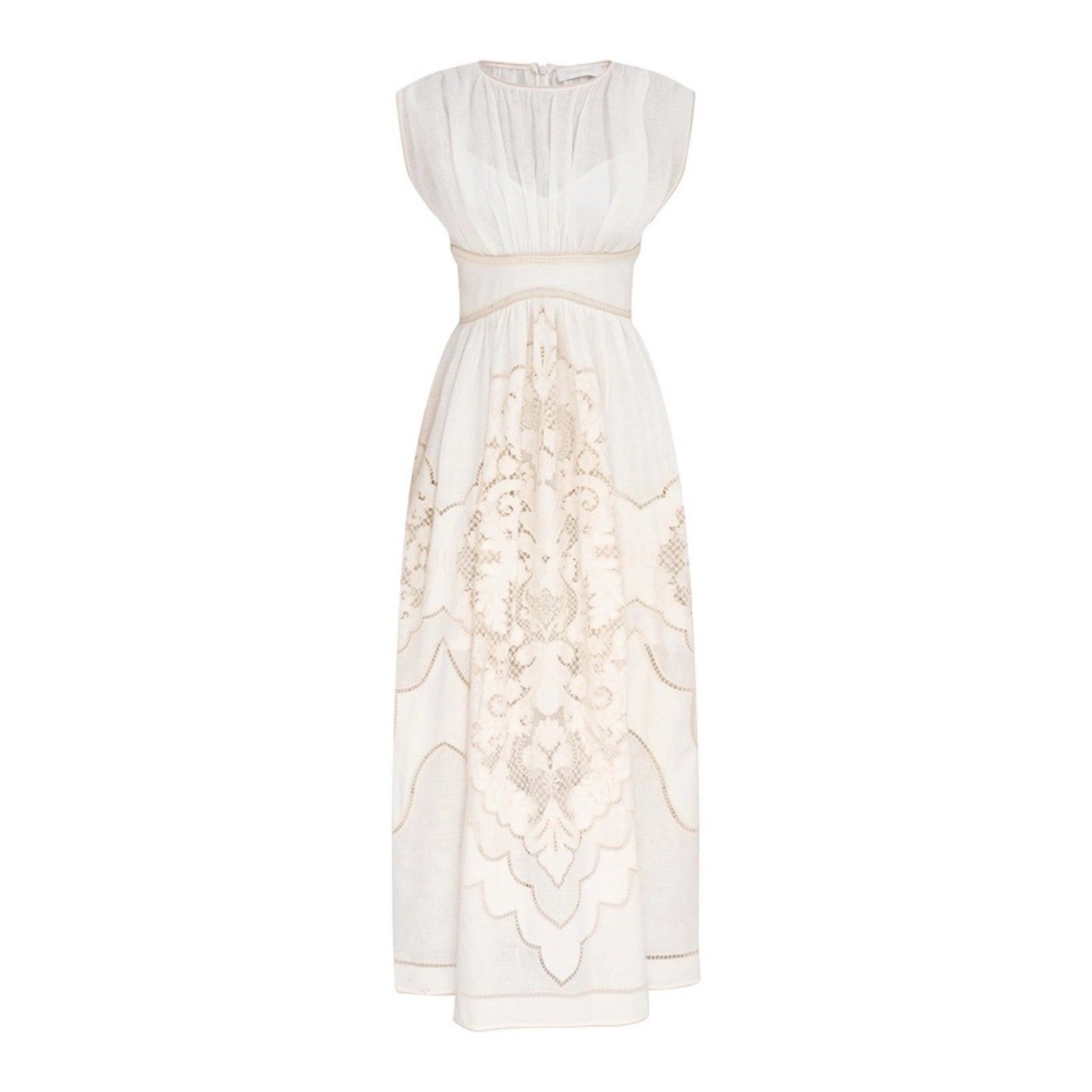 The Daylight Waisted Dress in Cream embodies effortless elegance and timeless femininity. Crafted from lightweight linen, this maxi dress from the Resort Swim 2026 Collection captures the essence of laid-back luxury. Its fitted waistband and gently gathered bodice create a flattering silhouette, while the intricate embroidery and cord trim detailing add an artisanal touch. Designed for warm days, relaxed evenings, or destination escapes, it’s a piece that moves gracefully between resort sophistication and everyday ease.