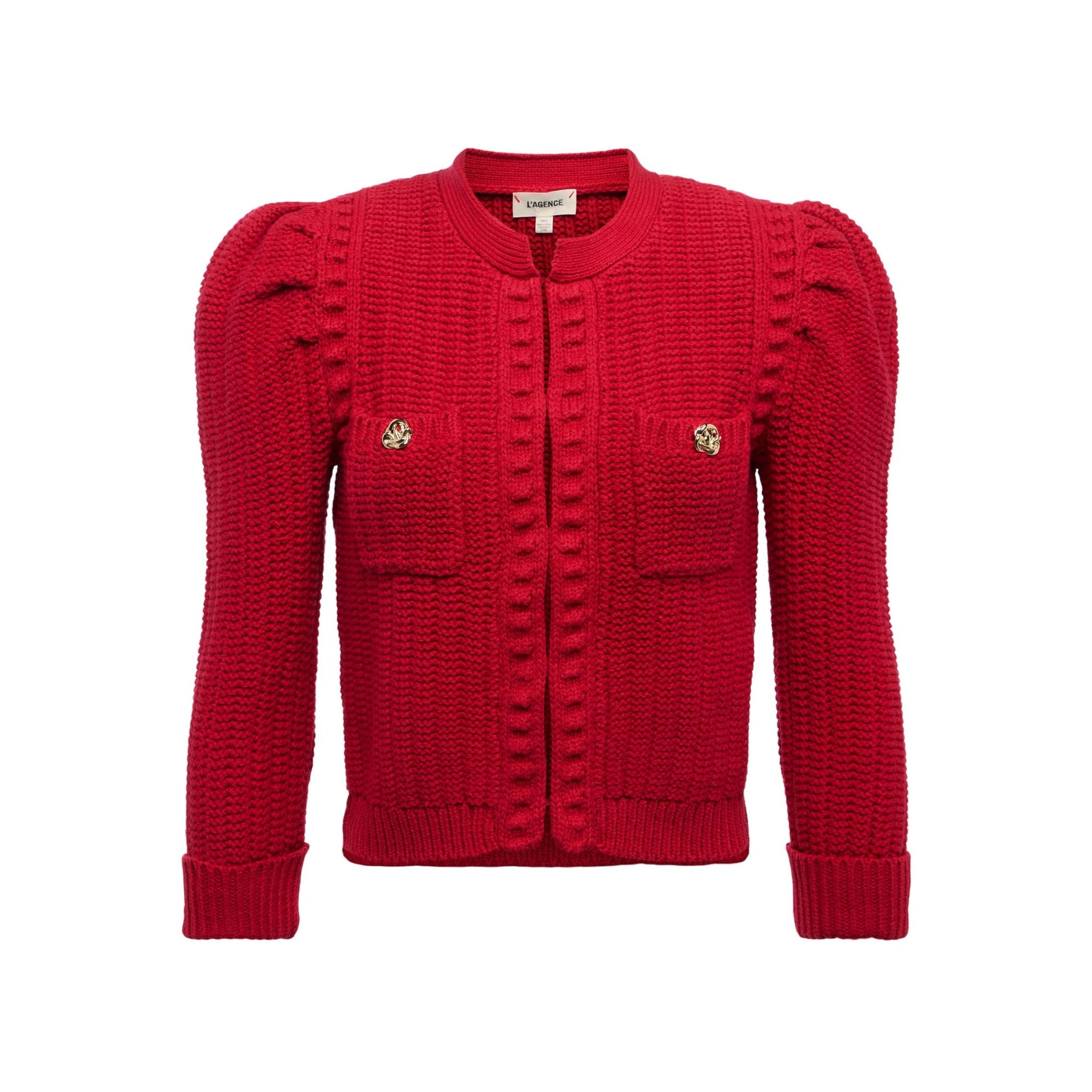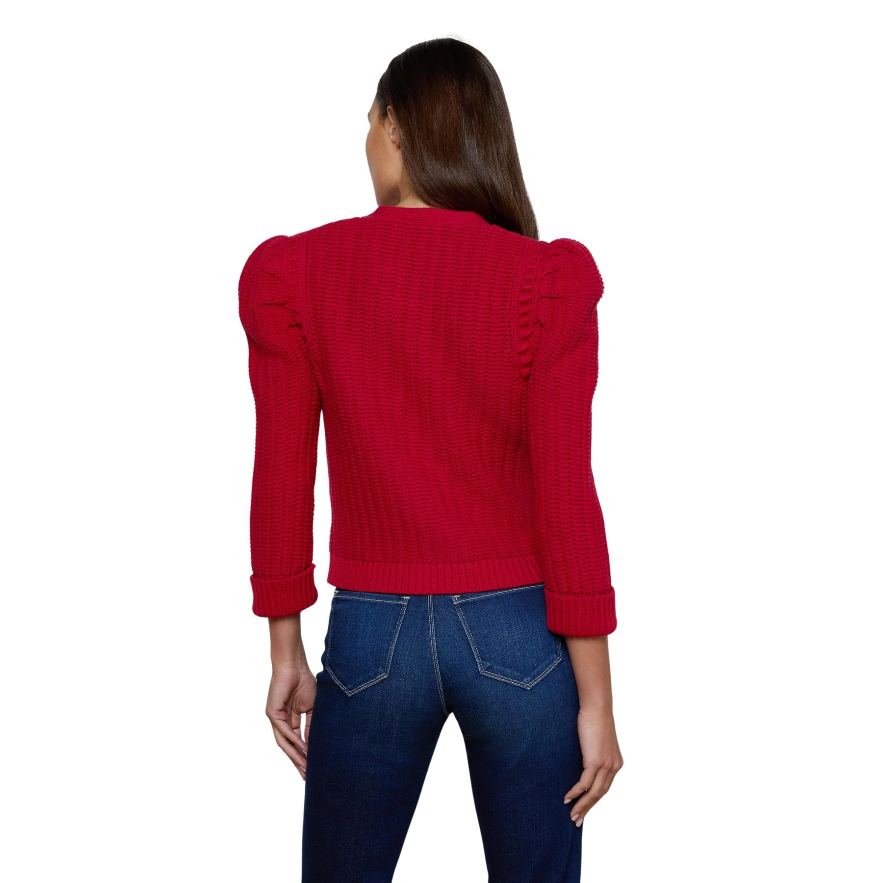 he Delli 3/4 Sleeve Crop Textured Cardigan blends refined structure with modern femininity. Crafted in a richly textured knit, this signature piece features sculpted puff shoulders and luxe gold crest buttons at the chest pockets for a touch of sophistication. The cropped, boxy silhouette and three-quarter sleeves create a flattering, versatile fit that transitions effortlessly from day to night. Whether worn open over a tank with denim or buttoned up with trousers, this cardigan elevates any look with polished ease.