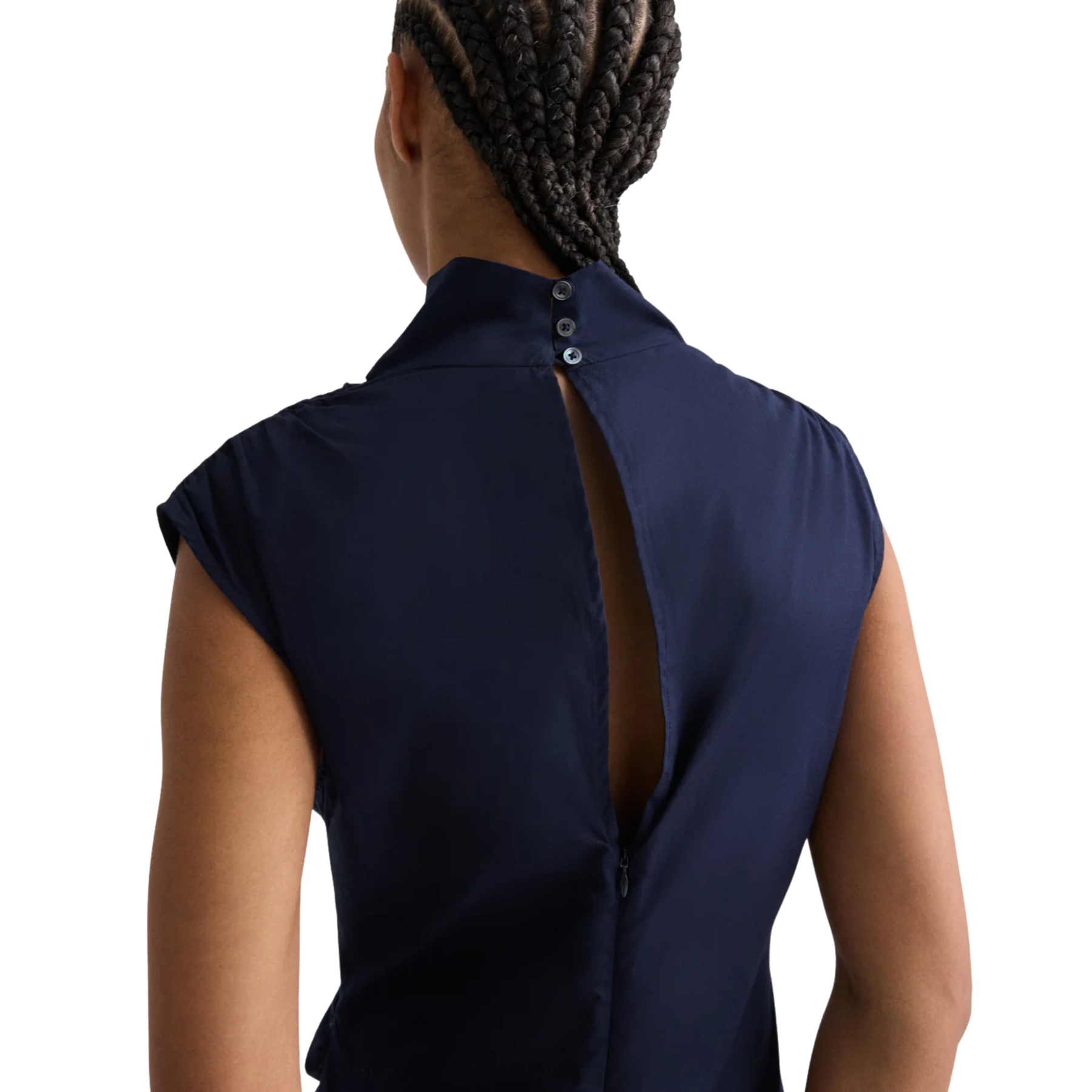 Sleeveless maxi dress in stretch cotton shirting. Fabric is our signature second skin poplin but with stretch to provide ultimate lightness and comfort. The Gathered Thoughts Dress features a sculptural high neckline with button closure and an open back detail. Designed with subtle gathering through the waist and a high side slit.