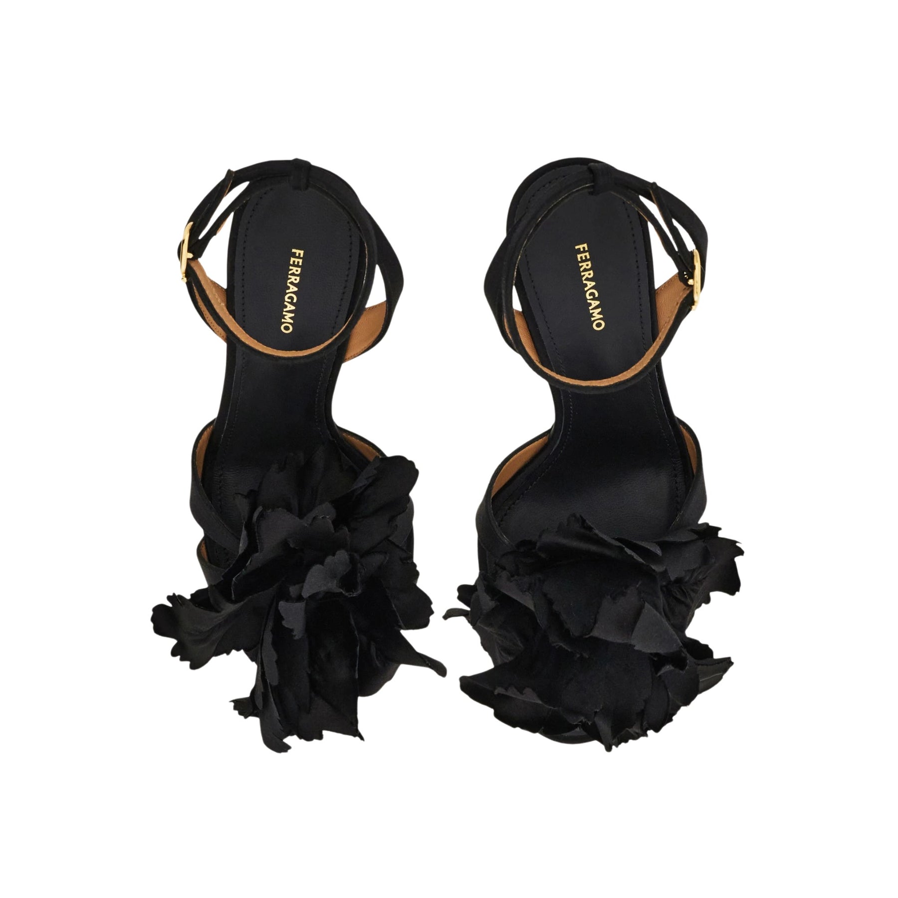 Design: High heel sandal with a voluminous flower embellishment and delicate ankle strap