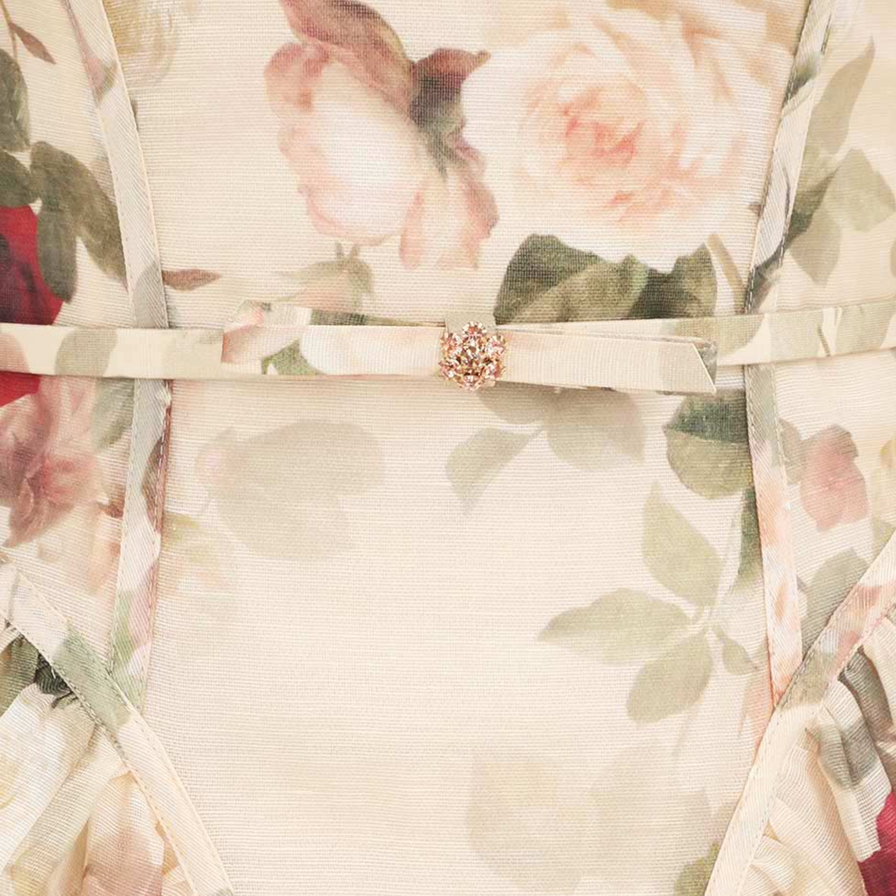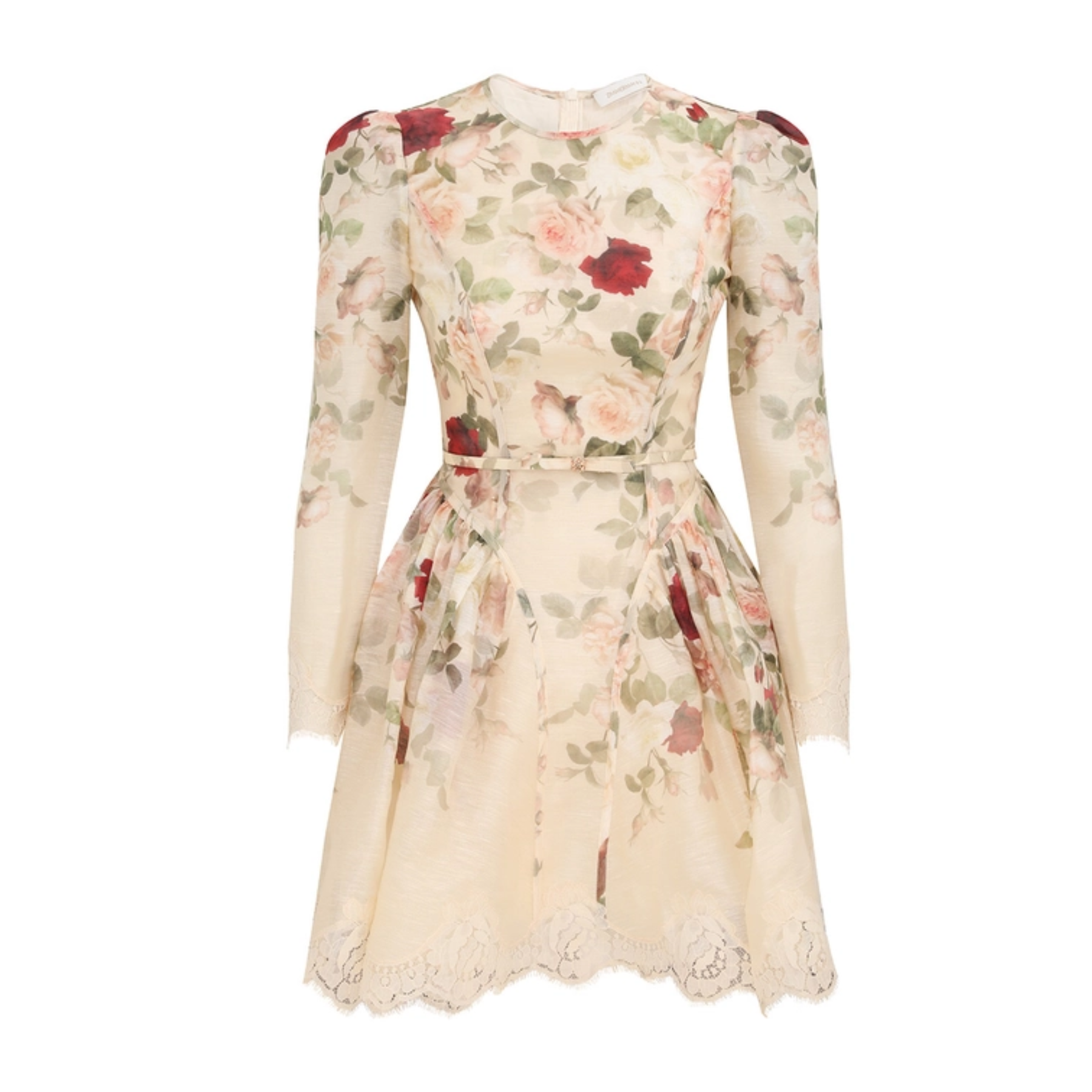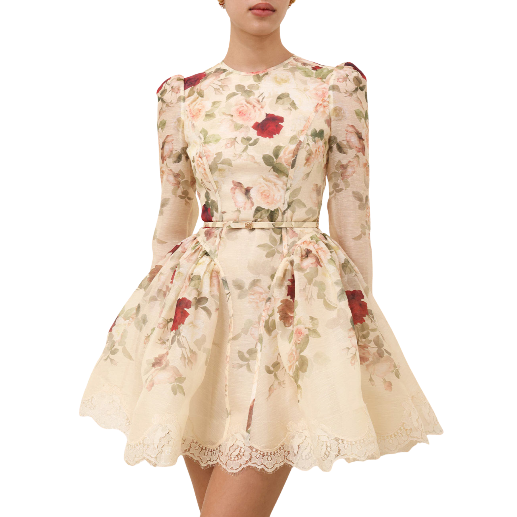 The Hypnotic Lace Trim Mini Dress in Cream Cascade captures Zimmermann’s signature blend of romance and femininity. Crafted from a soft silk-linen blend, it features intricate lace detailing along the neckline, cuffs, and hemline. The long sleeves and subtly flared skirt create a graceful silhouette, while delicate gathering adds texture and movement. Finished with a hidden back zip and a lightweight cotton lining, this mini dress embodies effortless elegance with a dreamy, vintage-inspired touch.