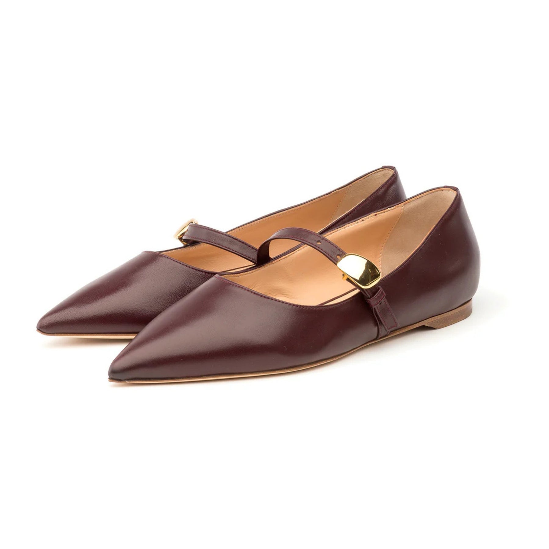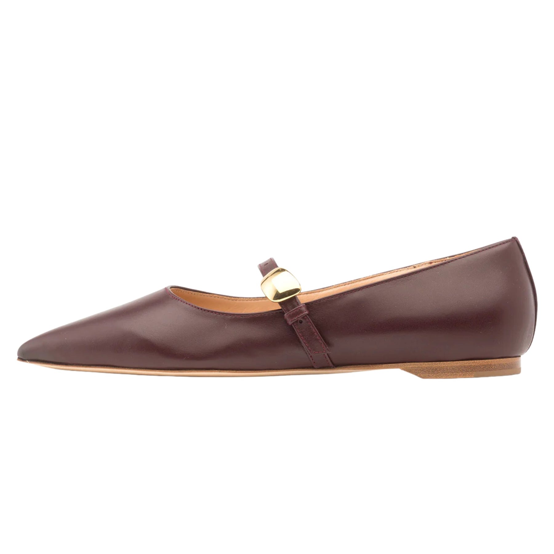 The Innis Flat reimagines the timeless Mary Jane silhouette with a touch of modern refinement. Crafted from rich Merlot calf leather, this elegant flat is detailed with a miniature gold chrome pebble buckle, adding a sculptural accent to its classic form. The elongated pointed toe and low-profile sole create a graceful, contemporary shape that transitions seamlessly from day to evening.