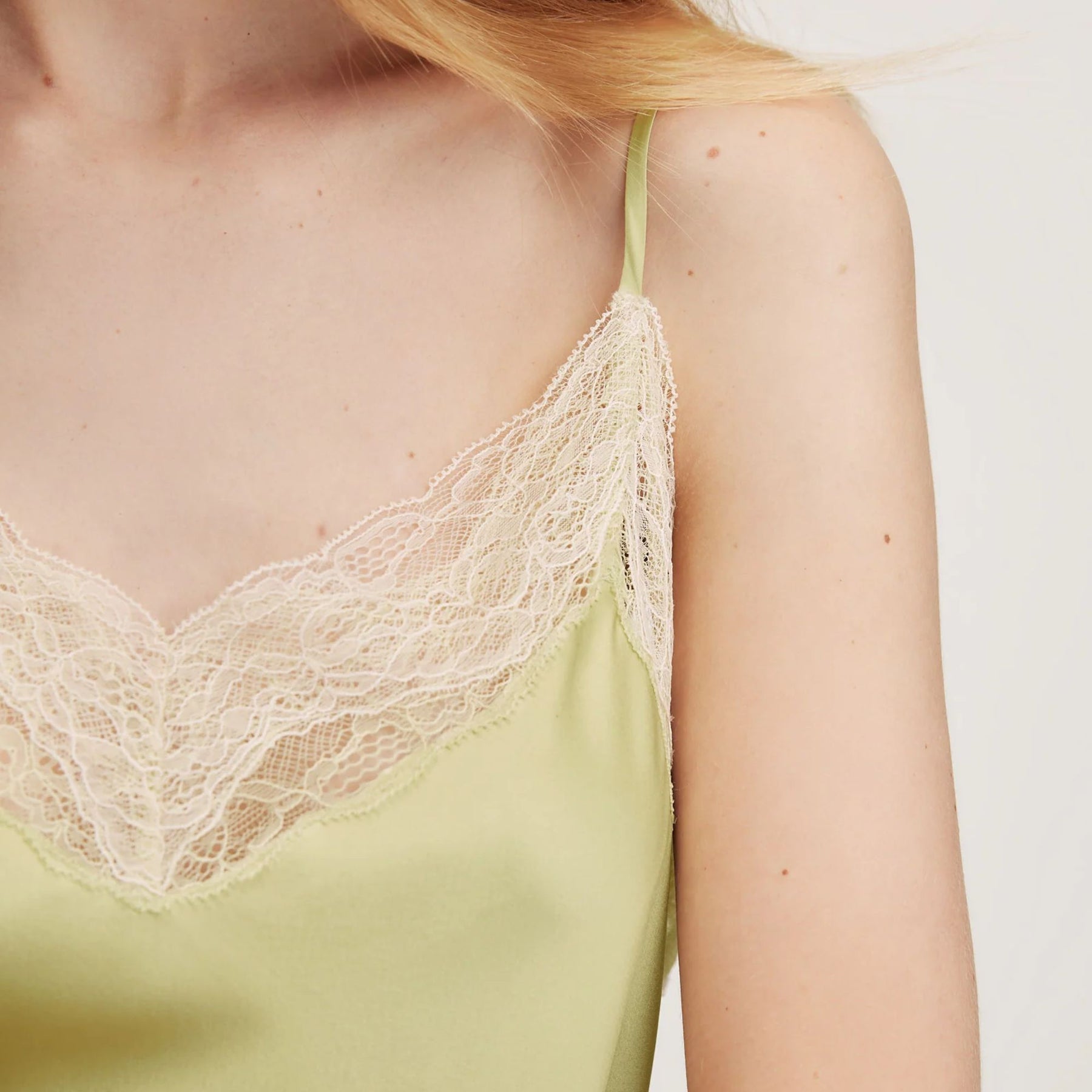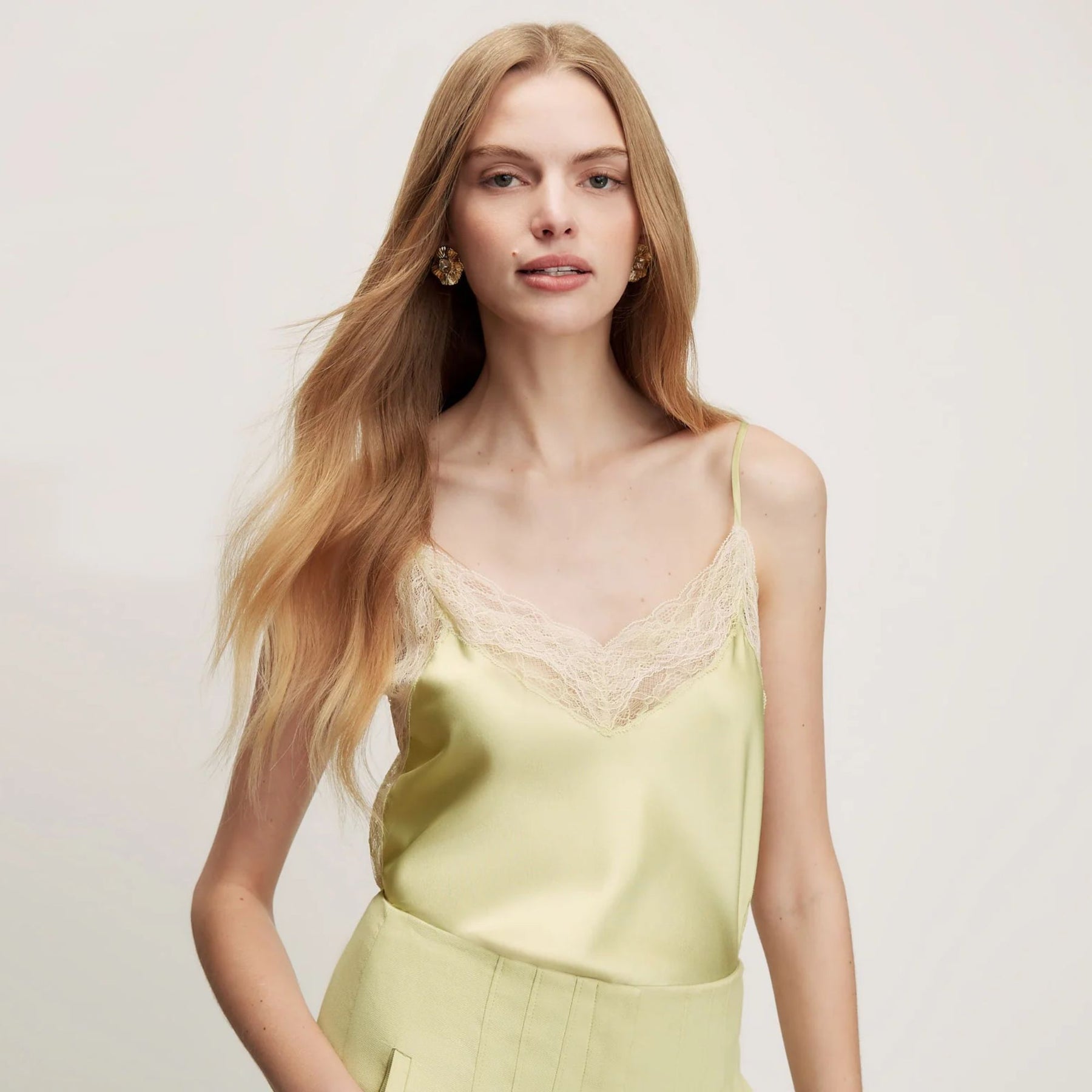 Delicate yet undeniably versatile, the Johanan Cami is crafted from premium stretch silk in a fresh pistachio hue. Designed with a relaxed silhouette and fluid drape, it’s finished with wide lace trim for a soft, feminine edge—perfect for layering or wearing on its own.