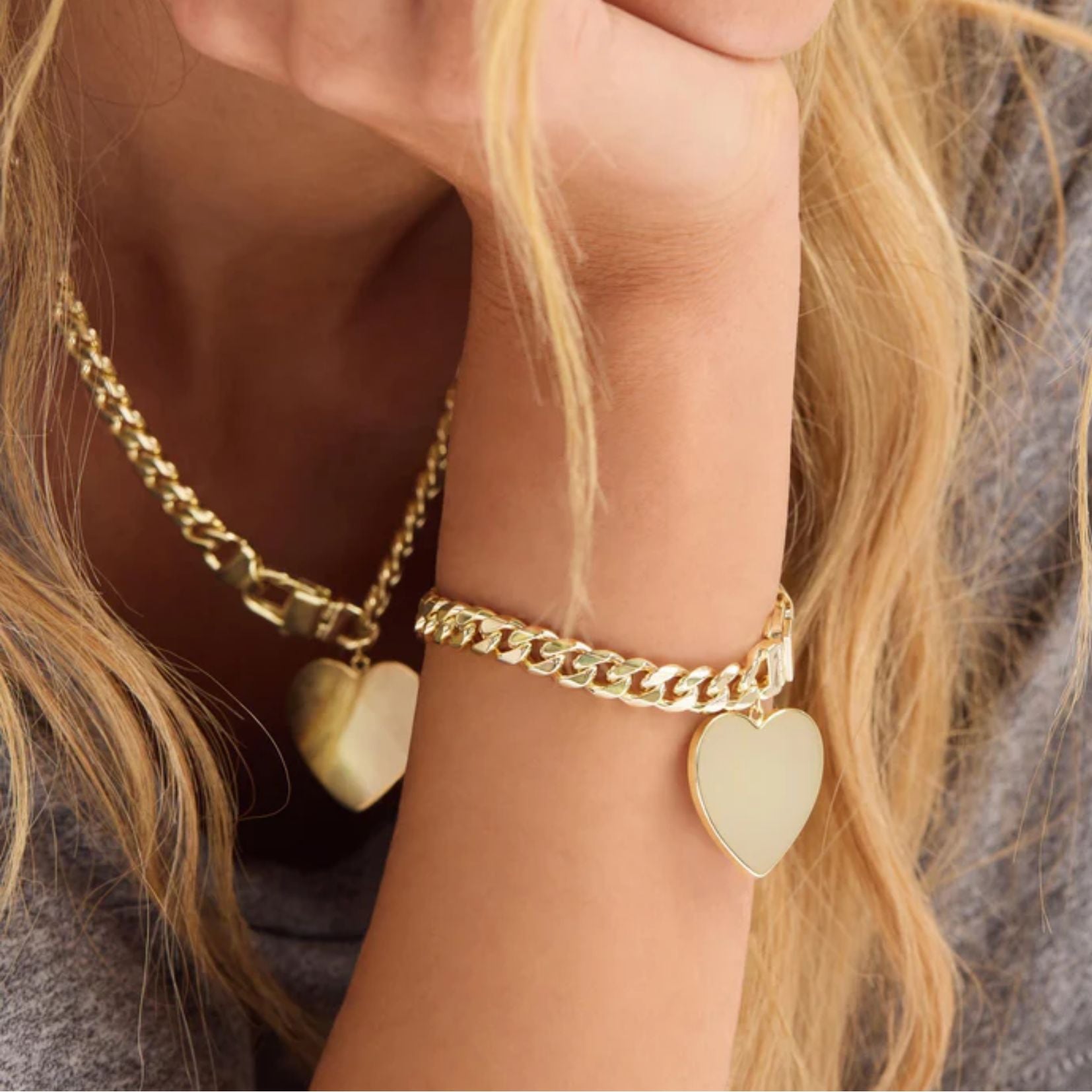 A modern classic with a romantic twist, this best-selling Julian Cuban Chain Bracelet is paired with an oversized heart charm for a bold yet meaningful statement. Wear it sleek and simple or personalize it with engraving—either way, it’s a standout piece designed to show a little love every day. Finished with the brand’s signature MM padlock clasp for a secure and polished finish.