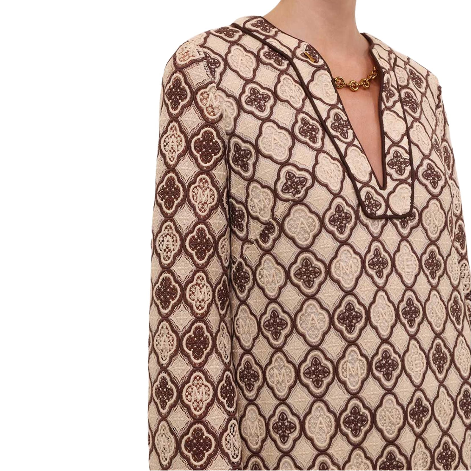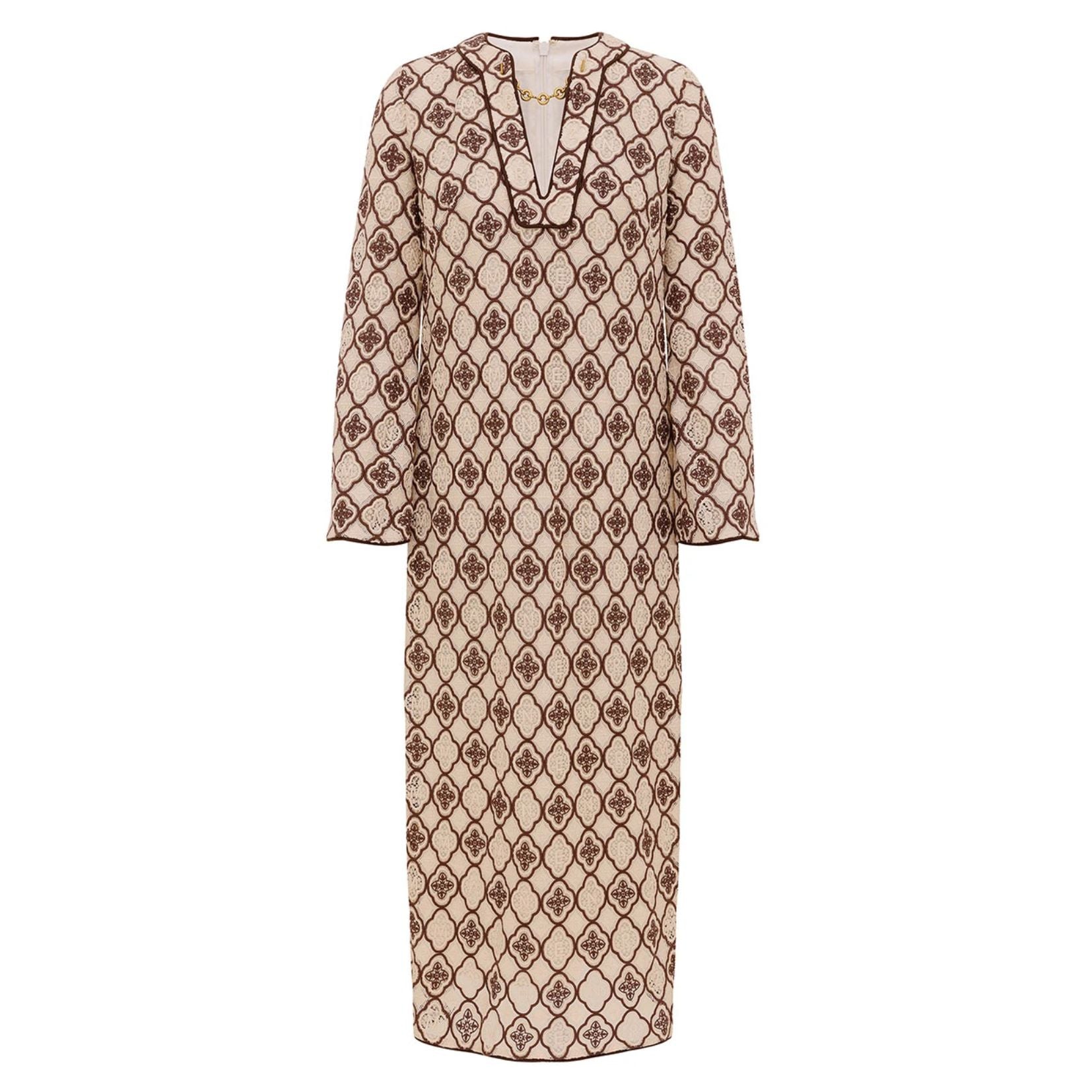From the Spring 2026 Kindred Spirit collection, the Luna Guipure Midi Dress by Zimmermann is a striking tunic-style silhouette defined by intricate embroidery and refined contrast tones. Designed with a sharp plunging V-neckline, this long-sleeve midi features delicate gold chain detailing across the bust for both flexibility and visual interest. Piped trim frames the design while the heavily embroidered guipure fabric adds texture and depth. Fully lined with an invisible centre-back zip, it delivers structure with effortless elegance in rich chocolate and cream hues.