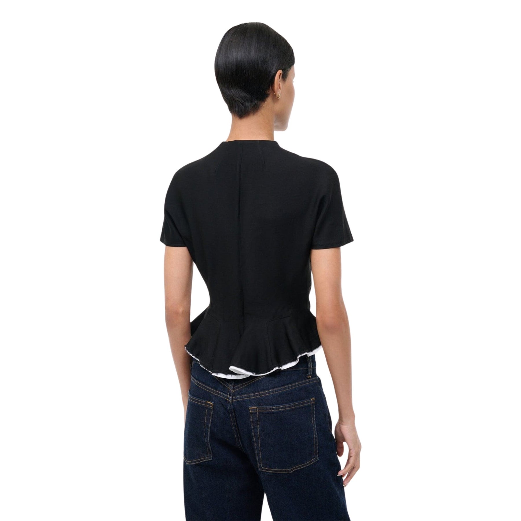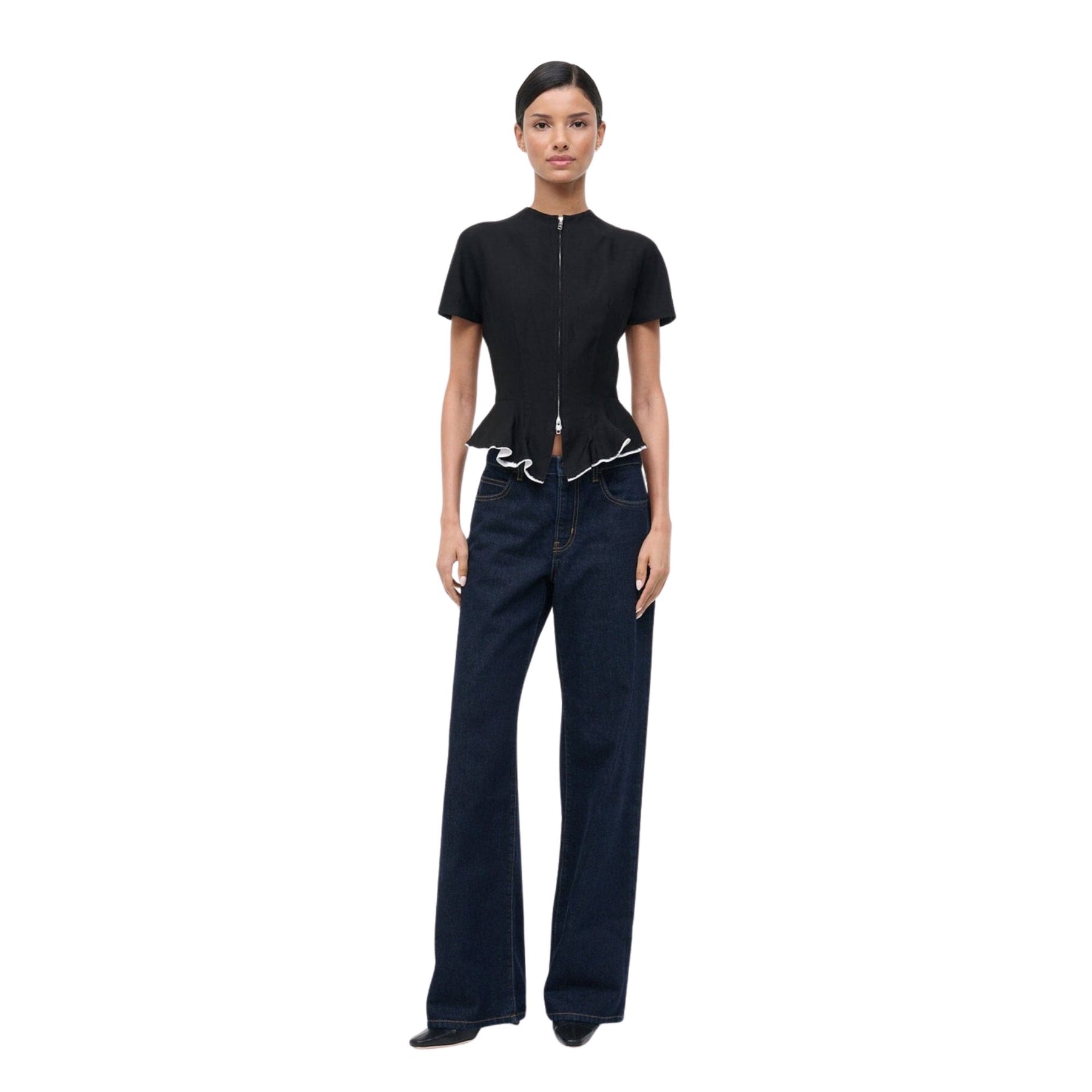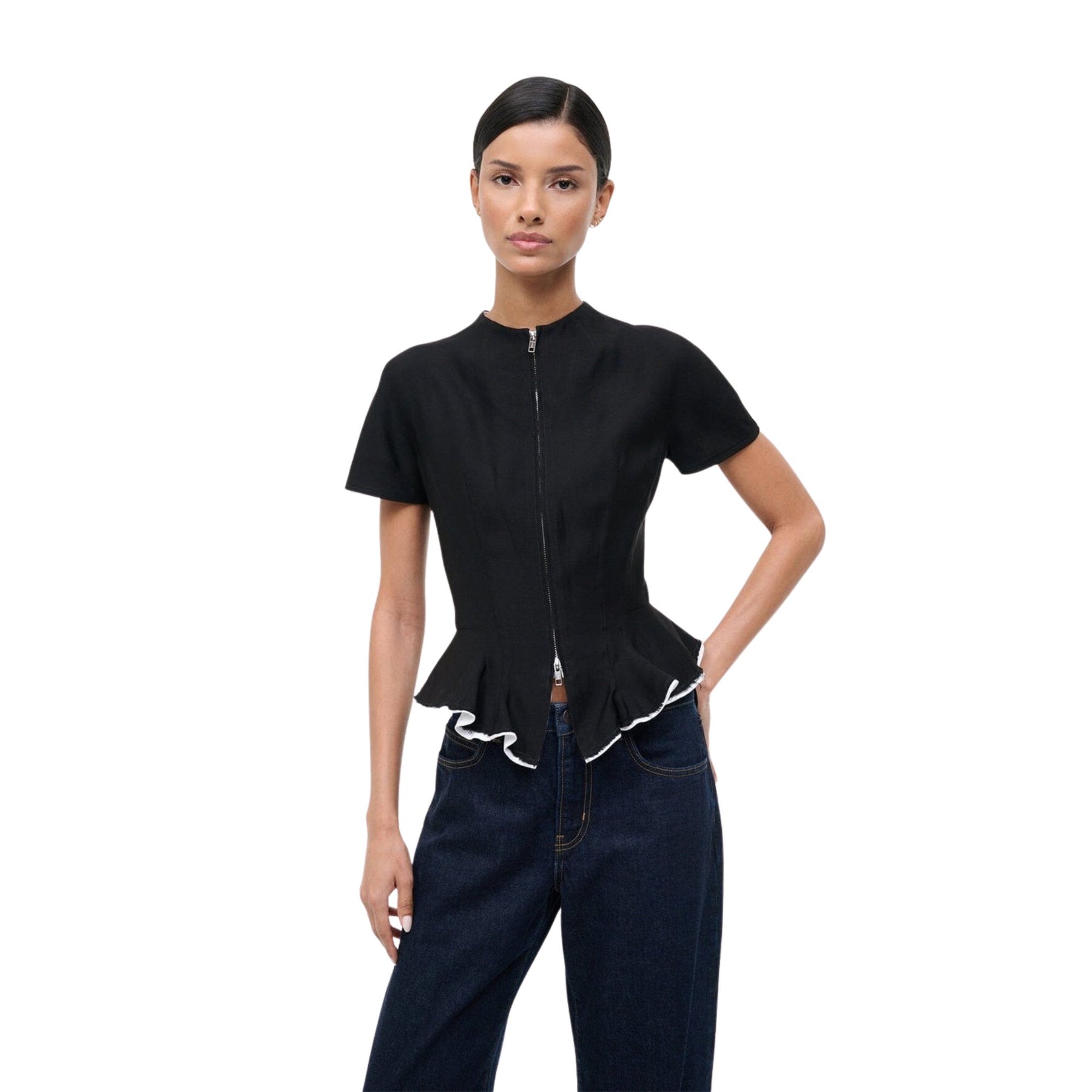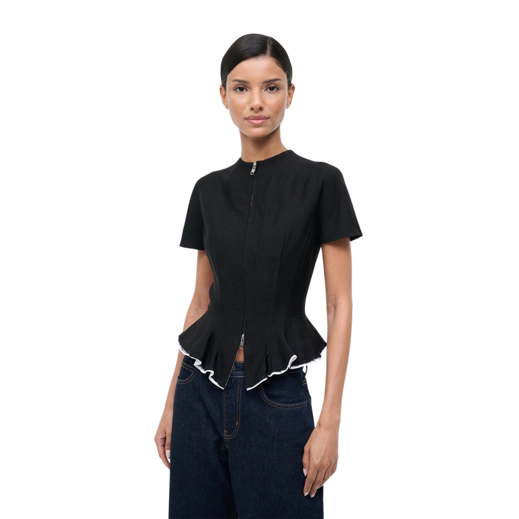 The Maelle Top offers a refined, sculpted silhouette designed to flatter with effortless sophistication. Crafted from a luxurious wool–viscose–silk blend, this structured short-sleeve top features a sleek front zipper and a softly flared peplum hem. Contrast linen trim adds subtle definition, enhancing the architectural shape and creating a polished finish suitable for both everyday styling and elevated occasions.