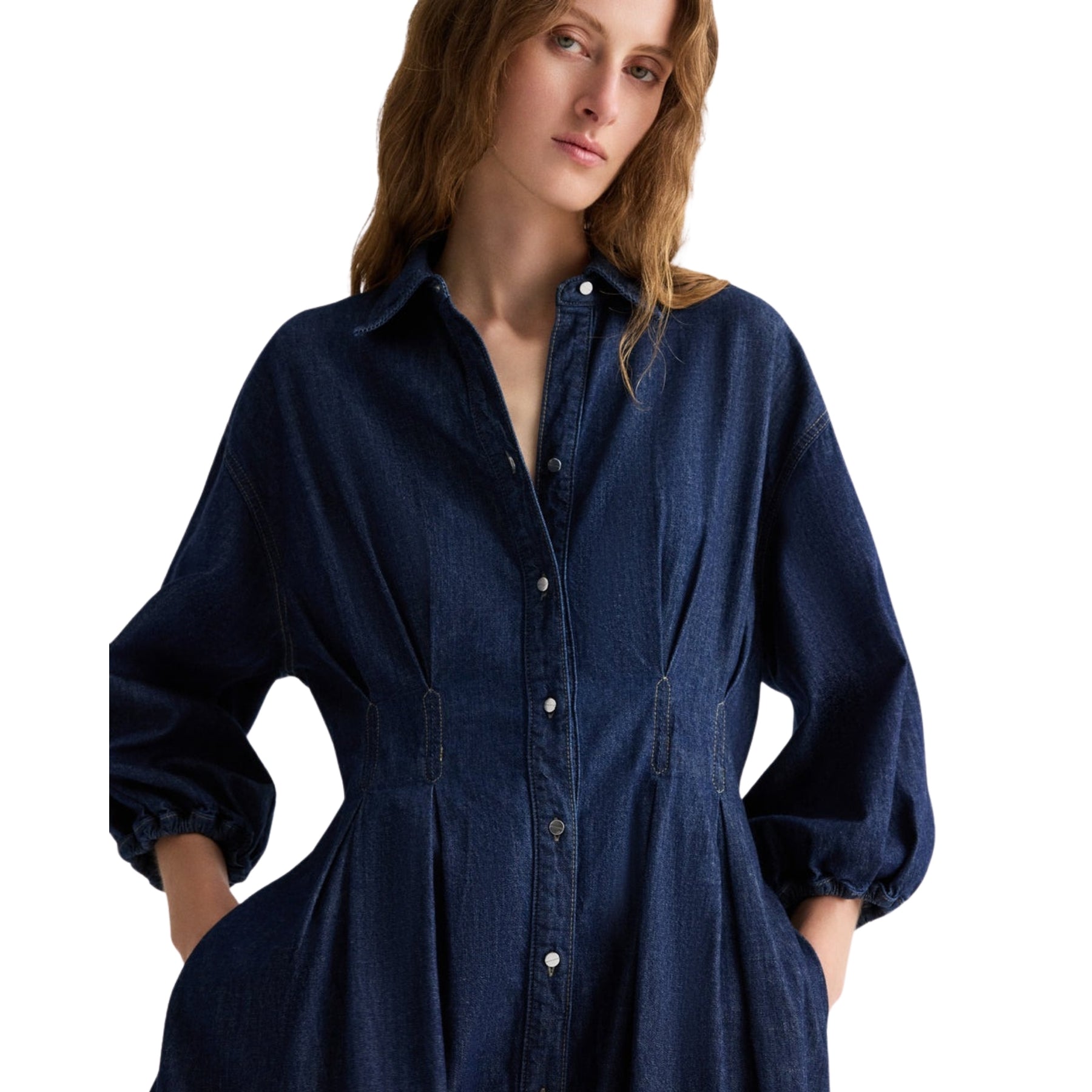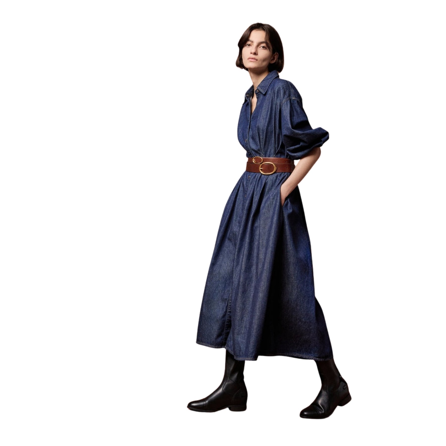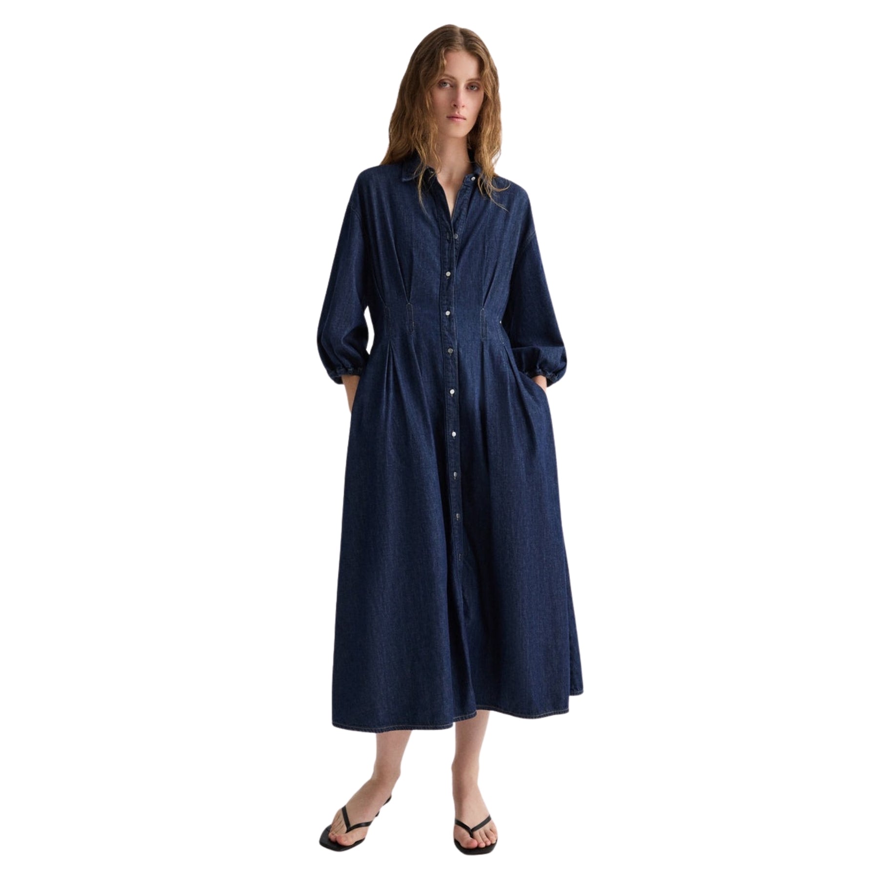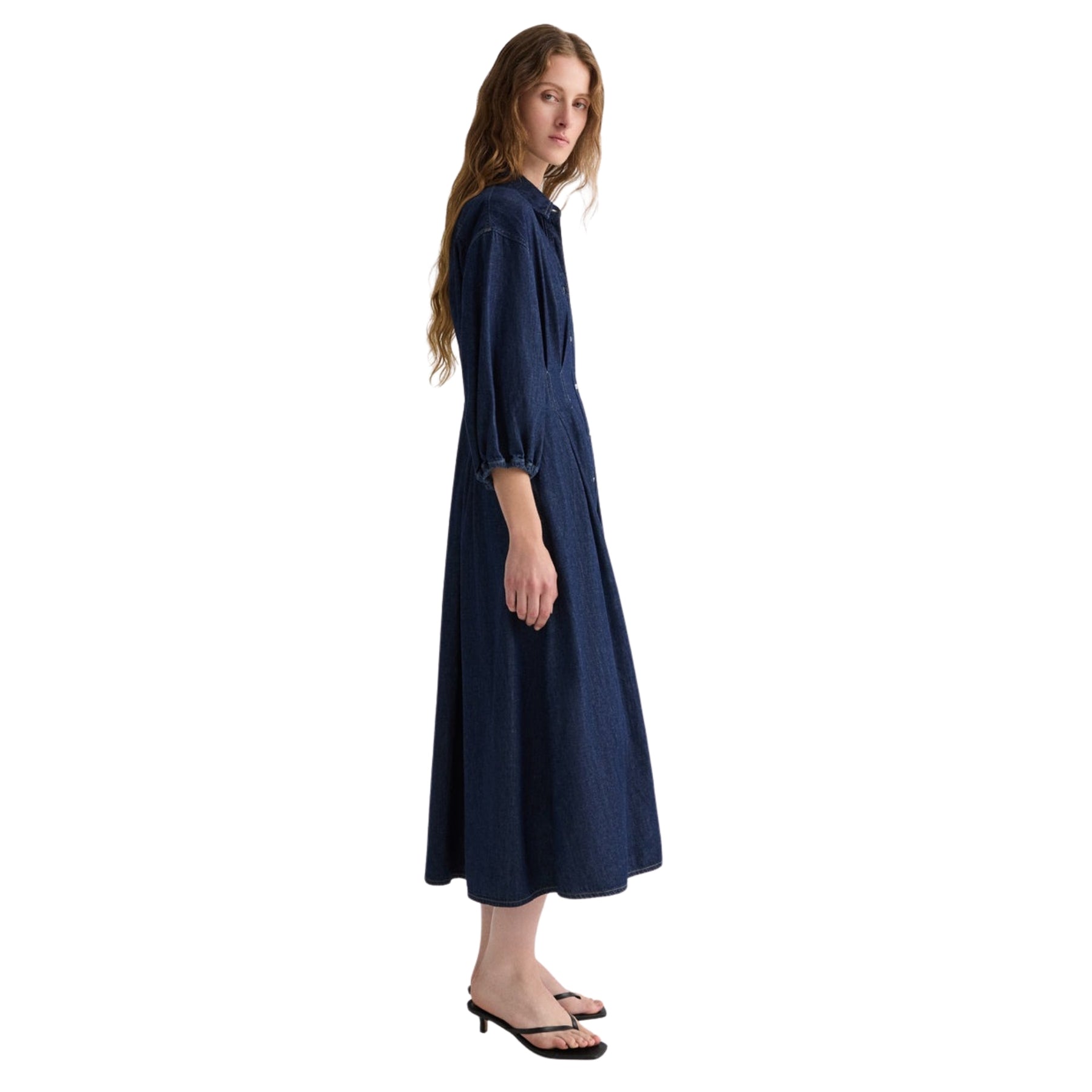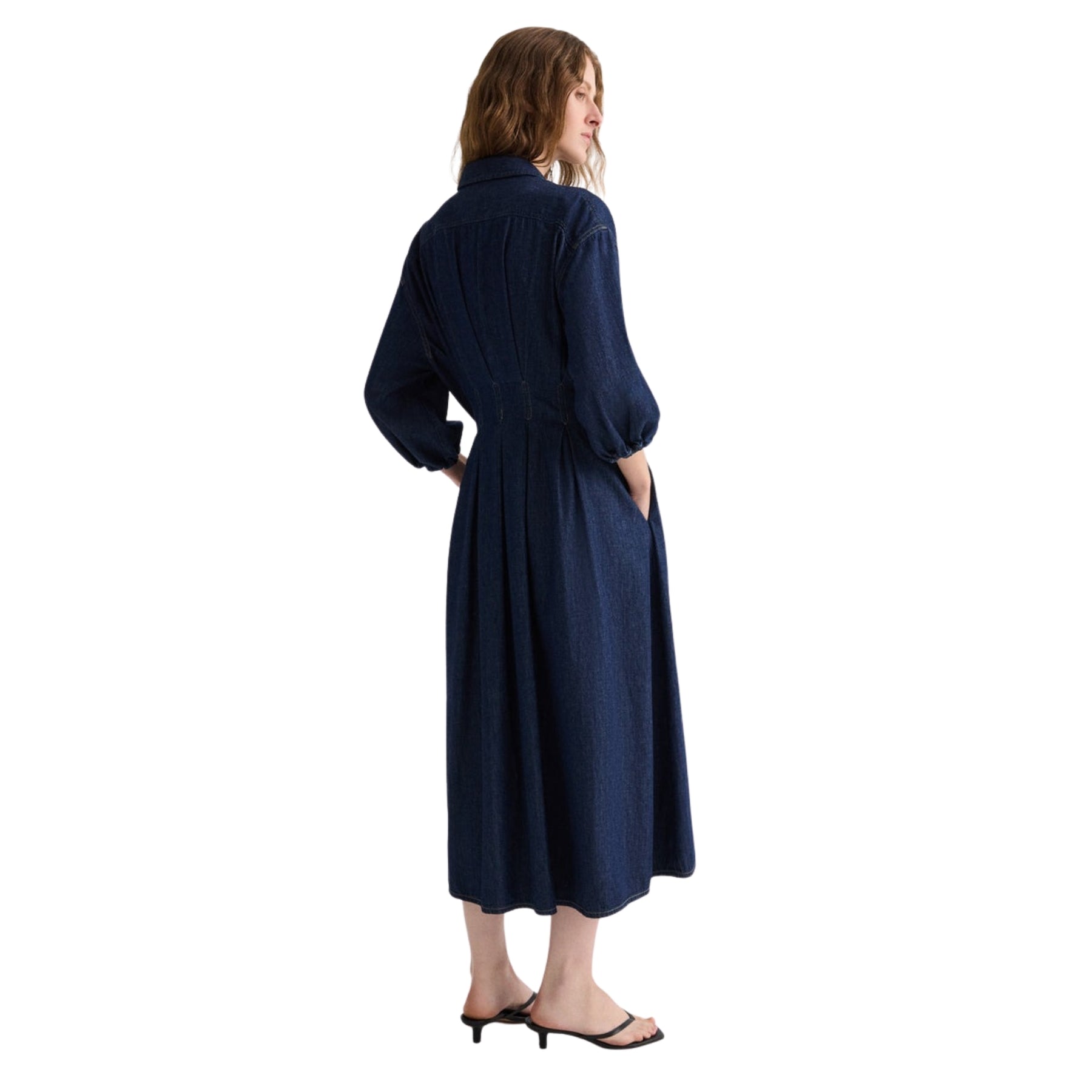 The Mason Shirt Dress combines effortless style with everyday comfort. Its contoured bodice and flowing midi skirt create a flattering silhouette, while the Indigo wash makes it easy to dress up or down. A versatile piece that transitions seamlessly from day to night.