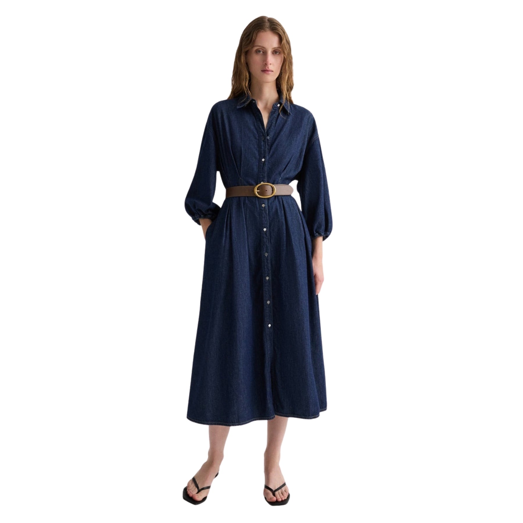 The Mason Shirt Dress in Indigo is the perfect blend of effortless sophistication and everyday comfort. Crafted from premium denim shirting, this long-sleeve dress features a beautifully contoured bodice that flows into a full, midi-length skirt—creating a flattering silhouette with timeless appeal. With its soft drape, modern detailing, and versatile styling options, it’s an essential piece for anyone who values ease, polish, and understated elegance.