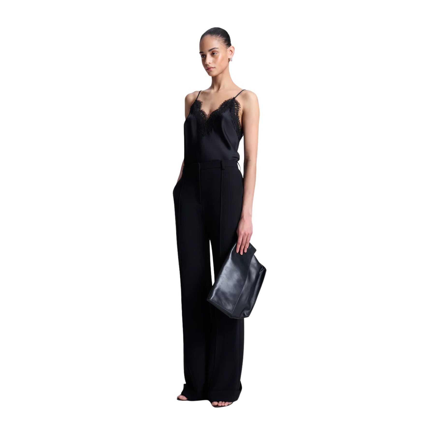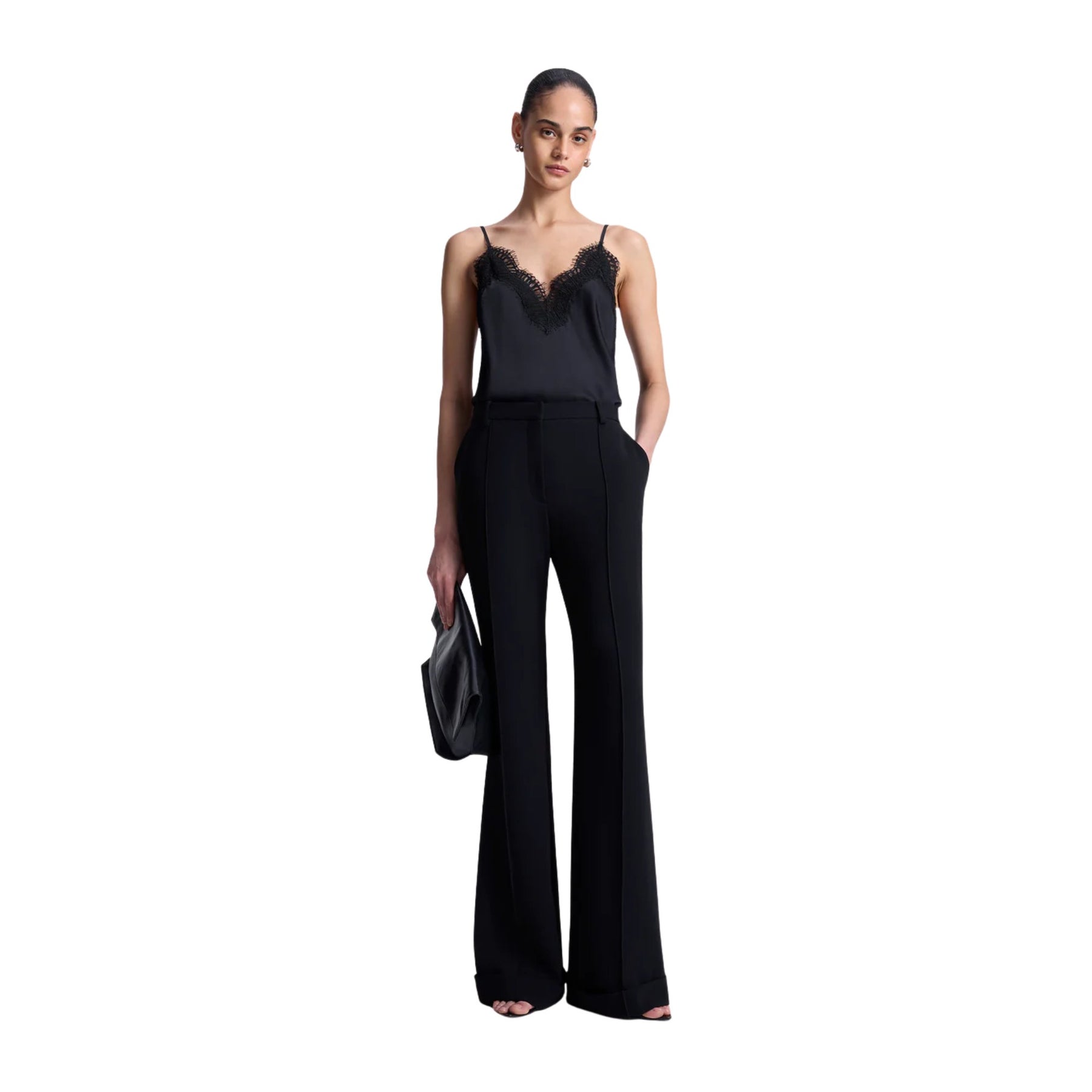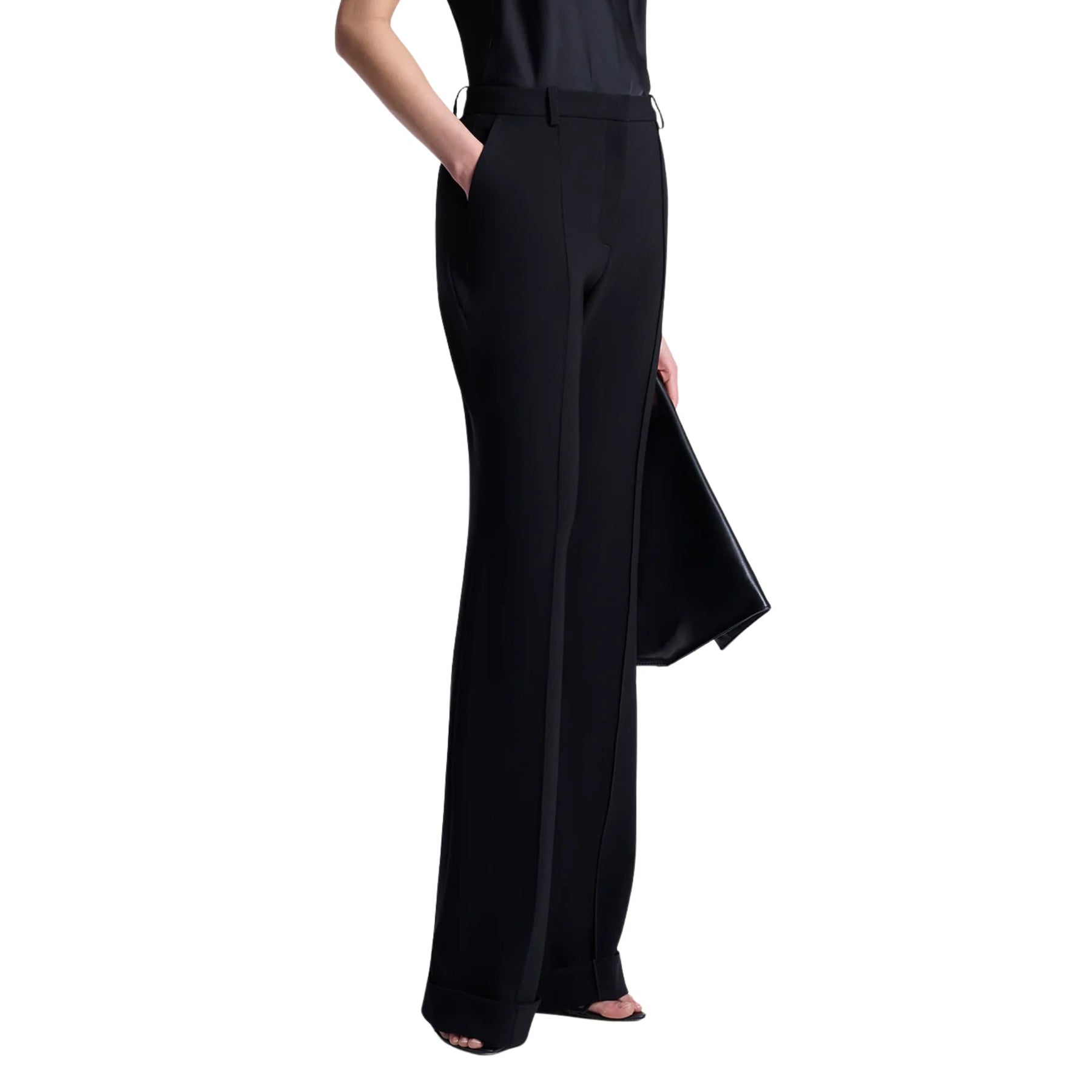 The Max Pant is a tailored slim trouser designed with clean lines and a modern silhouette. Crafted from a structured yet fluid woven fabric, it features a mid-rise waist, pin tuck crease, and a subtle flare at the floor-length cuffed hem for timeless elegance.