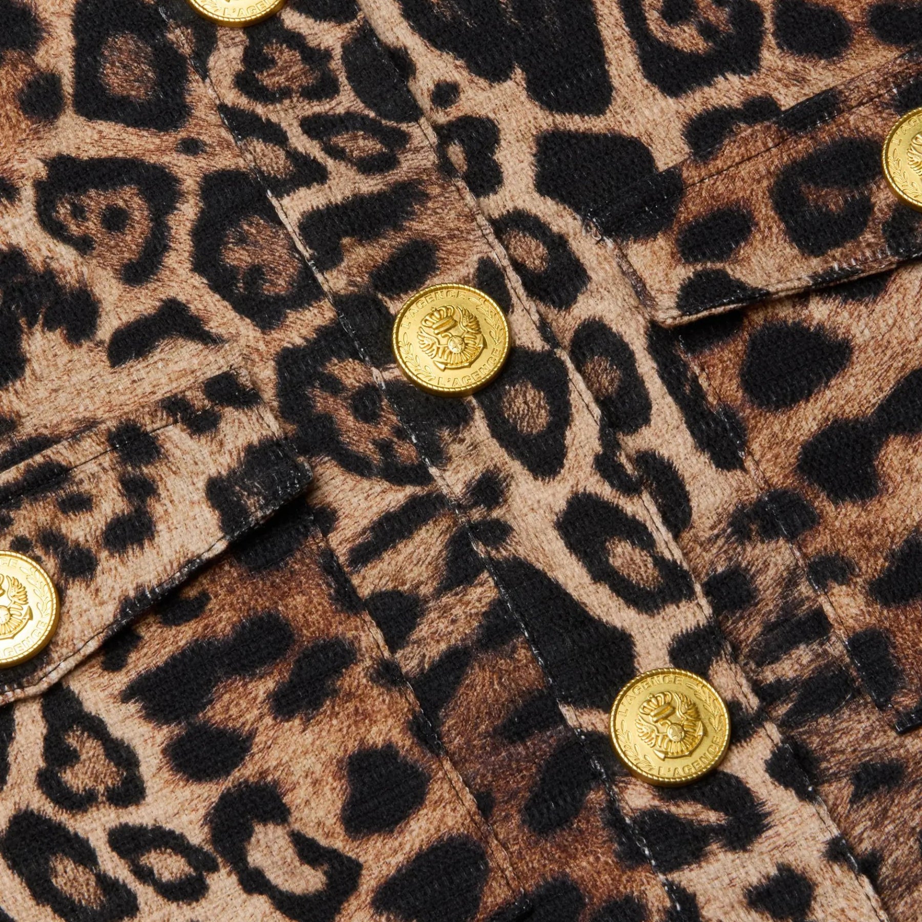 The Nyx Crop Jacket delivers bold style in an easy, everyday layer. Crafted from printed tweed in a striking leopard motif, this cropped silhouette features a relaxed fit with subtle shoulder structure for a modern, confident look. Snap buttons and patch pockets add a polished finish. Wear it with denim for effortless edge or pair it with the matching mini skirt for a standout set.