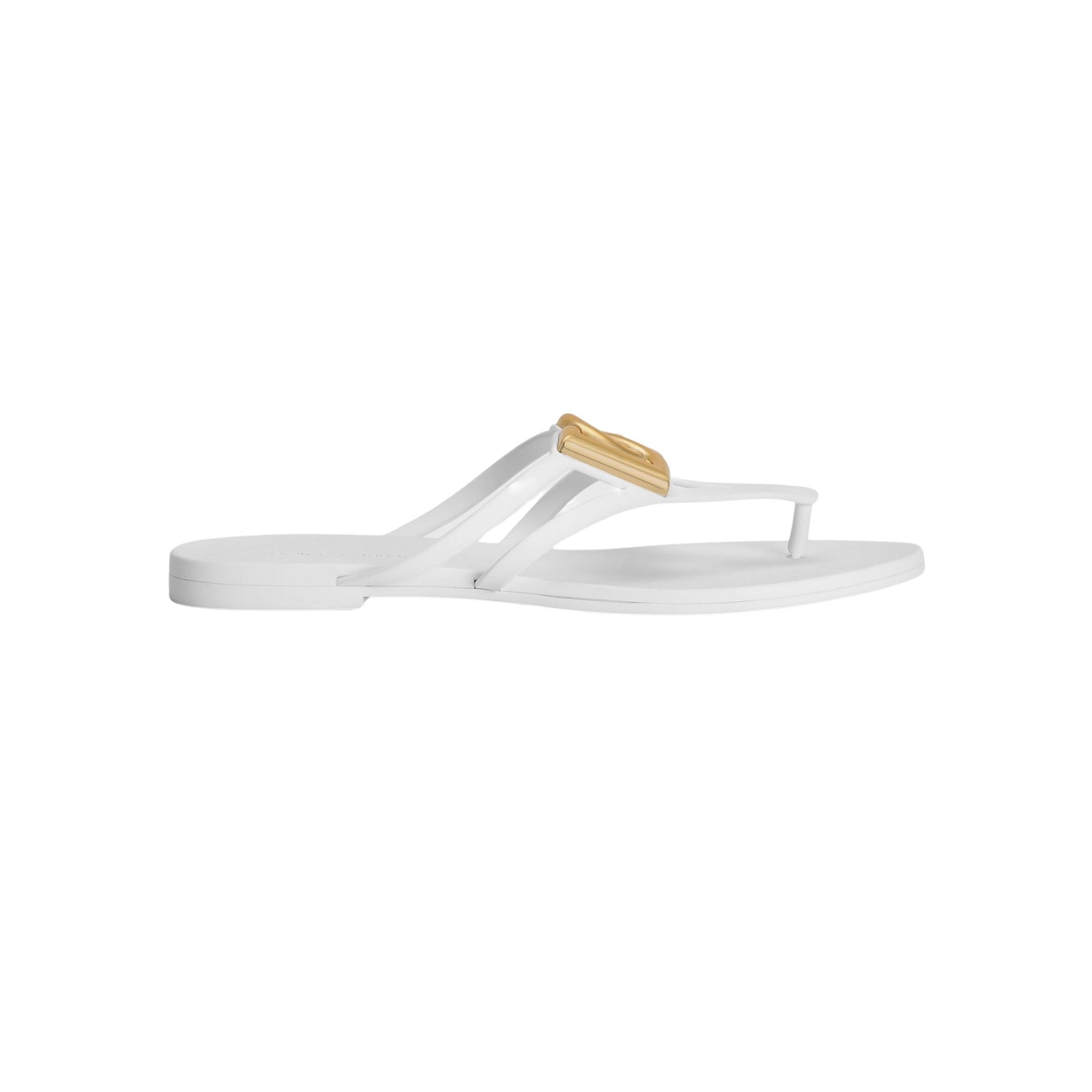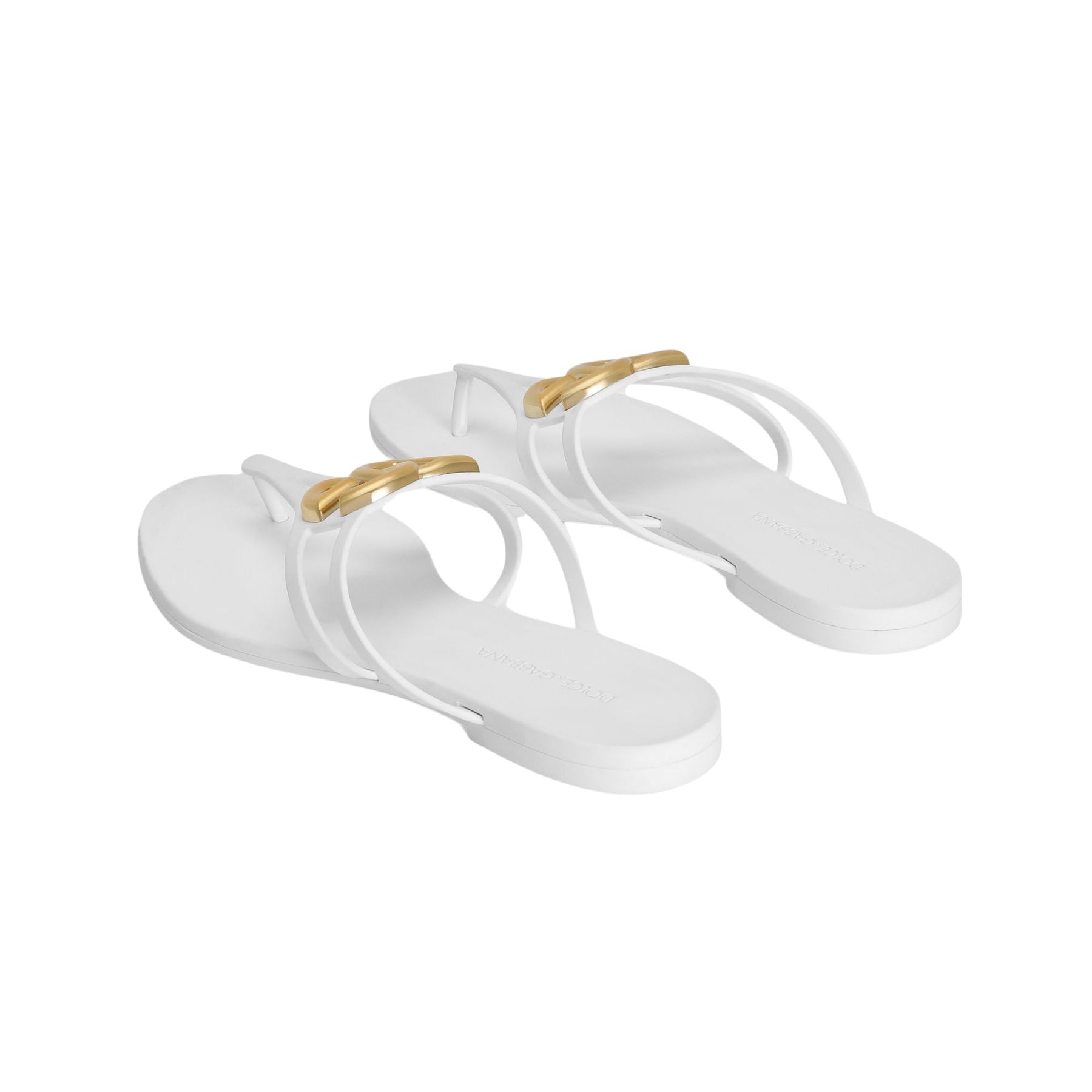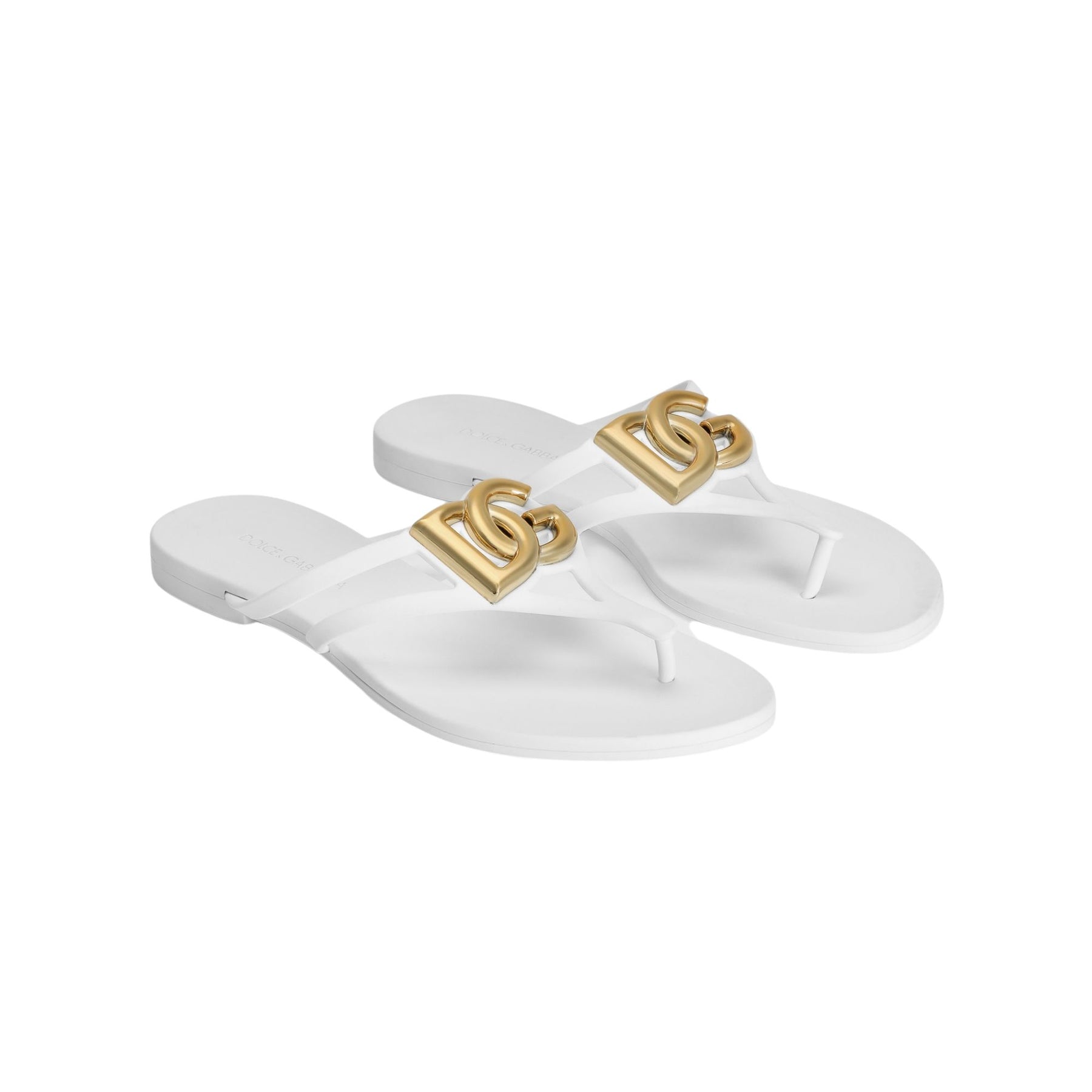 Make a bold statement poolside with these pool thong sandals by Dolce & Gabbana. Designed for effortless warm-weather style, this sleek thong silhouette features a crisp white finish accented by a striking gold-tone DG logo for a touch of signature glamour.