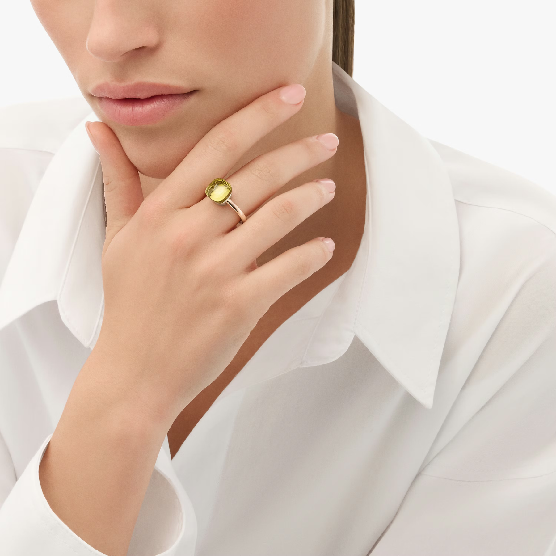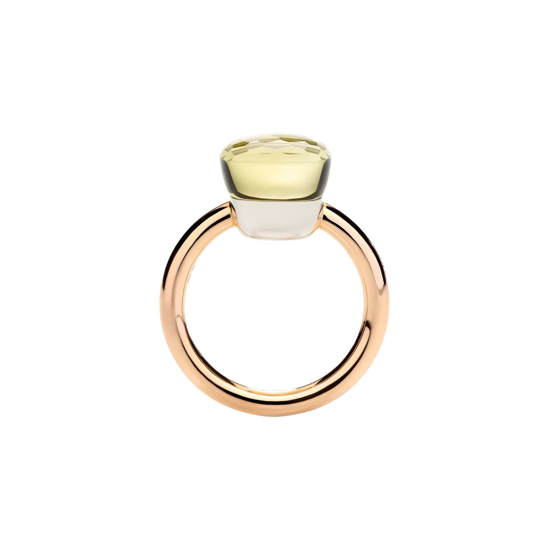 A radiant take on Pomellato’s signature design, the Nudo Classic ring brings a fresh, sunlit energy through its luminous lemon quartz center. The softly faceted stone glows with a sheer, golden hue—almost like capturing light itself—while the iconic “nude” setting allows it to shine from every angle. Balanced with warm rose and white gold, it feels vibrant, modern, and effortlessly bold.