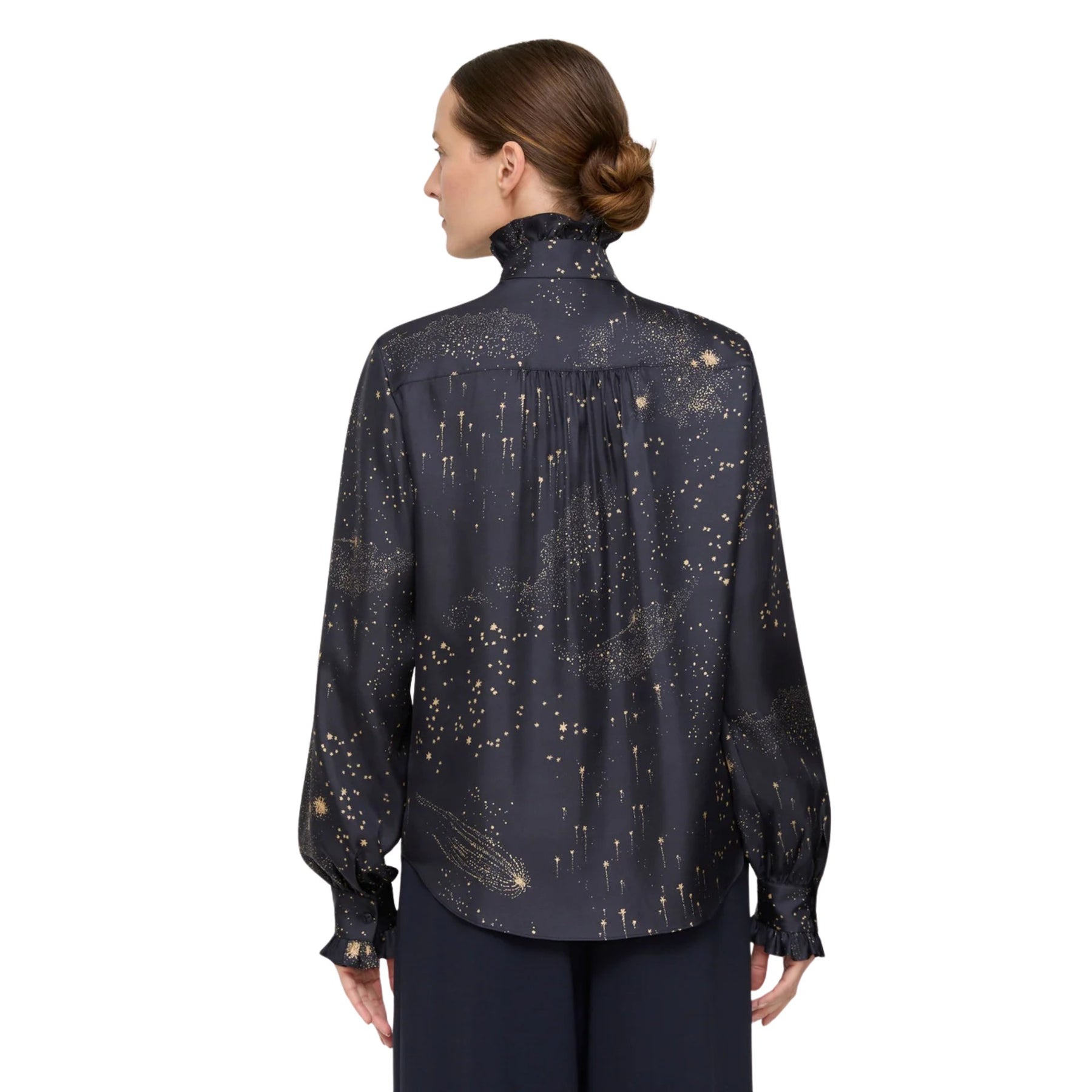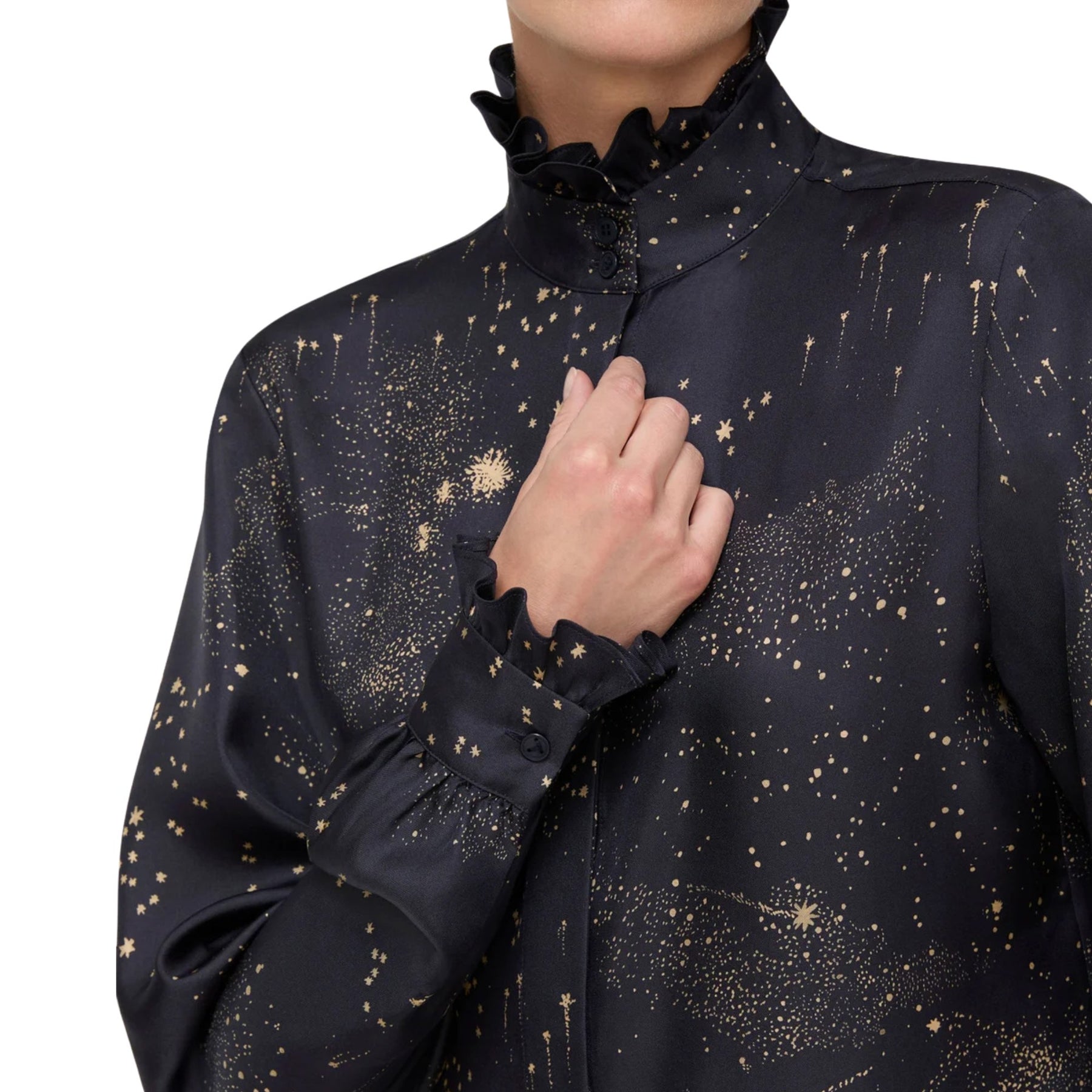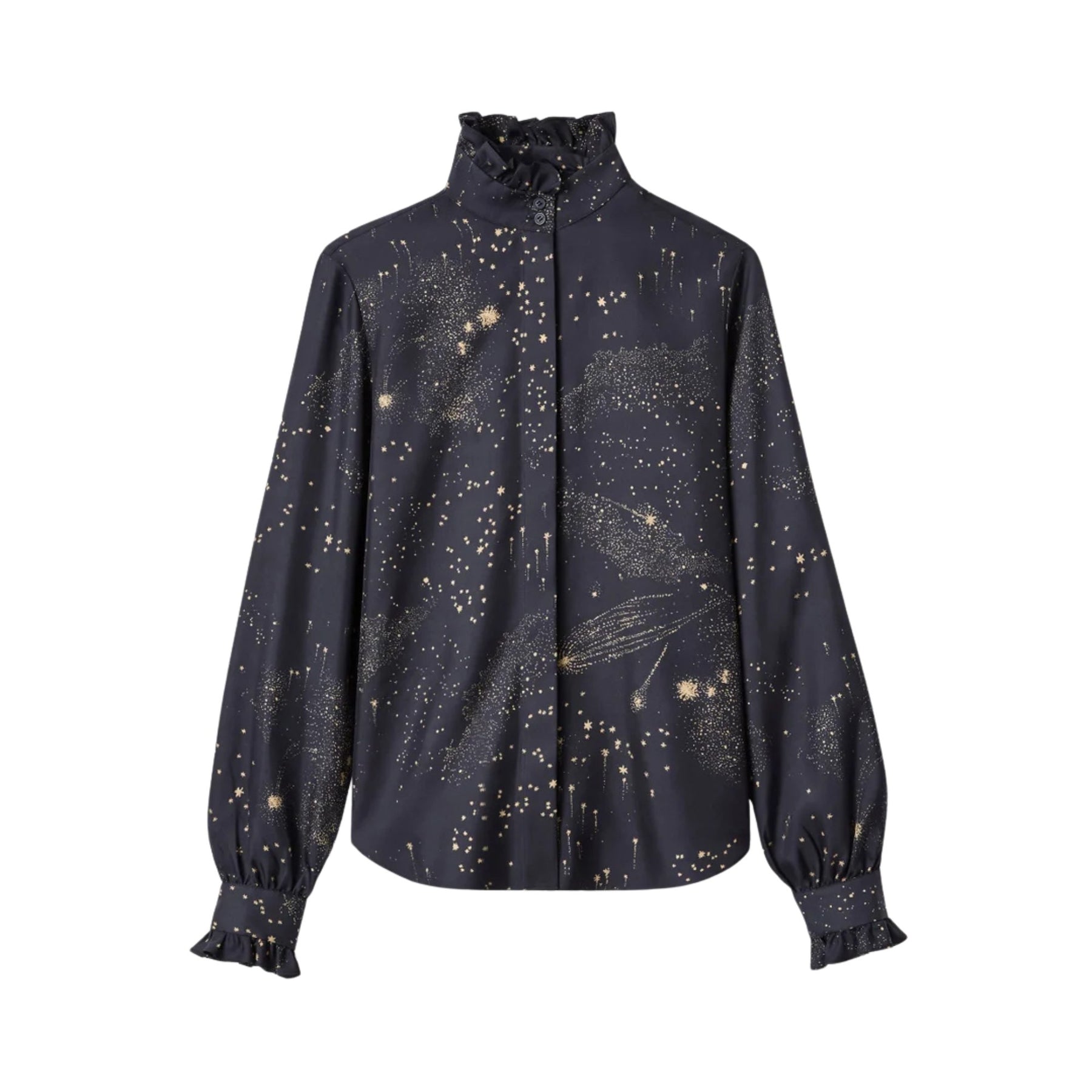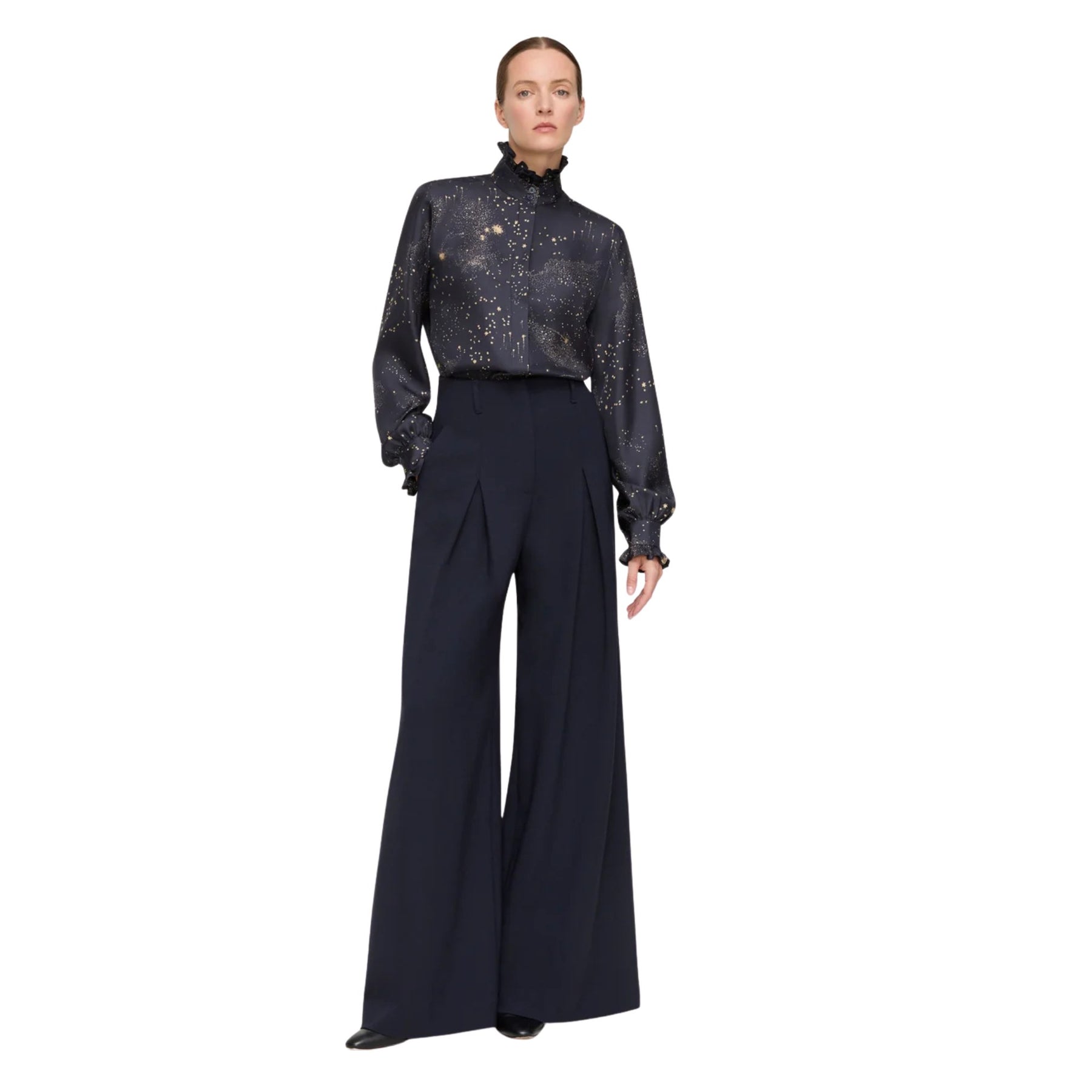 The Ruffle Blouse captures a sense of celestial elegance with its signature Resort 2026 Cosmos print, rendered on lustrous, fluid silk twill. Defined by softly sculptural pleated ruffles at the high collar and gentle gathering at the cuffs of airy blouson sleeves, this piece embodies effortless sophistication with a touch of romantic flair.