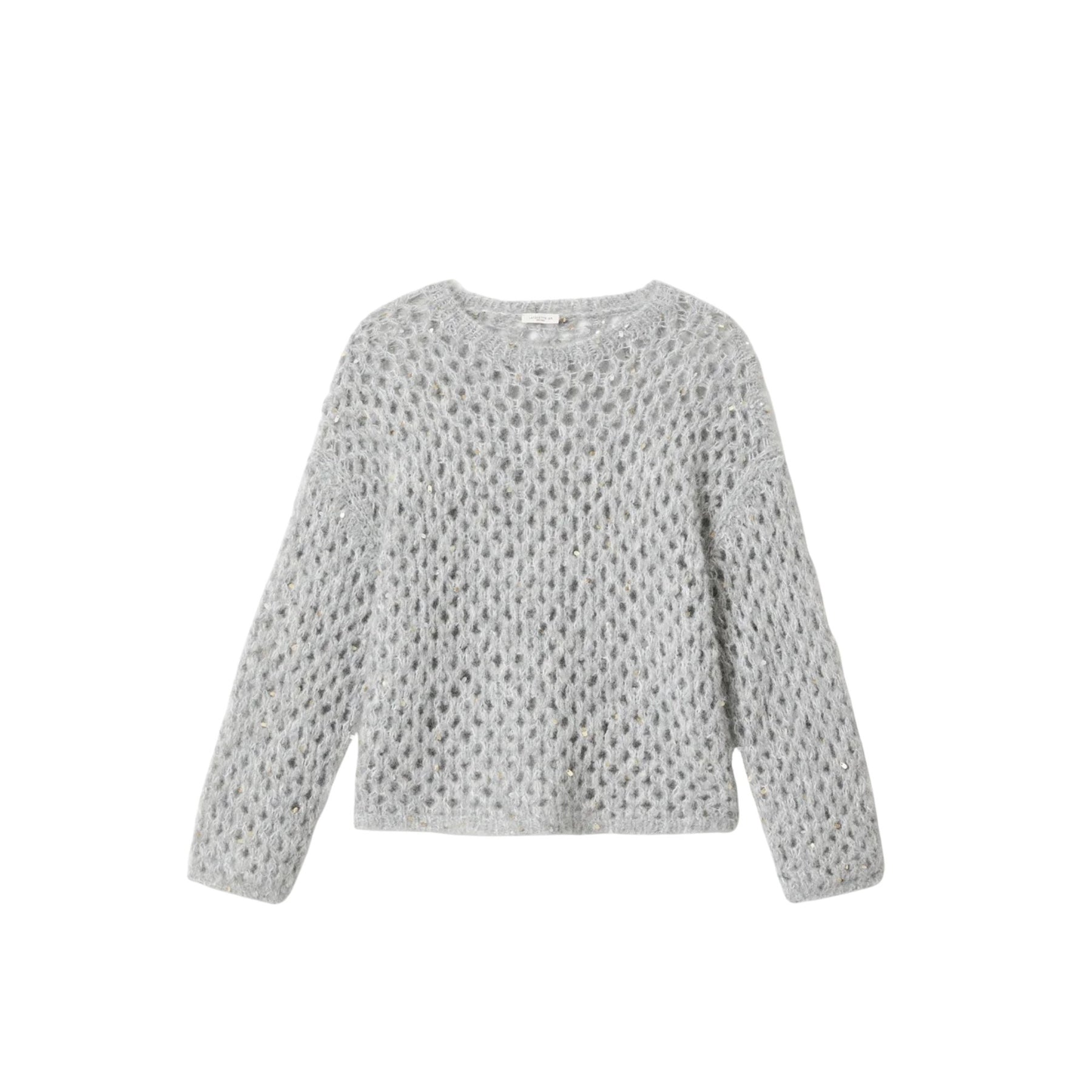 The Sequin Hand Knit Sweater blends artisanal craftsmanship with subtle shimmer. Hand-knit from Italian alpaca-cotton yarn, this airy crewneck features an open stitch design accented with delicate sequins that softly catch the light. A relaxed silhouette with drop shoulders lends effortless ease, making it perfect for layering across seasons.