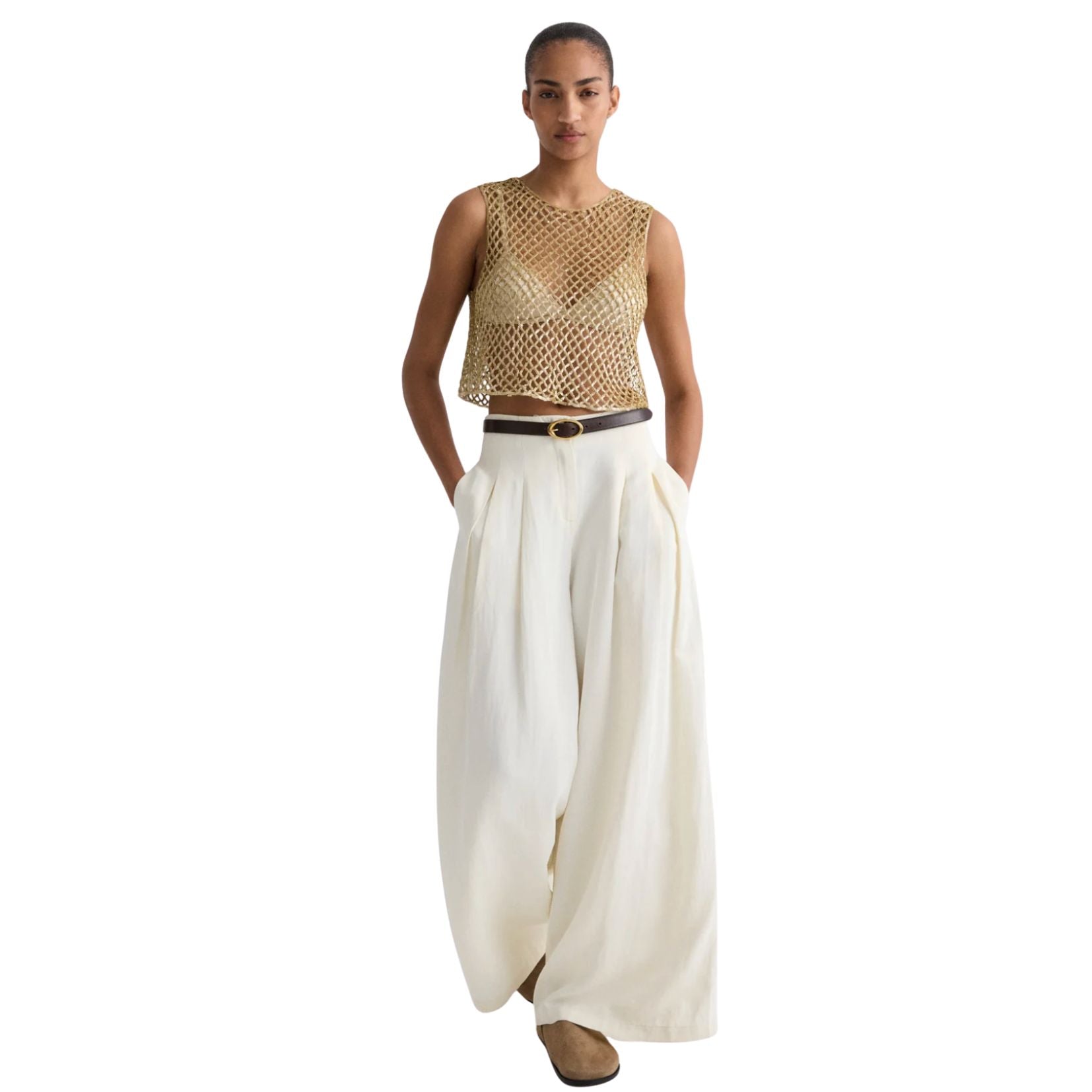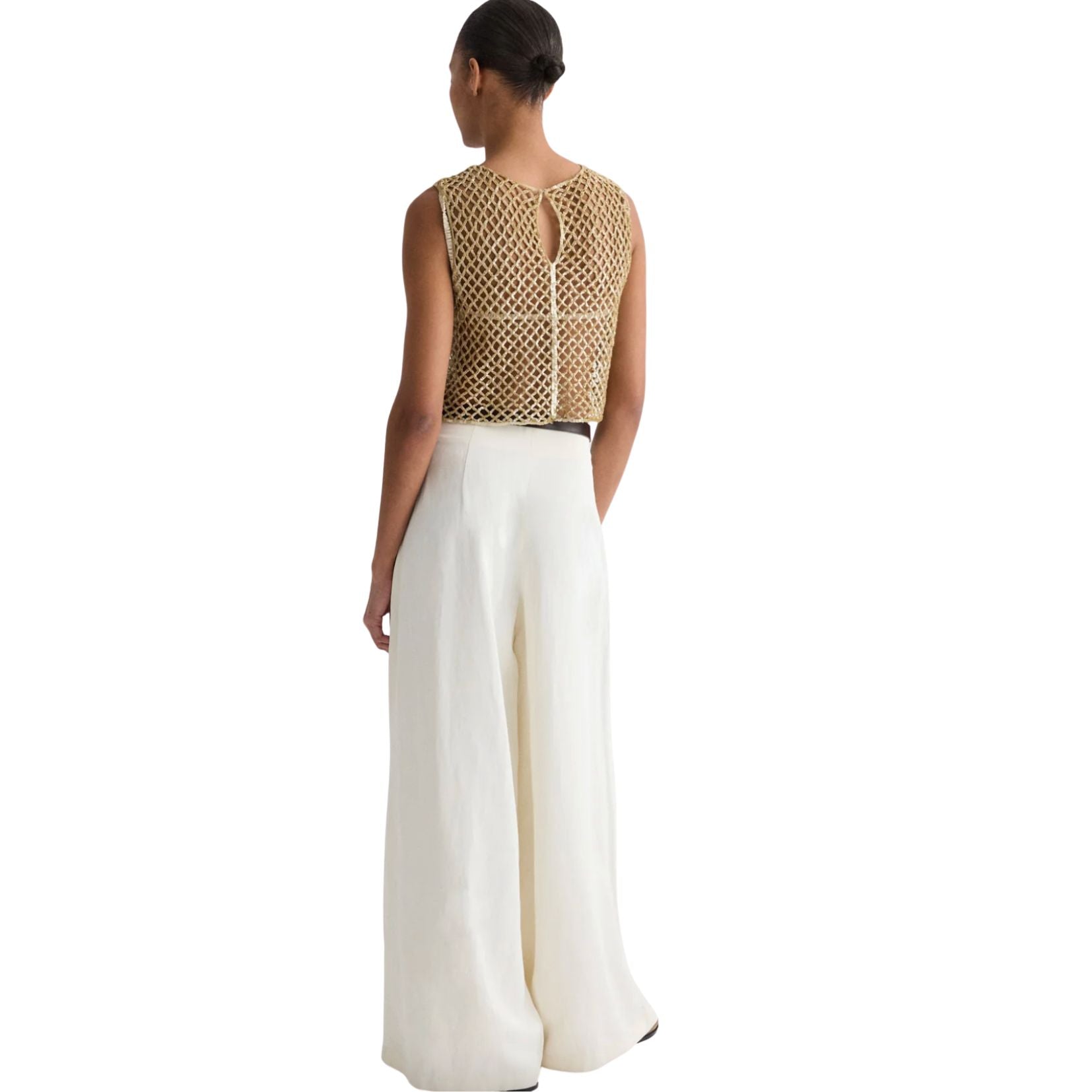 The Sequined Muscle Tee by TWP is a modern statement top crafted in open sequin netting for subtle shimmer and airy texture. Designed with a cropped, sleeveless silhouette, it features a relaxed boxy drape that layers effortlessly while catching the light. A classic crew neckline and delicate keyhole button closure at the back complete the look with a refined finish. The olive grey tone keeps the sparkle understated and versatile for both day and night styling.