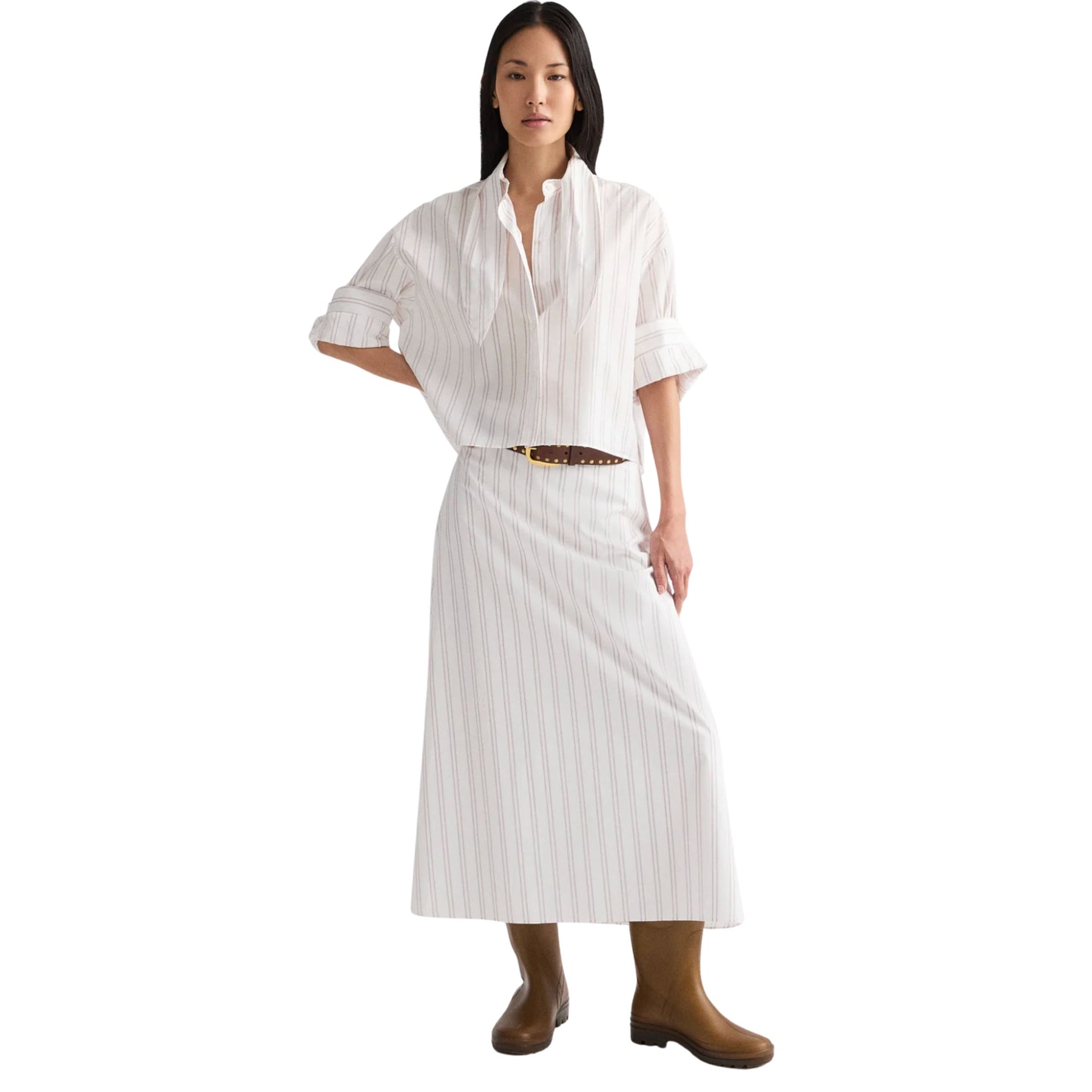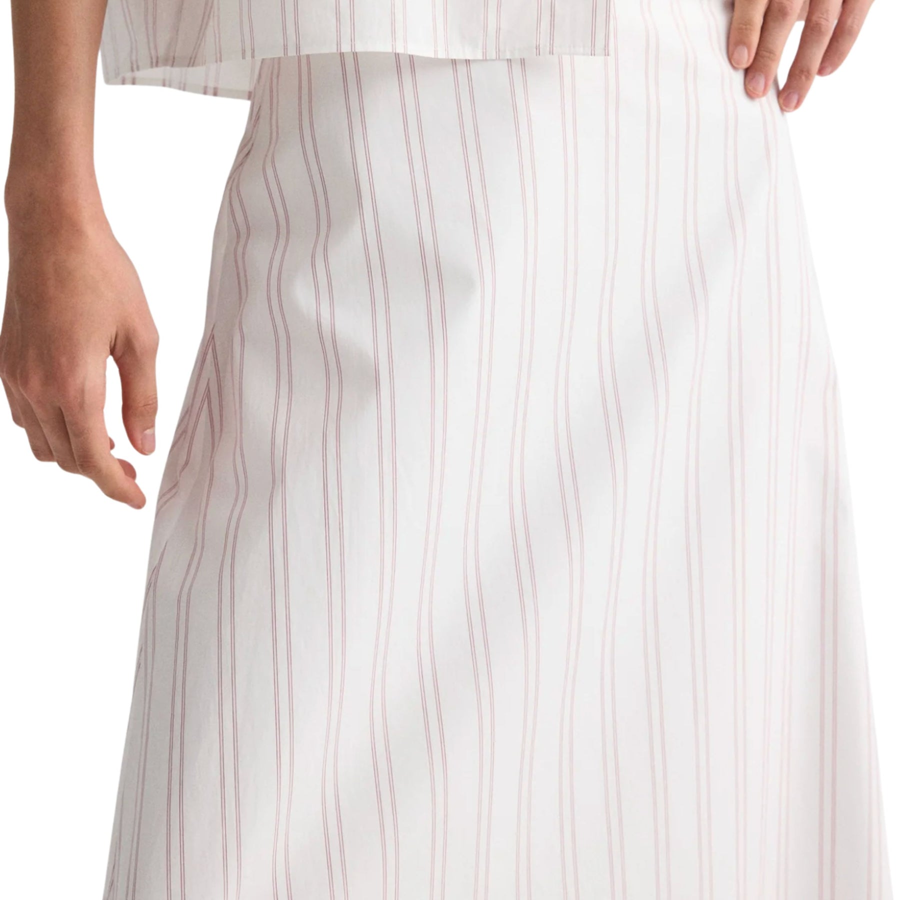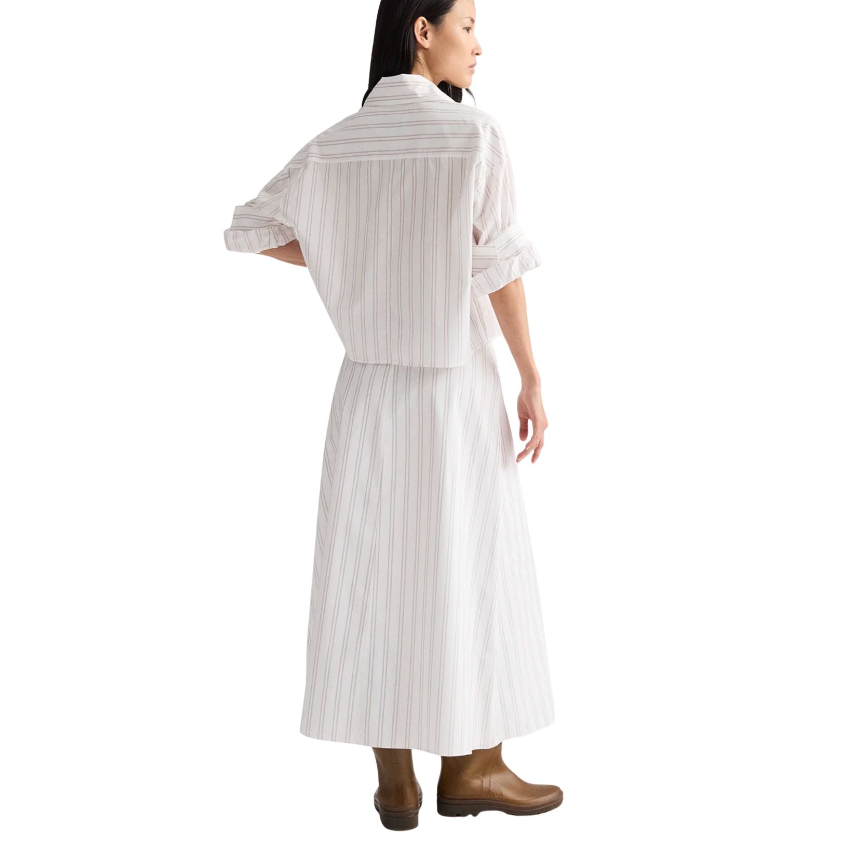 The A-Line Skirt by TWP is a refined wardrobe staple crafted from superfine Italian cotton shirting with a subtle drop-needle double stripe in white and wine. Designed with a flattering mid-rise waist and a fluid midi silhouette, it moves effortlessly while maintaining a crisp, tailored feel. Polished yet easy to wear, this skirt pairs seamlessly with structured shirts or relaxed knits for understated, modern sophistication.