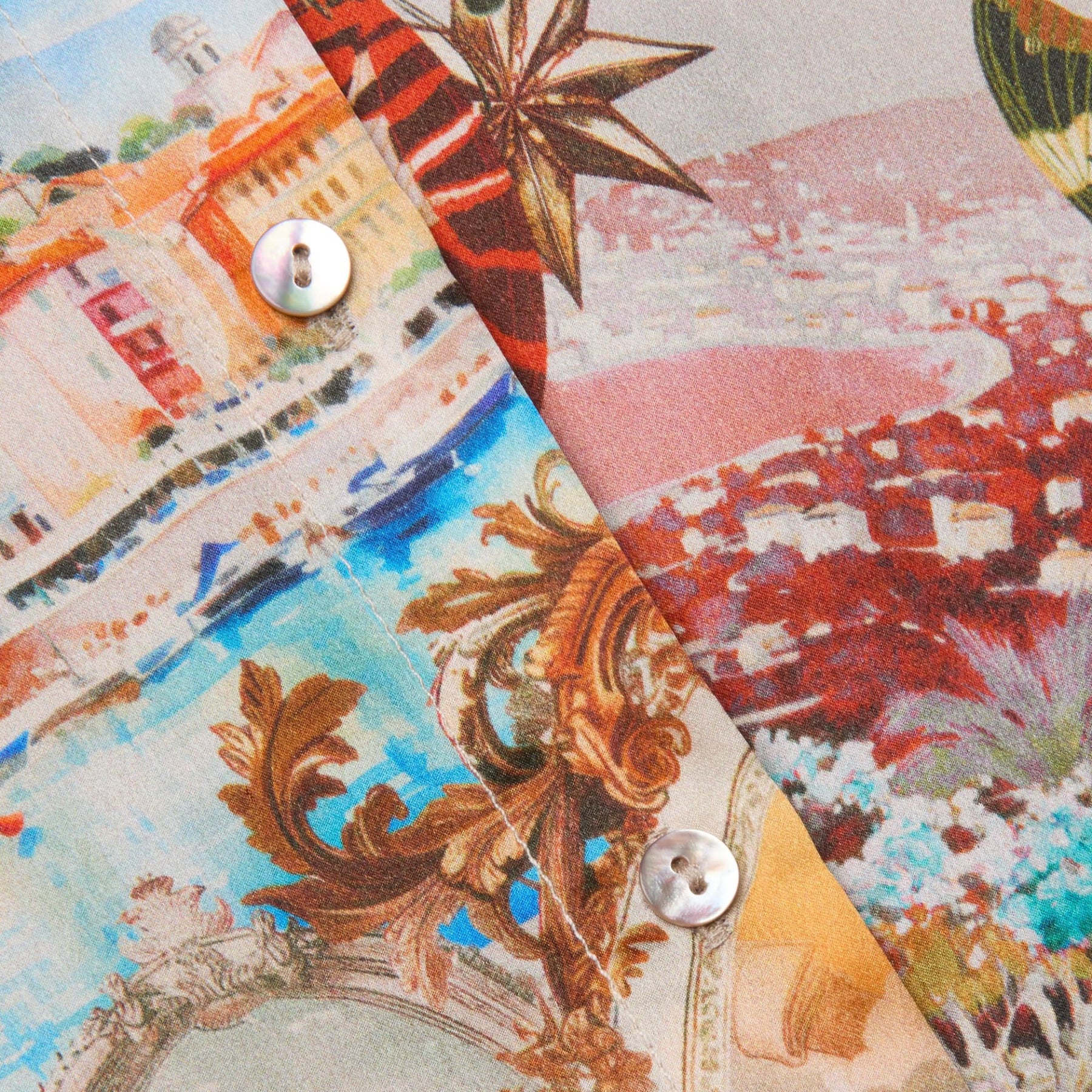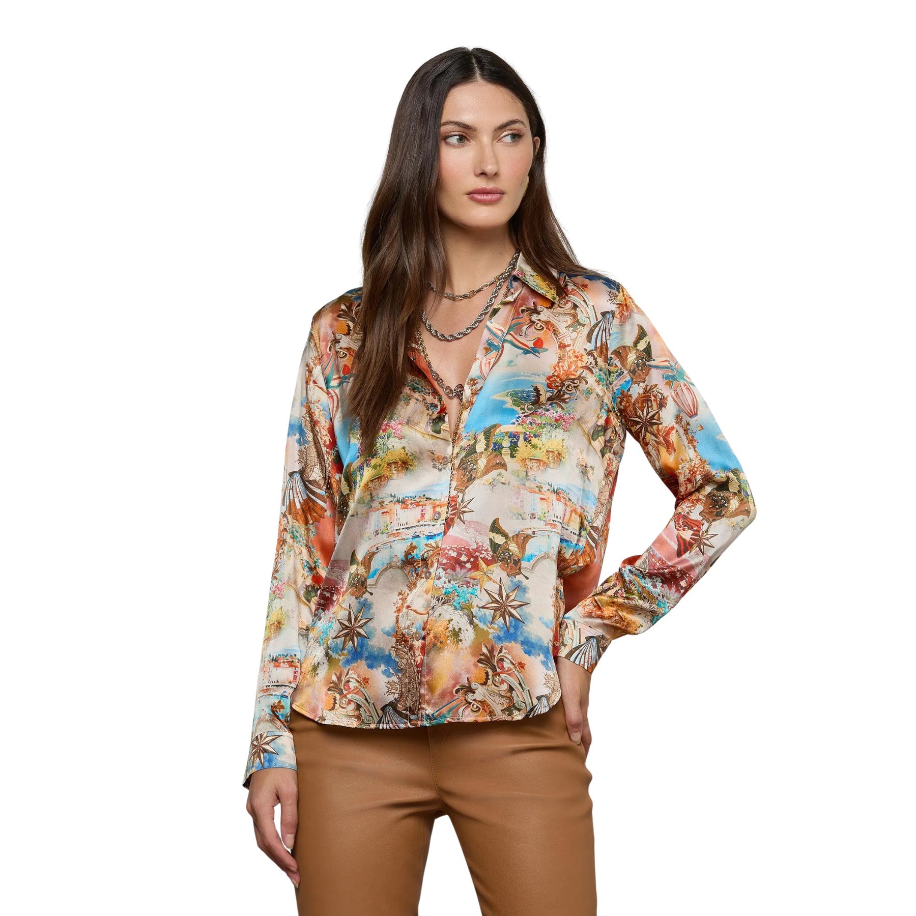 Meet the iconic Tyler Long-Sleeve Blouse, a signature L’AGENCE favorite and a true wardrobe essential. Crafted in luxurious 100% silk charmeuse, this elevated button-down drapes beautifully and feels as smooth as it looks. The vibrant travel collage print adds an artistic, globe-trotting flair—perfect for making a statement whether you’re dressing up denim or pairing it with tailored separates.