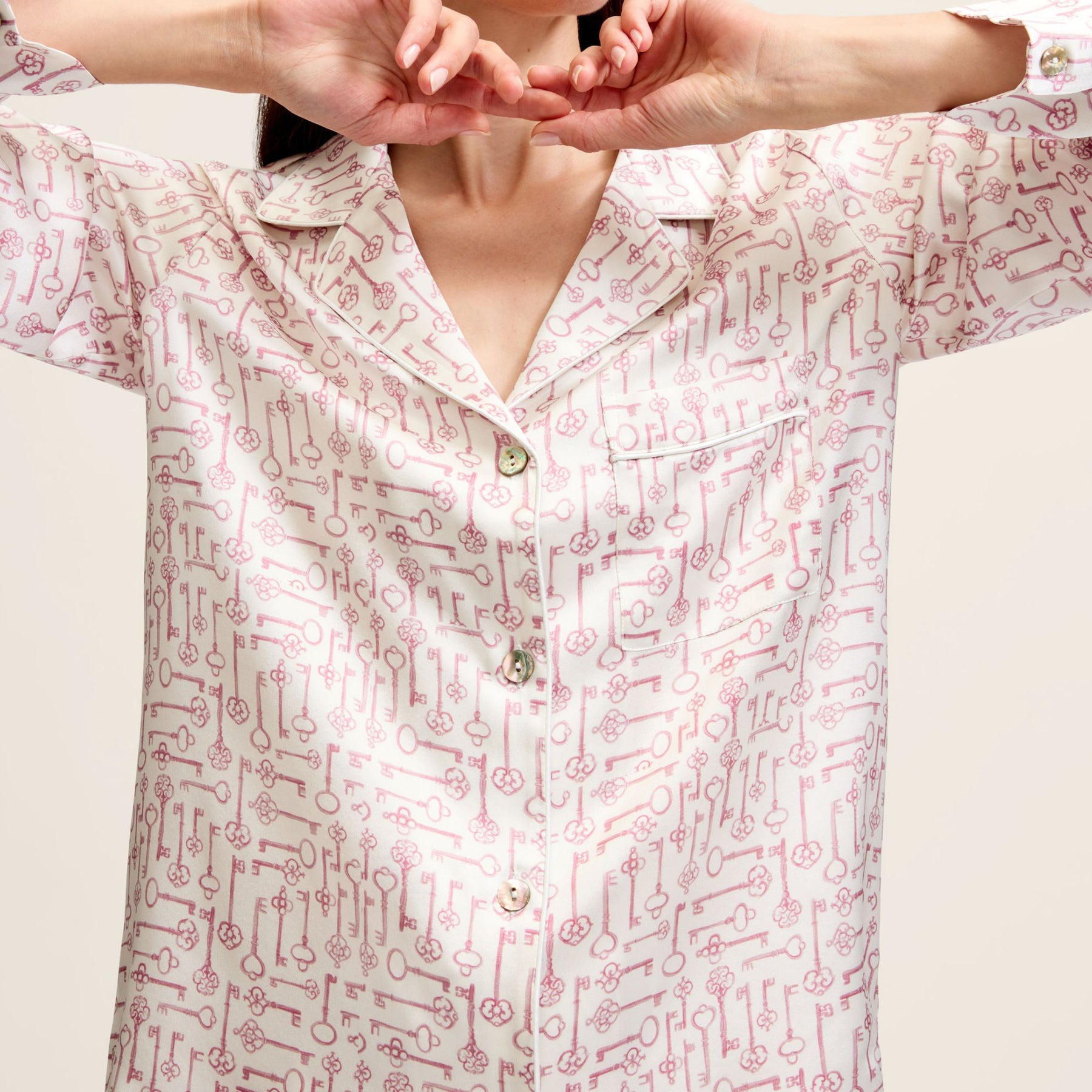 Romantic, refined, and effortlessly luxurious, the Petite Plume Women’s Silk Pajama Set in Key to My Heart is designed to make everyday moments feel special. Crafted from smooth silk and finished with a playful heart-inspired print, this set is as indulgent for lounging as it is beautiful for gifting.