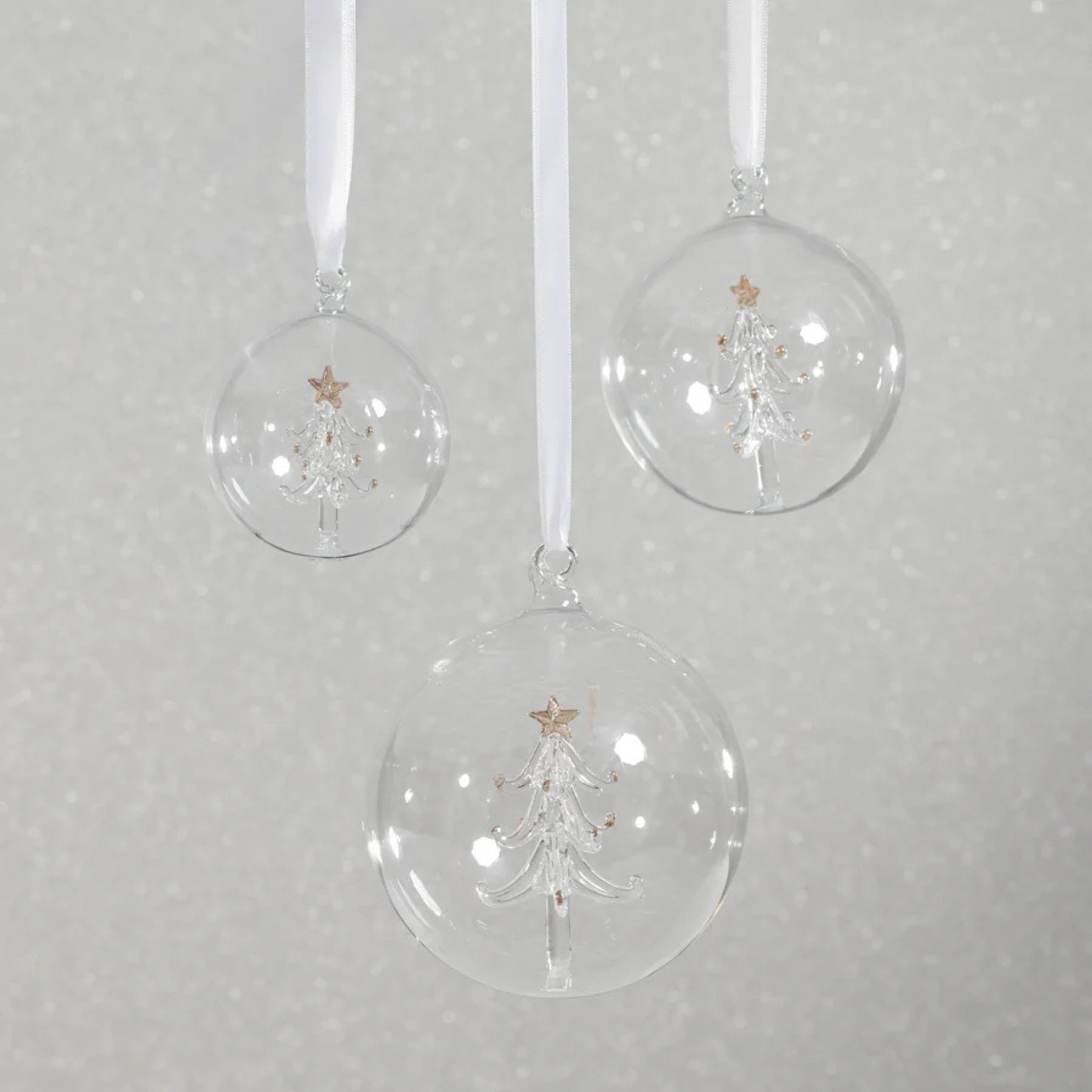 This elegant ornament captures the magic of the holidays in a delicate glass sphere. Inside, a beautifully crafted tree with a golden star and accents creates a festive centerpiece that sparkles with charm. Its clear design adds a touch of sophistication, making it the perfect blend of tradition and modern style.