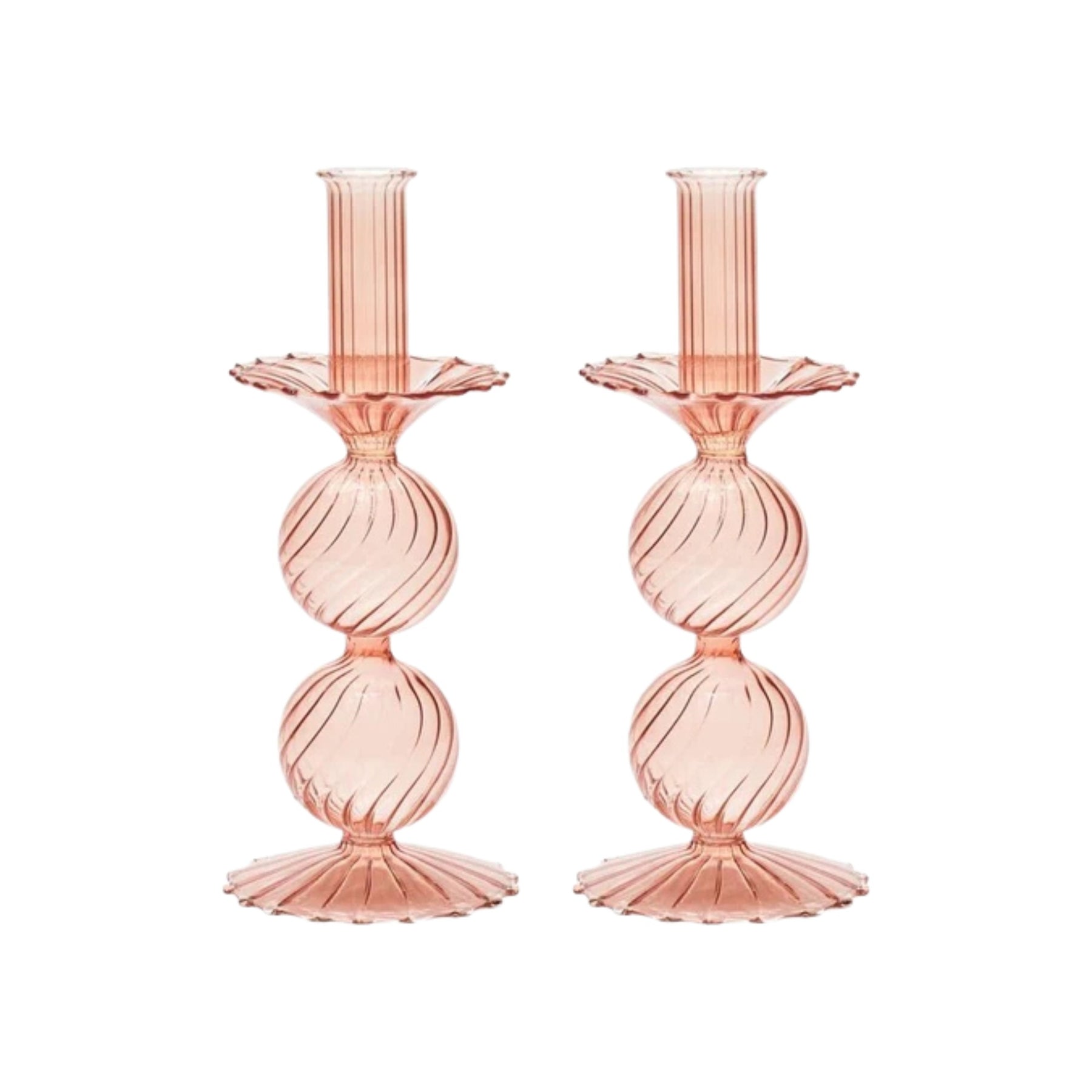 Graceful and sculptural, the Bella Short Candle Holders in Blush by Kim Seybert bring soft luminosity and refined movement to the table. Handblown glass forms two rounded globes rising from a delicate scalloped base, creating a timeless silhouette in a romantic blush hue. Presented as a boxed set of two, these elegant candlesticks add height, glow, and contemporary charm to dining and décor settings alike.