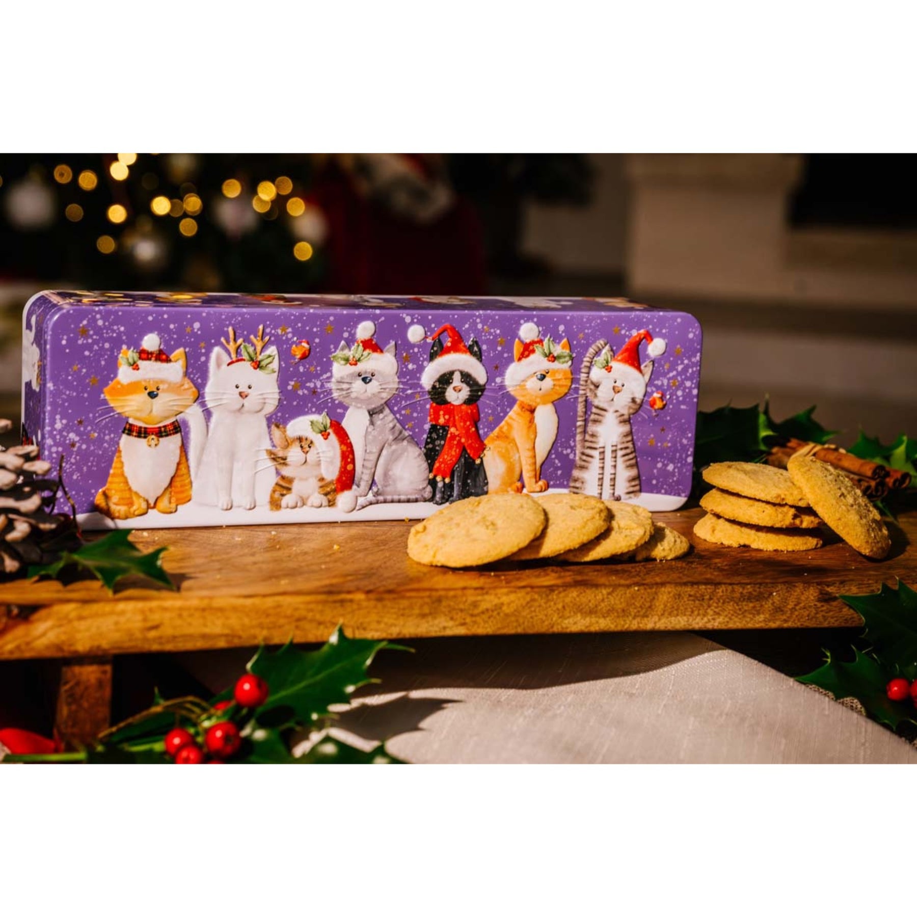 The Cat Tin adds a playful charm to your holiday season with a beautifully embossed design featuring festive cats in cheerful attire. Filled with crunchy stem ginger biscuits, this whimsical tin makes a delightful gift for cat lovers and biscuit enthusiasts alike.