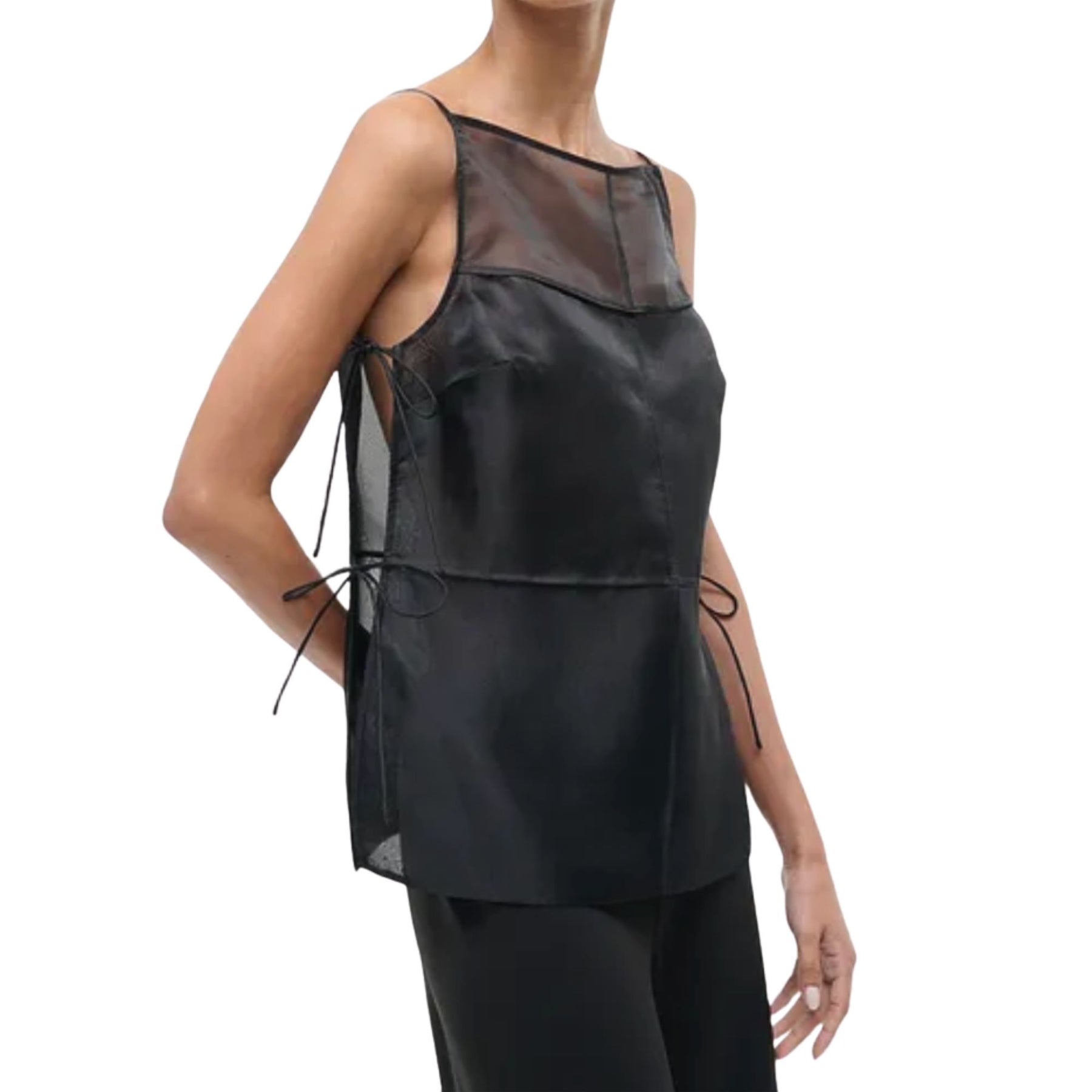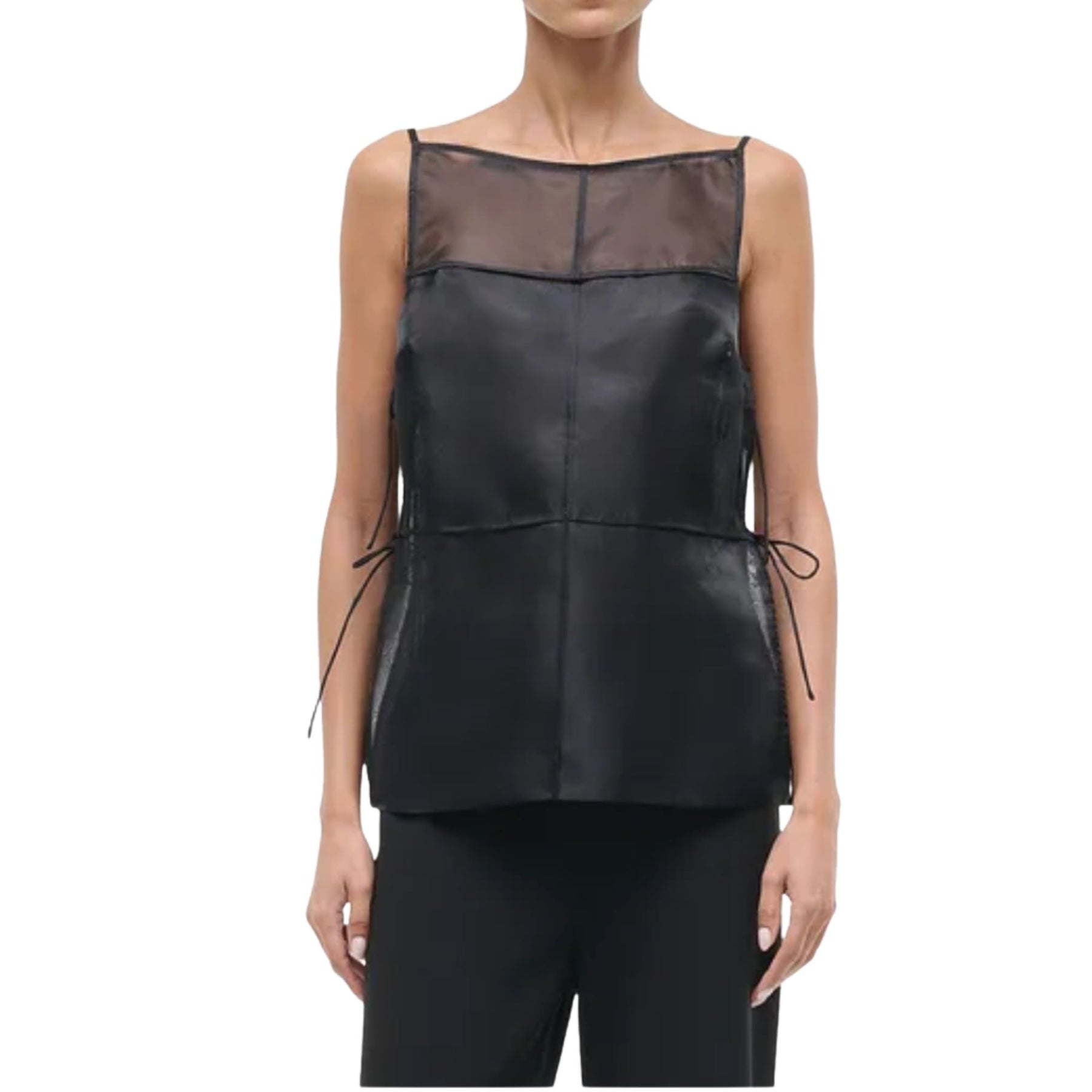 Staud’s Chandler Top is crafted in sheer organza, accented by a delicate mesh inset at the neckline for subtle dimension. Designed with a boxy silhouette and square neckline, it’s finished with self-tie closures at the sides for an understated yet considered detail.
