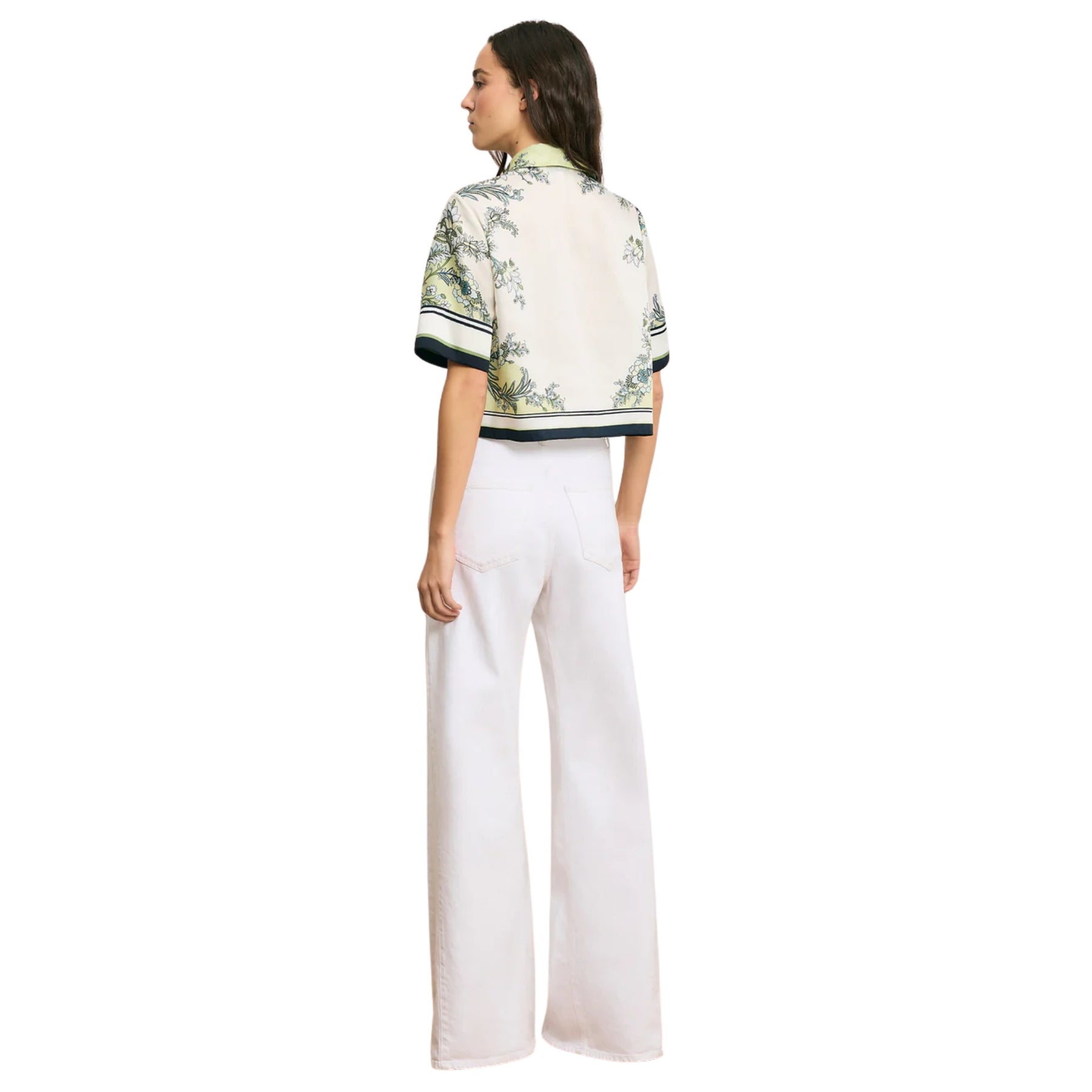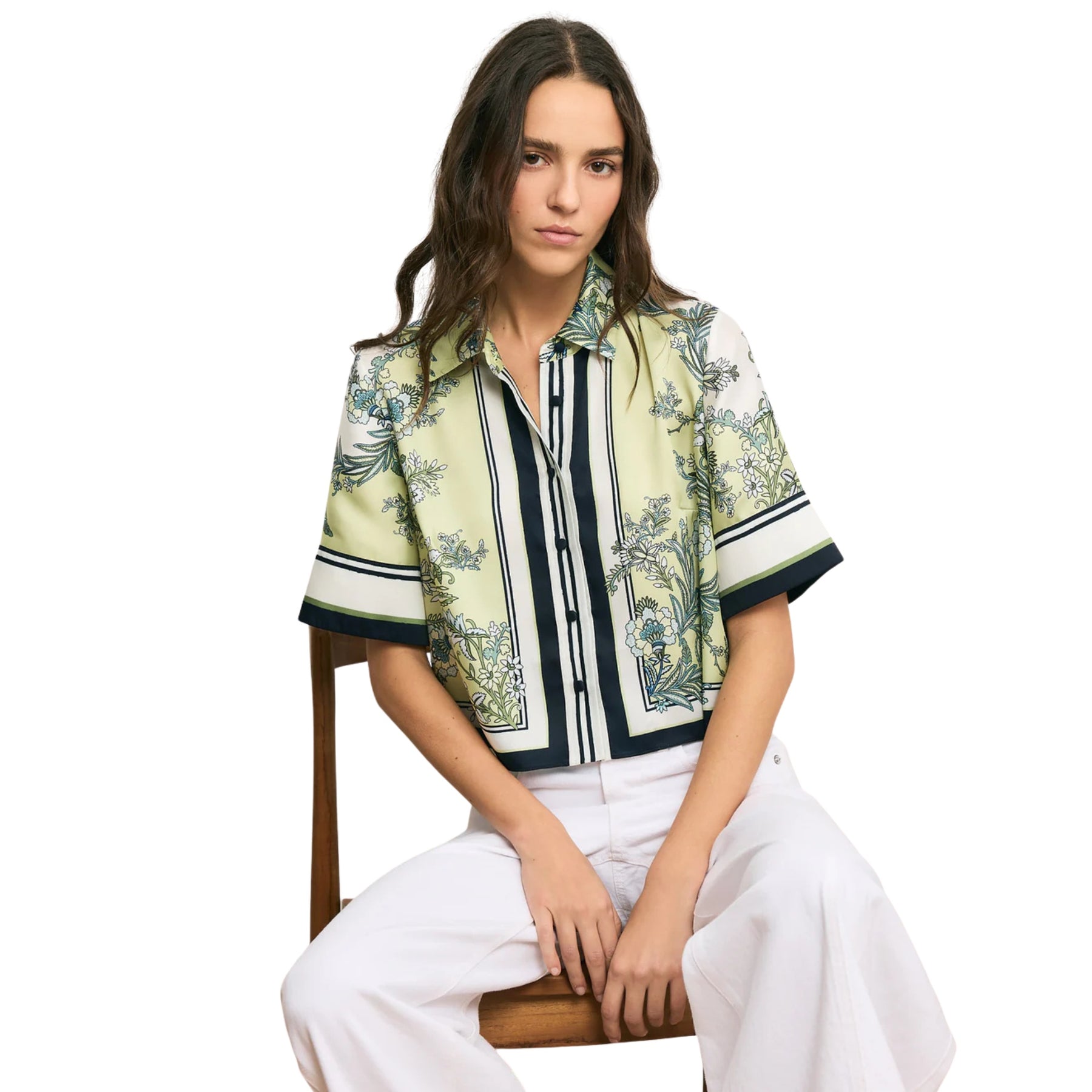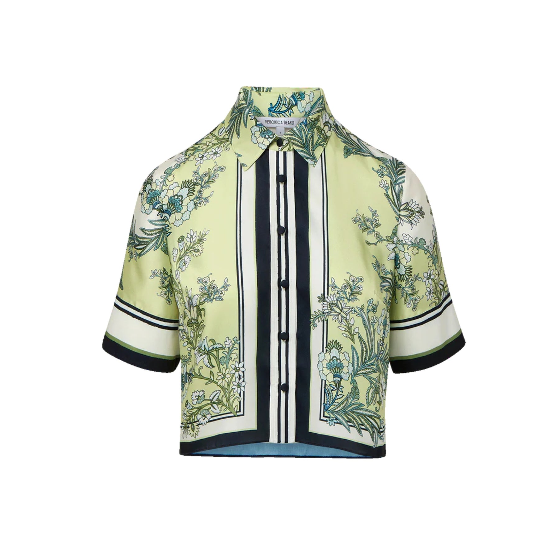 Silky twill brings a polished finish to the Spruce Top by Veronica Beard, where clean tailoring meets an artful botanical print. Designed in a cropped, boxy silhouette, this modern button-down features a scarf-inspired pattern in ivory, pistachio green, and black, framed with graphic black-and-white stripe detailing. Half sleeves add coverage while maintaining an effortless, contemporary feel.