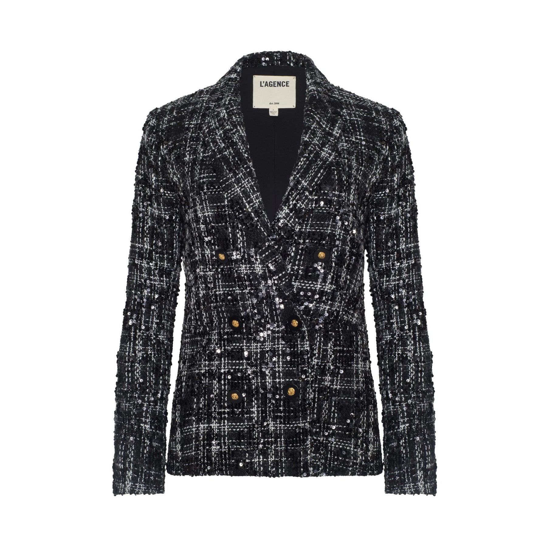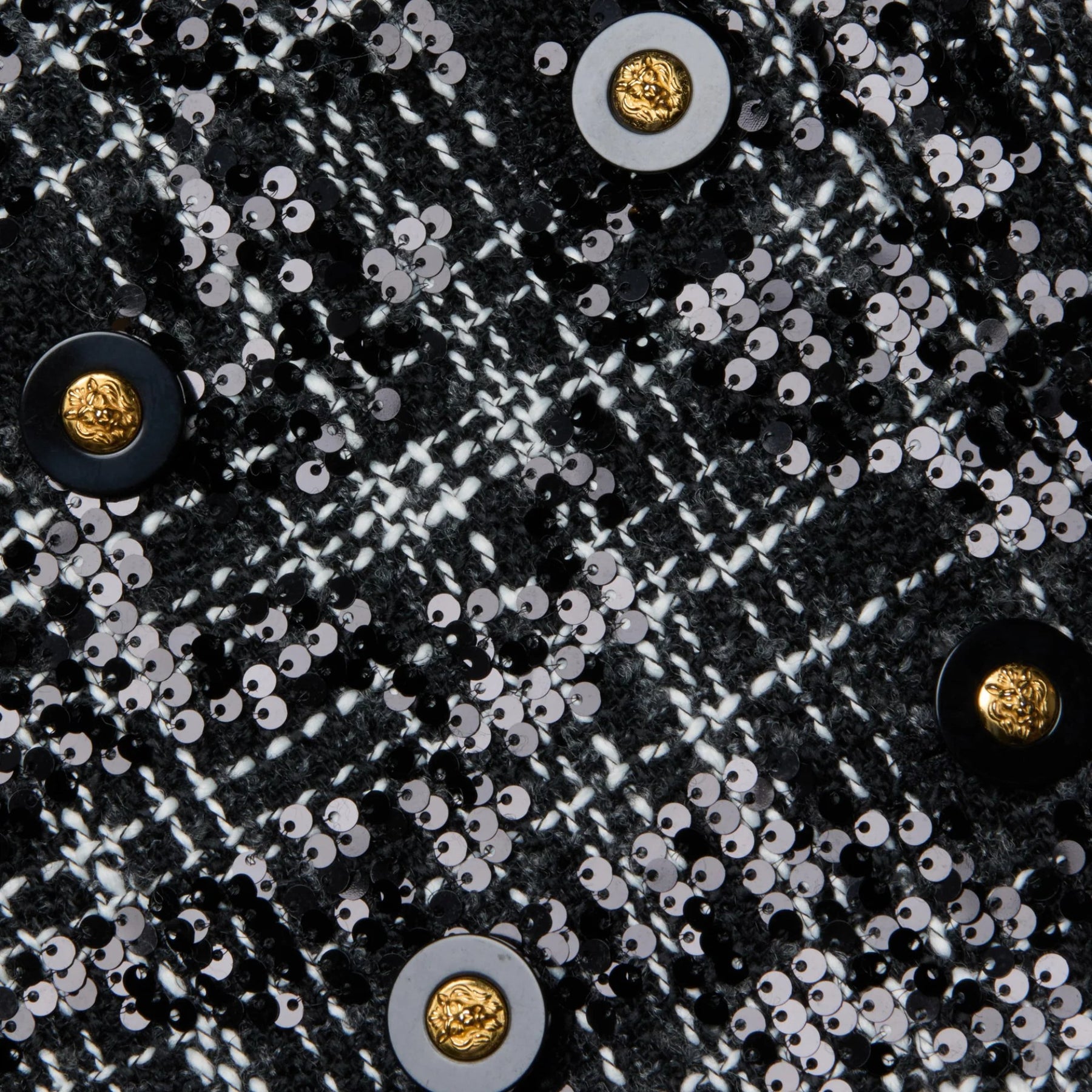 The Colin Double-Breasted Blazer reimagines a timeless silhouette with modern glamour and bold sophistication. Crafted from richly textured tweed woven with black sequins, this statement blazer strikes the perfect balance between structured tailoring and feminine allure. Featuring gold double-breasted buttons, padded shoulders, and sleek welt pockets, it’s designed to make an impact—whether you’re at the office or out for the evening. Pair it with the coordinating pant for a power suit with drama, or style with distressed denim for a chic, off-duty edge.