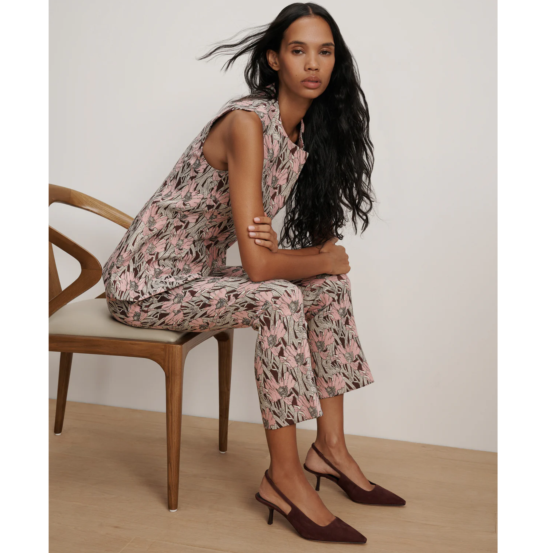 A tailored vest with a sleek, streamlined look. The jewel-neck Jessup is fitted at the waist and gently flares at the hem, finished with a hidden button placket for a clean silhouette. Crafted from a premium tailoring blend, it’s patterned in burgundy and pink florals with subtle metallic threading throughout. Pair with the coordinating Arte pant for a chic matching set, or dress it down with white denim.