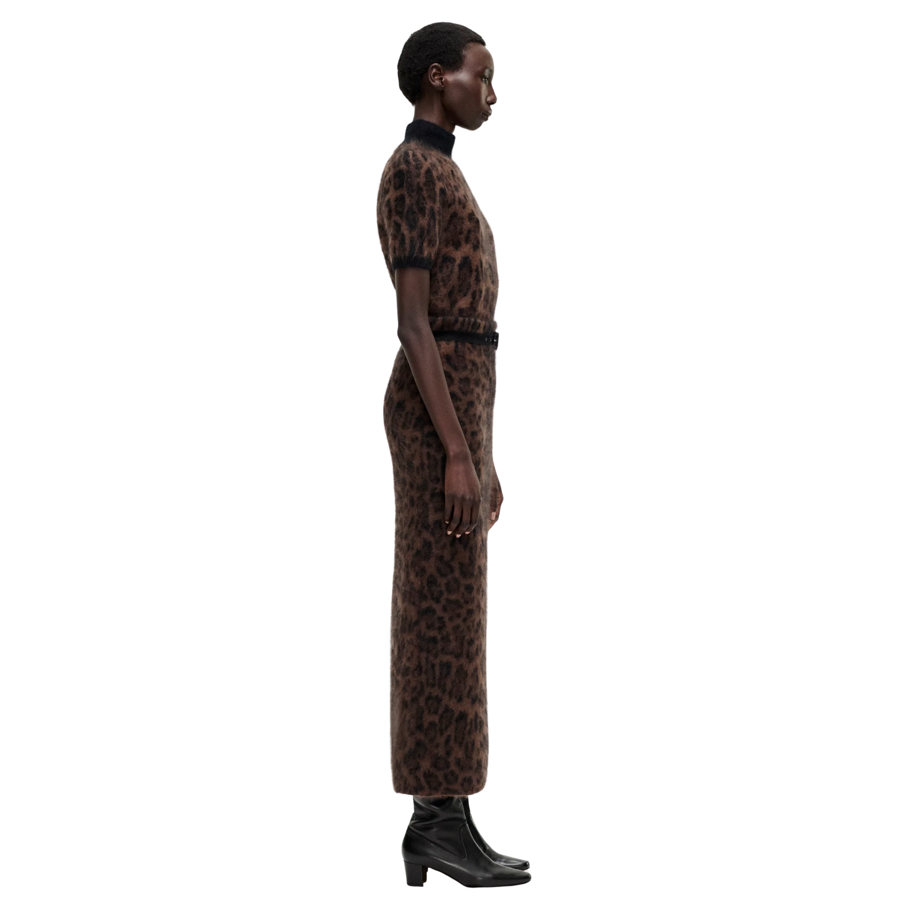 The Levi Skirt is crafted in leopard jacquard and brushed for a luxuriously soft finish. The slim A-line skirt is completed with a knit self-covered belt and center back slit for ease of movement. Pairs effortlessly with the Ari Top in Brushed Leopard for a bold, coordinated look.