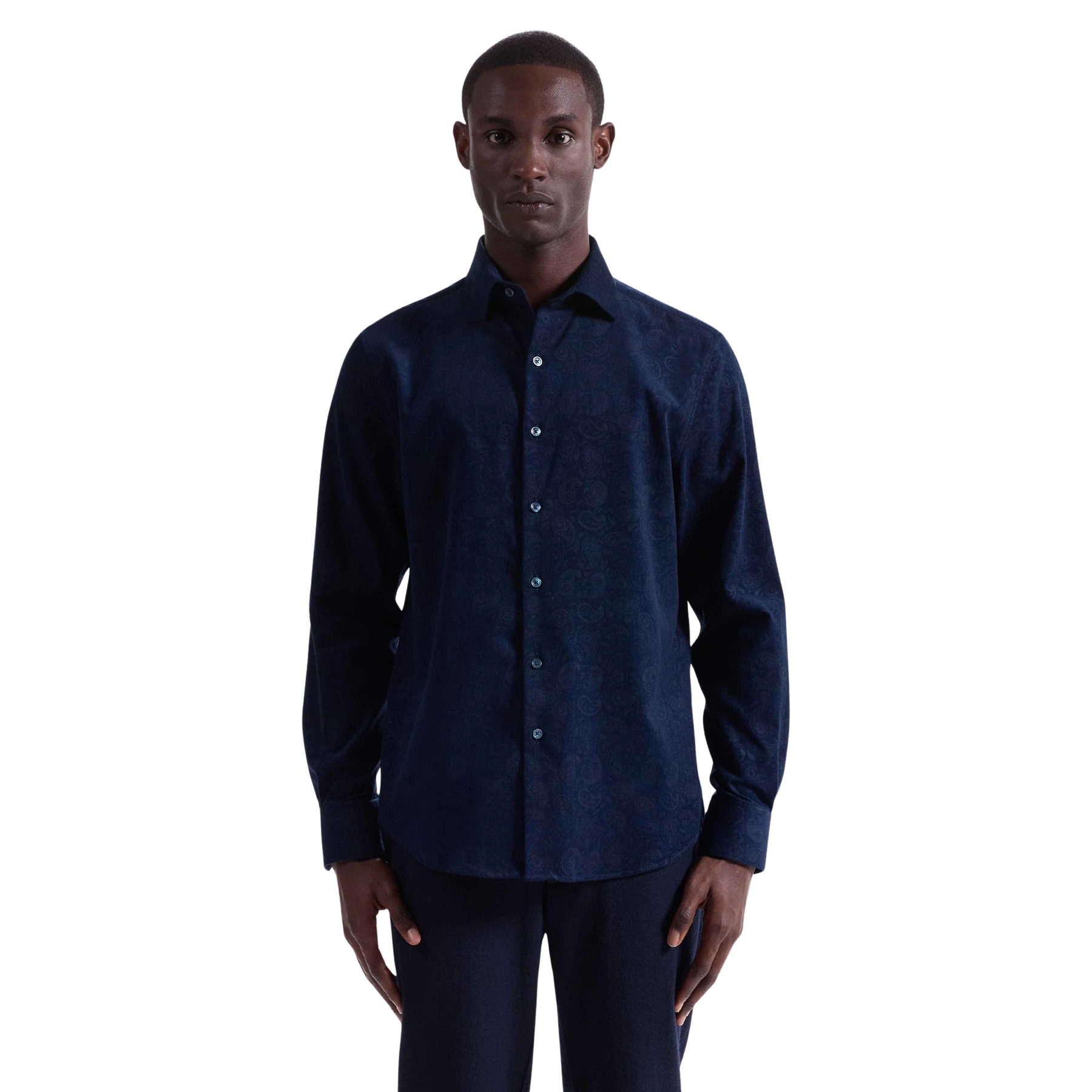 The Axel long-sleeve shirt in paisley print is crafted from premium 100% Italian cotton pinwale corduroy. It features a spread collar, mother-of-pearl buttons, a curved hem that looks great tucked or untucked, and adjustable notched cuffs that also convert for cufflinks. A refined, all-occasion shirt.