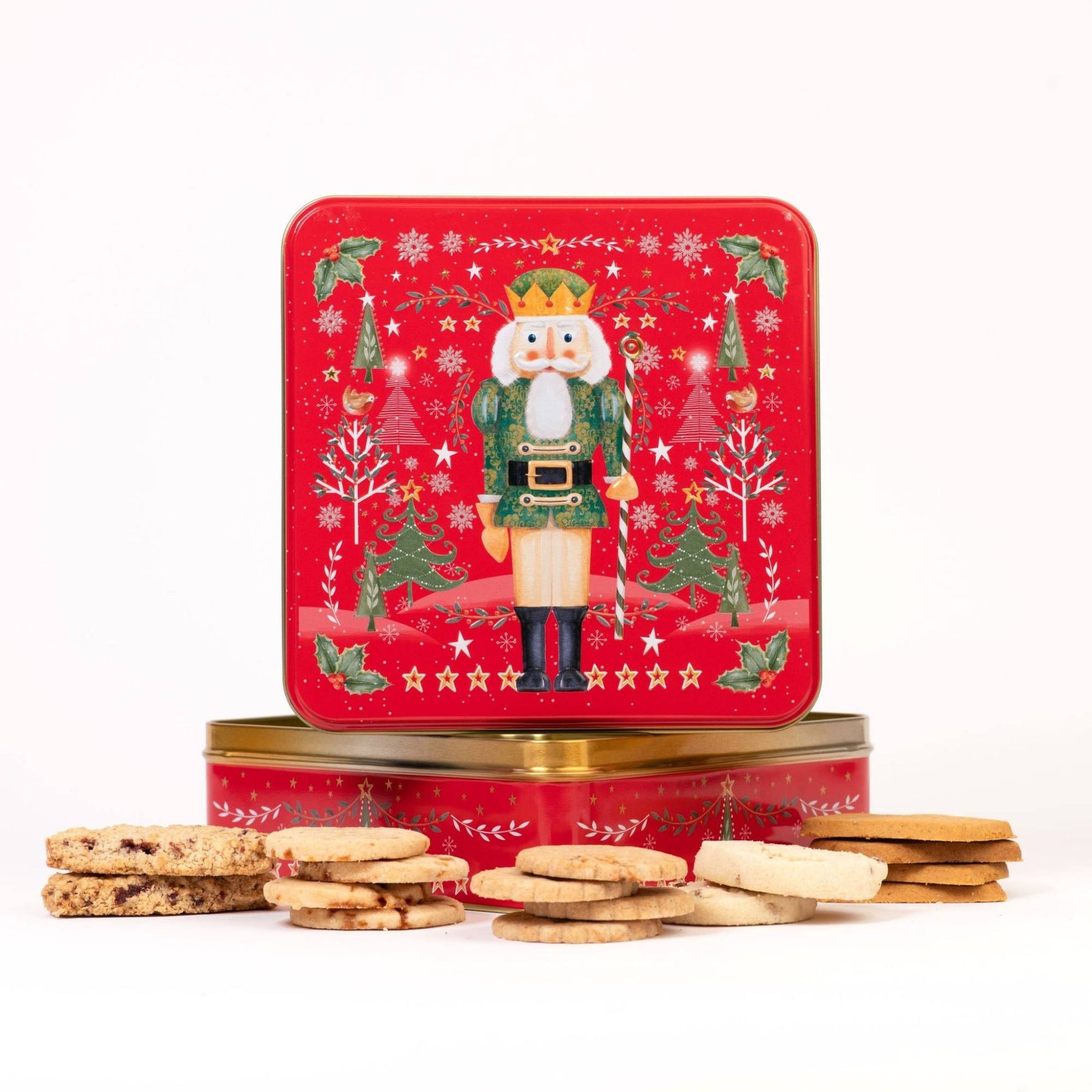 Celebrate the holiday season with our stunning Nutcracker-themed Christmas Biscuit Tin. This large, square tin features a traditional Nutcracker design in classic red and gold colors, making it a stylish addition to any festive décor. Filled with an assortment of traditionally made, hand-packed Christmas biscuits, this tin is the ideal gift for fashion-forward shoppers looking to combine elegance and taste during the holidays.