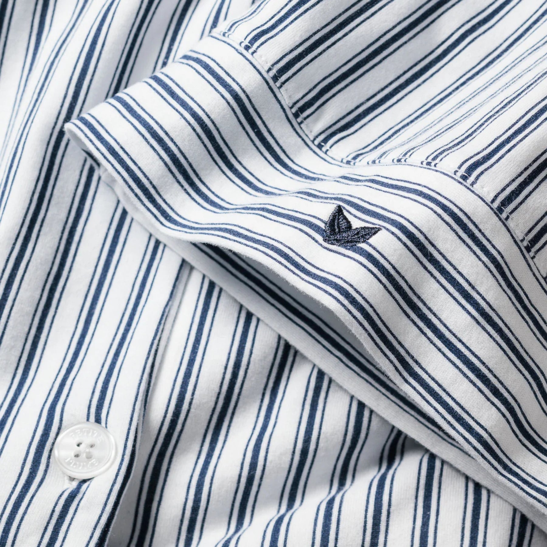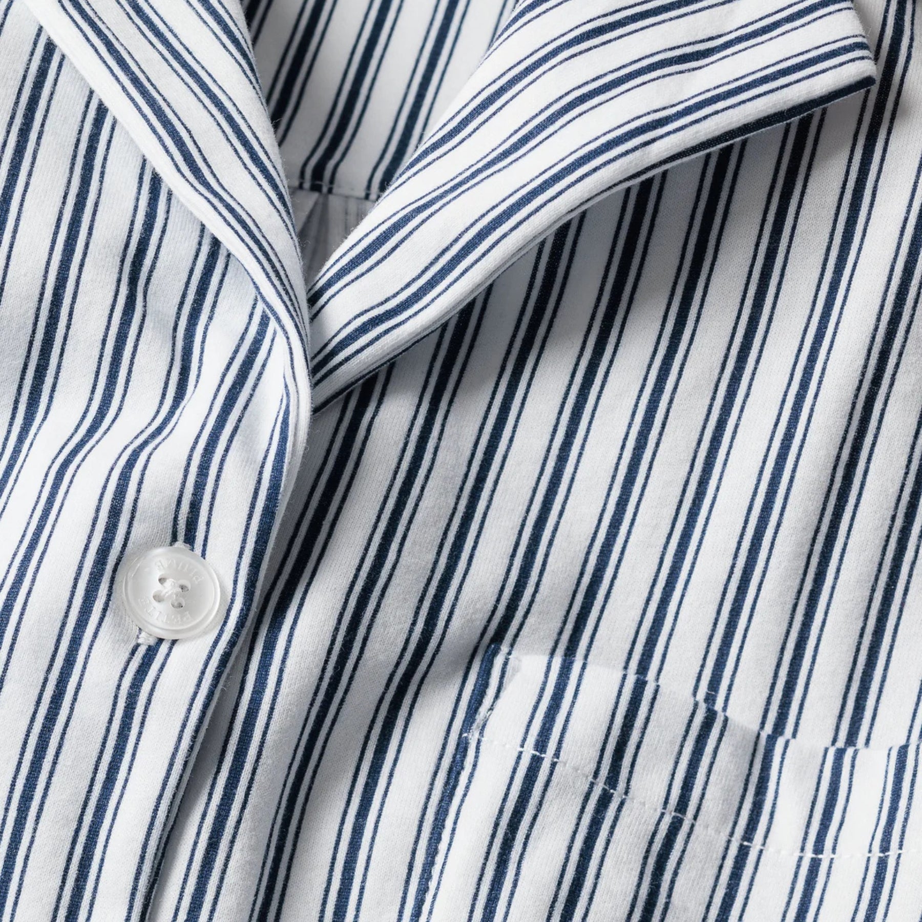 The Olivia Wide Leg Pajama in Navy French Ticking is a luxurious set crafted from 100% Peruvian Pima cotton, designed for both comfort and timeless elegance. Featuring thoughtful tailoring with three-quarter length sleeves and wide-leg pants, this set offers a refined silhouette and a buttery-soft feel that lasts. The yarn-dyed cotton ensures durability, resisting fading, pilling, and wrinkling for enduring quality.