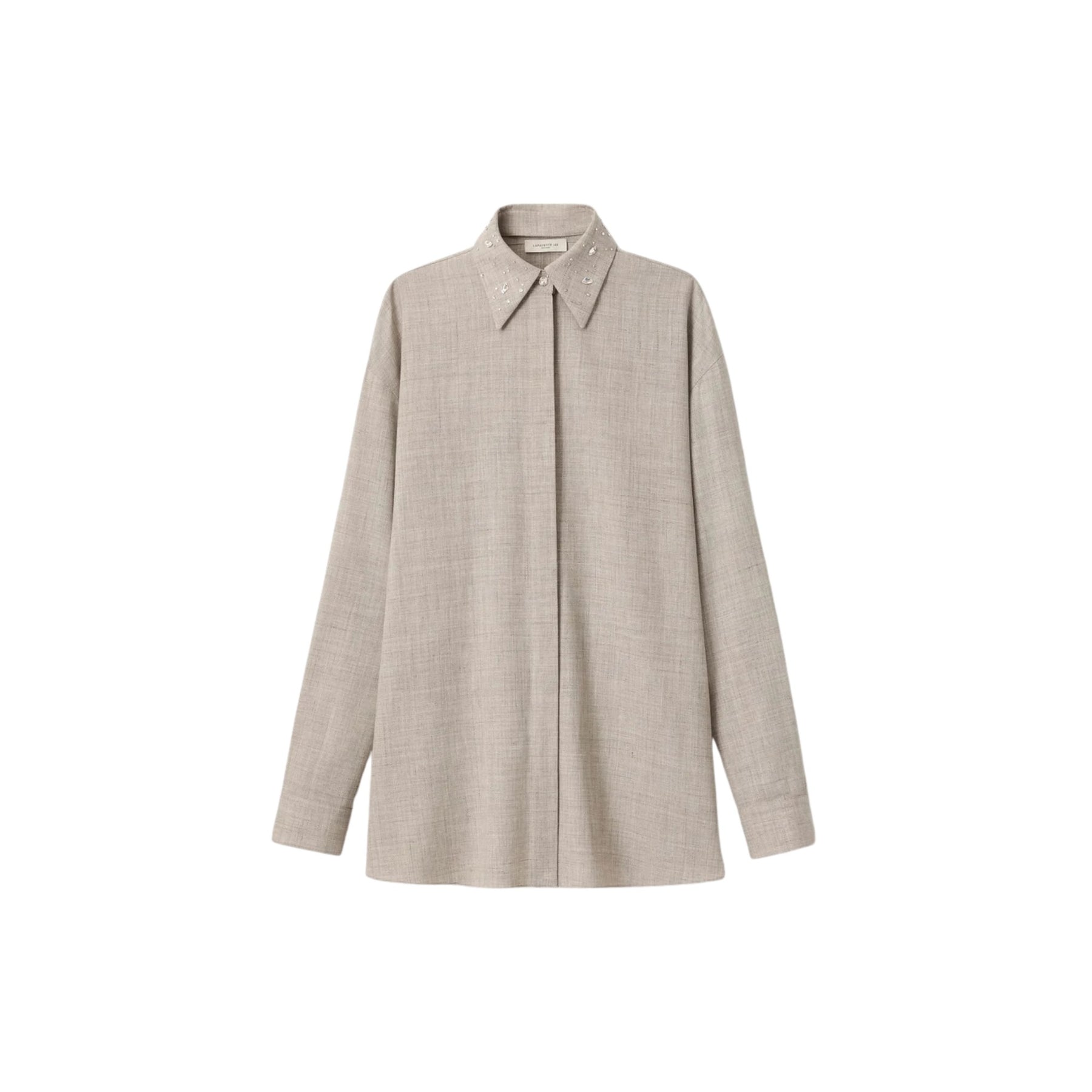 The Oversized Shirt with Crystal Beaded Collar is a versatile, elevated essential—wear it with tailoring, denim, or leather to move seamlessly from desk to dinner with just a hint of sparkle.