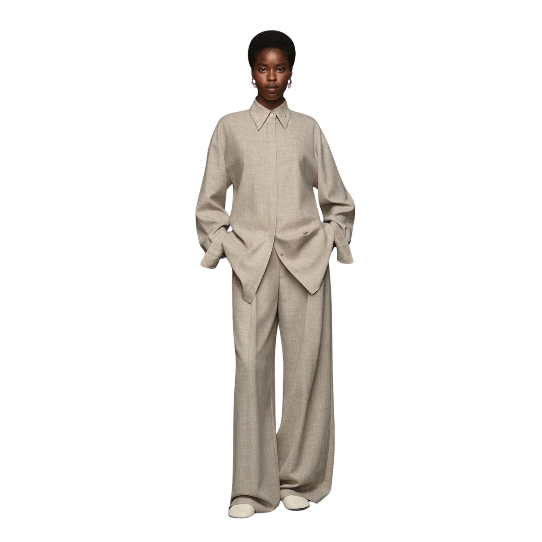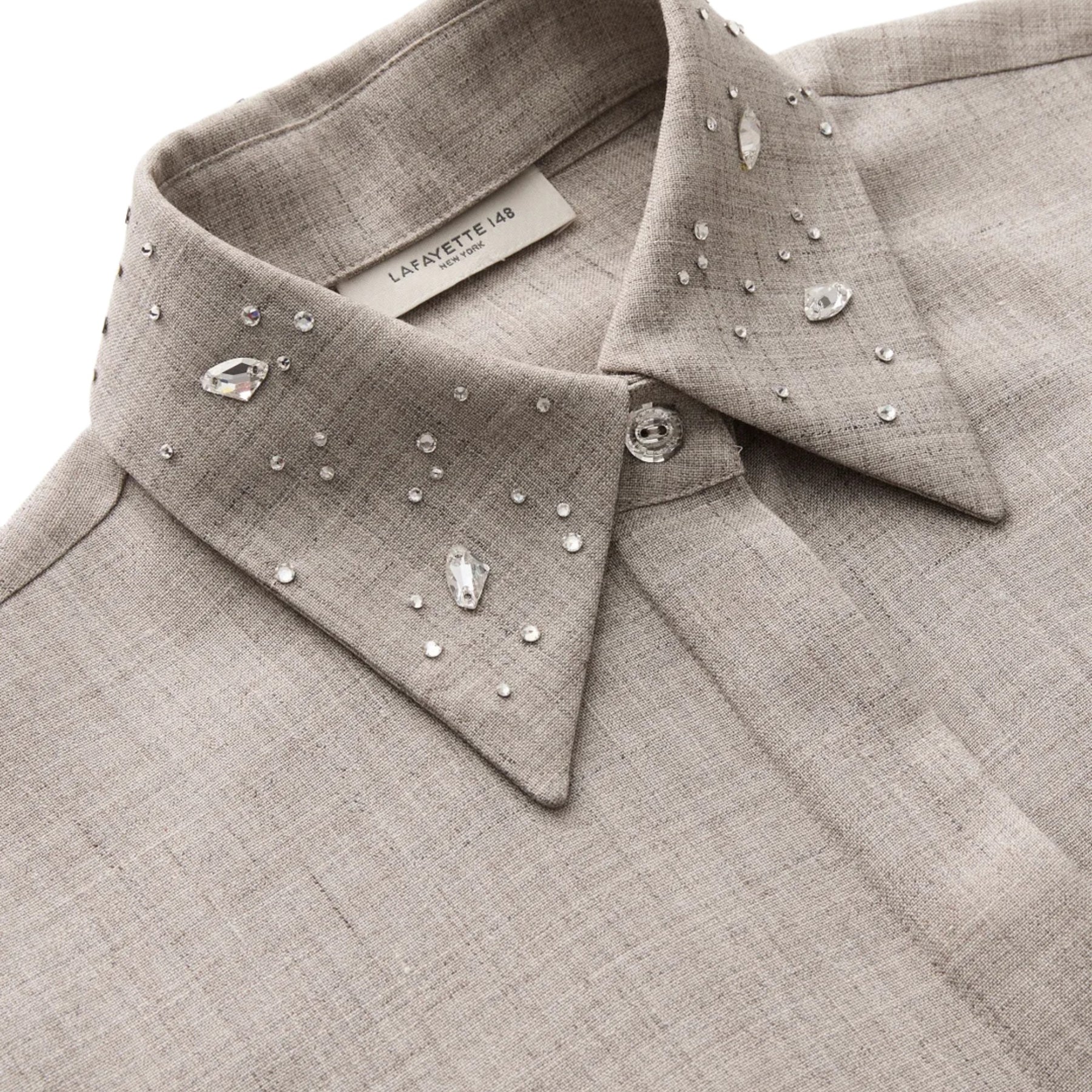 The Oversized Shirt with Crystal Beaded Collar is a polished wardrobe staple with a modern twist. Cut in a perfected oversized silhouette with dropped shoulders and an elongated hem, this button-front shirt drapes effortlessly for a relaxed yet refined look. The detachable collar, embellished with crystals by Swarovski, adds subtle shine for evenings or events and reveals a clean banded neckline when removed—giving you two looks in one. Crafted from a prized Italian warm-weather fabric blend of breathable Merino wool, lustrous silk, and crisp linen, it feels lightweight and luxurious all day.