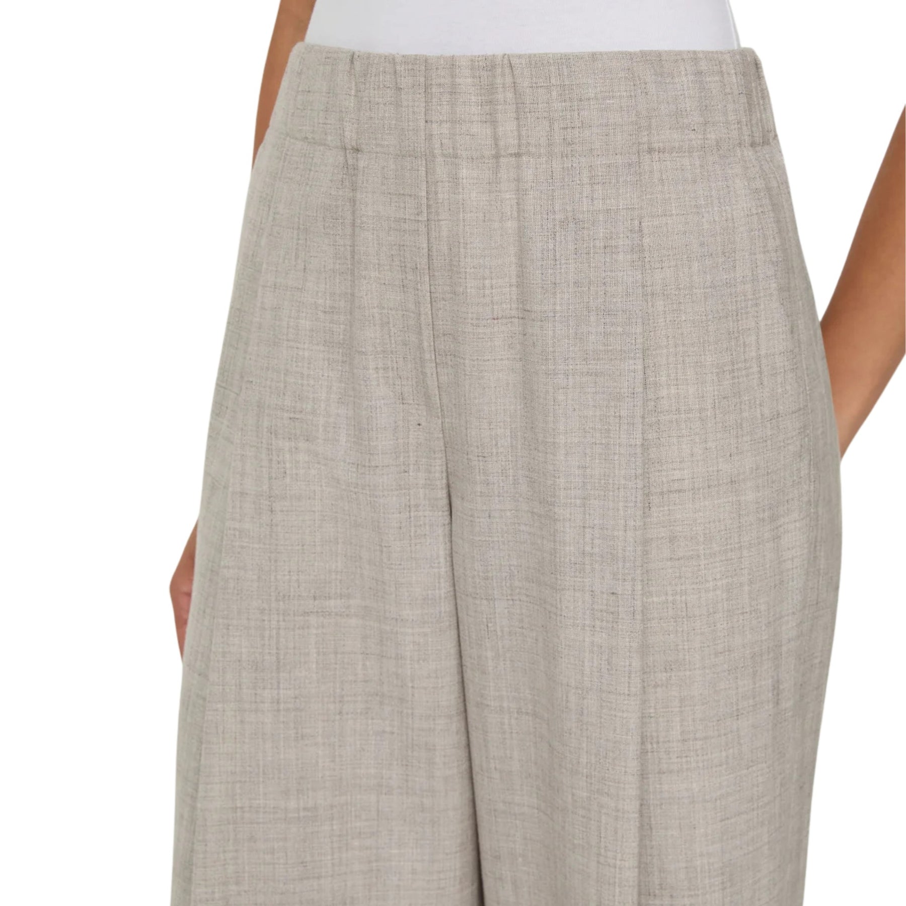 The Wide Leg Astor Pleat Front Pant offers effortless polish with the comfort of a pull-on style. Cut full through the thigh with a flowing wide leg, these trousers skim the body and drape beautifully. The elasticized waistband keeps the fit easy, while front pleats and slant pockets add tailored detail. Crafted in Italy from a luxurious warm-weather blend of wool, silk, and linen, they’re perfect for work, travel, and elevated everyday dressing.